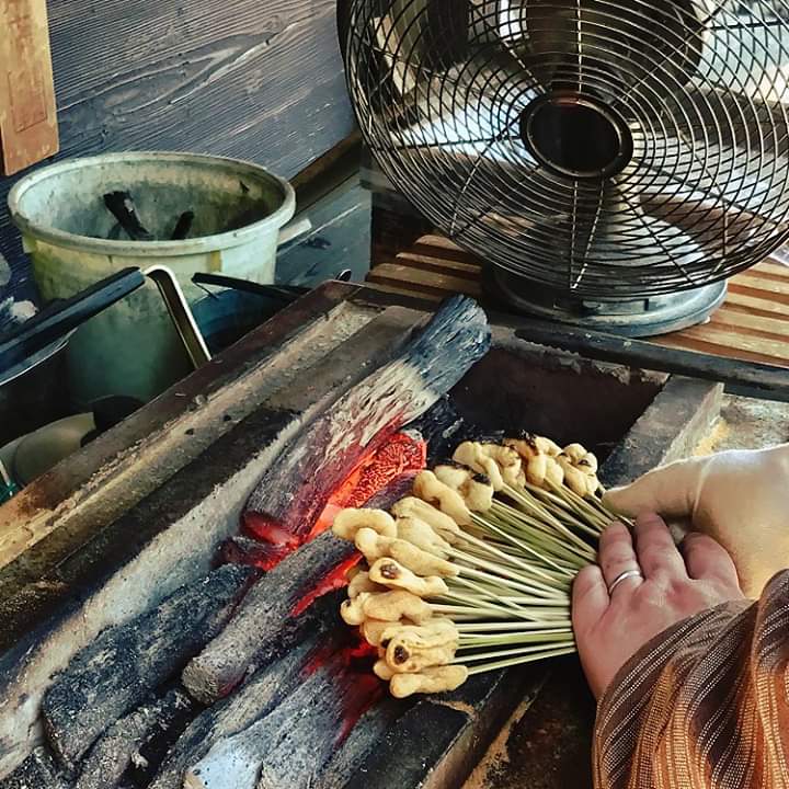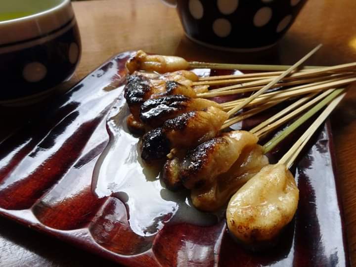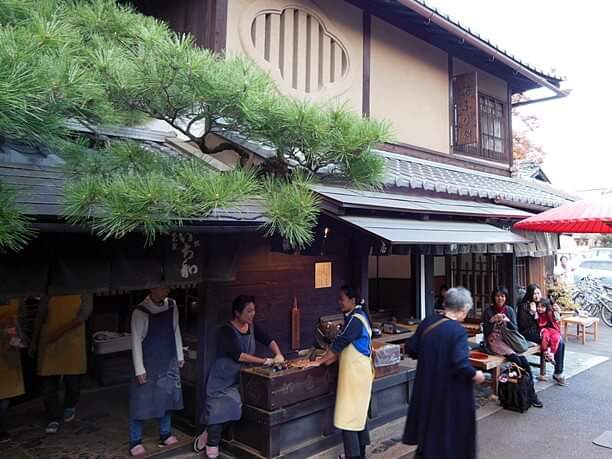 这家店店招牌是一口大小的炙烧丸子。 使用竹签将炙烧丸子沾裹黄豆粉后 ,店家会在烤过的表面烧成香气四溢时在摆放置盘中 ,另外点缀甘甜的白味噌作淋酱。 店内的员工清一色都是女性 ,制作炙烧丸子的店家都是作为女性的工作场所之一。