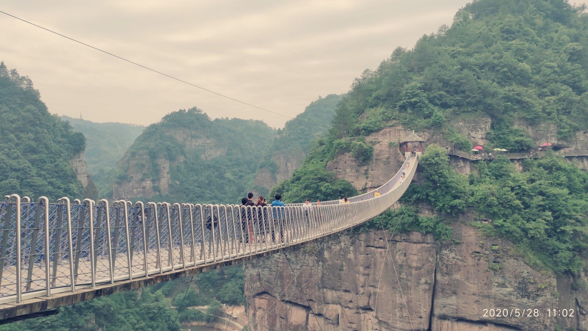 网友2020-06-23飞龙栈道,建在新昌十九峰景区台头山和老穿岩景区的悬崖峭壁上飞龙栈道,建在新昌十九峰景区台头山和老穿岩景区的悬崖峭壁上。总长3200多米,高度150米,由古木栈道、玻璃栈道、飞龙天桥组成,其中玻璃栈道长128米,玻璃观景台长4.5米,飞龙天桥长138米。