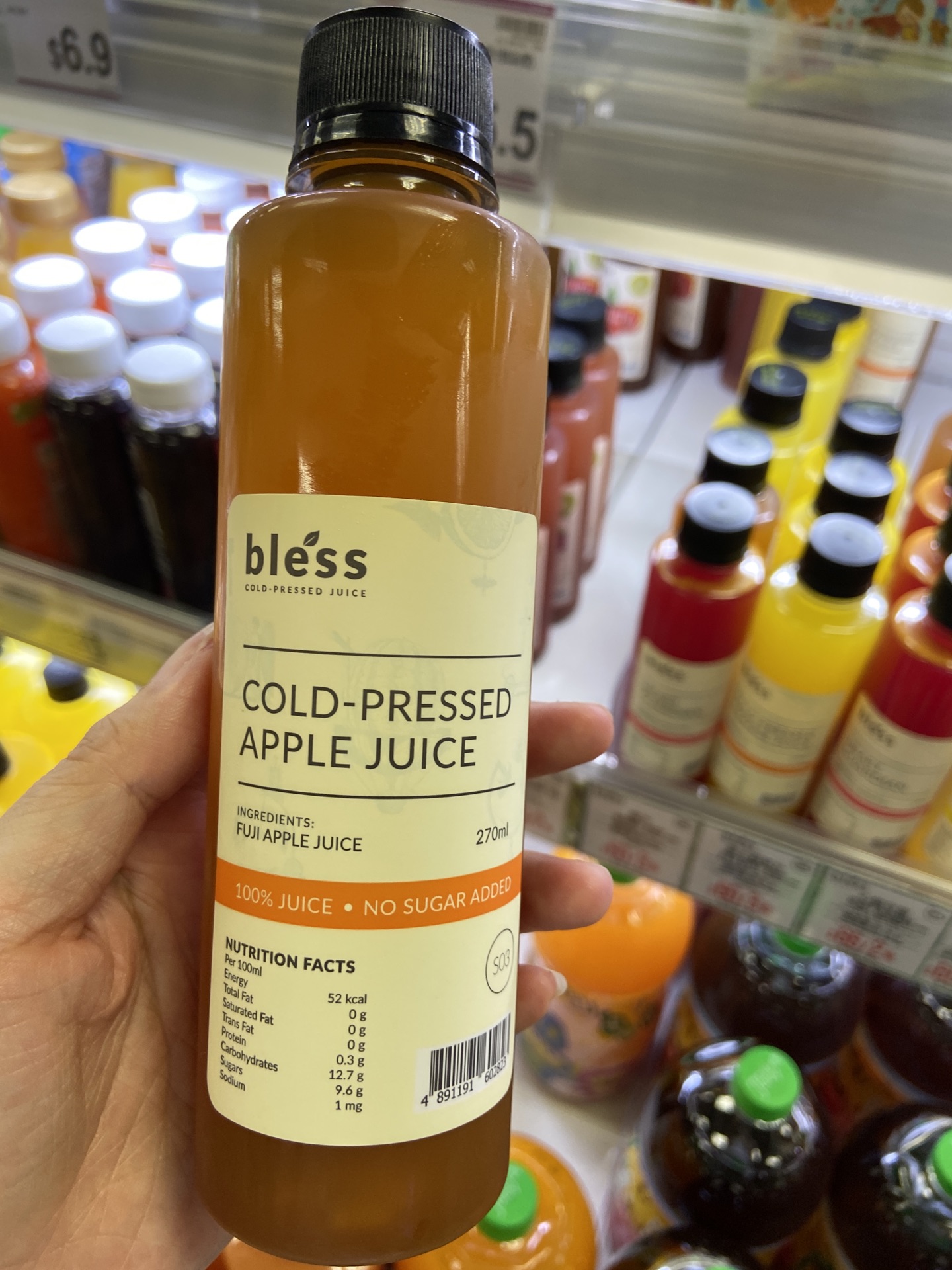 Bless的饮料,在橱柜里摆成一排的时候五彩缤纷的,看上去真的很好看。小瓶的22块钱,大瓶的1000毫升是56块钱。小瓶子看起来细细长长的,颜值也很高,但是拿起来却发现别有“小心思”。看正面这就是一个正常的圆柱体的瓶子,但是看侧面这个圆柱却是被削去了大概四分之一,所以实际上的容量显然就不像看正面看起来的那么多。所以买270毫升的小瓶要比1000毫升的大瓶要不划算很多。
