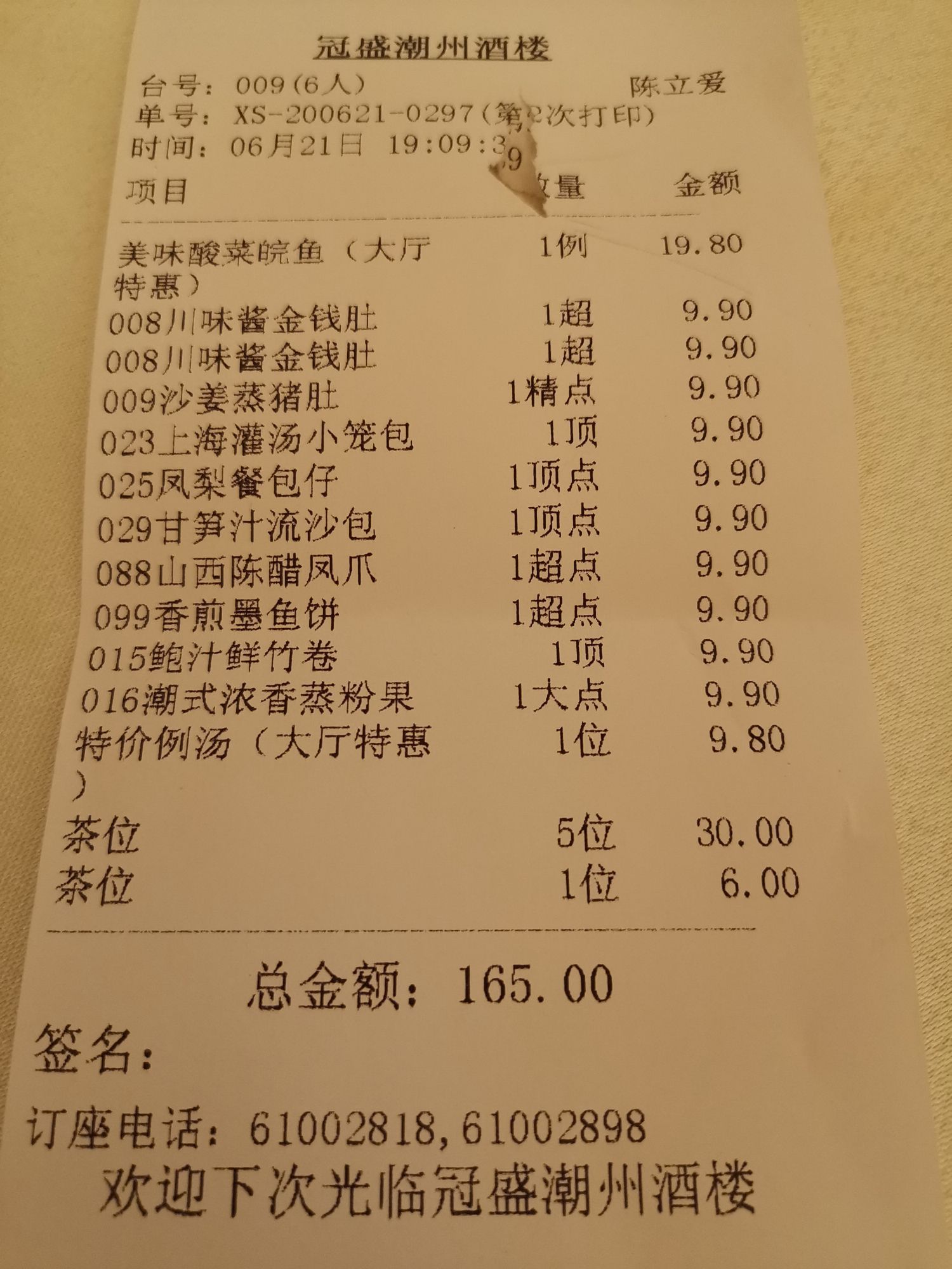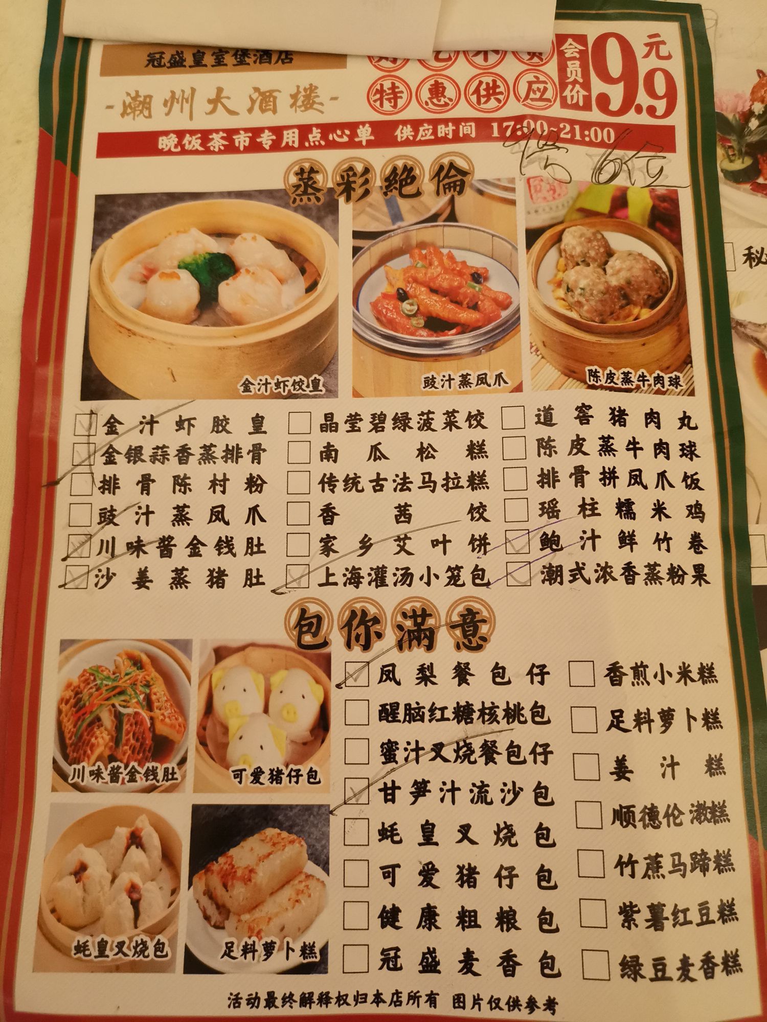听说“冠盛潮州酒楼”的特价优惠延续下去,就和家人又去吃了一顿,那里是全天茶市开放的,晚餐也可以吃茶点,全部特价9.9元,还有不少特价菜,19.8元、28.8元,等等,其实也是挺实惠的,所以点了一个19.8元的“|美味酸菜鲩鱼^”,其它的茶点看来看去,感觉虽然便宜,但好吃的精品并不多,都是晚市特定的菜单,跟早茶午市差别挺大,好像只有一个“|沙姜蒸猪肚^”是最贵的“精点”,其它大多是“顶点”、“超点”,那下次还是白天来吃好一点吧。