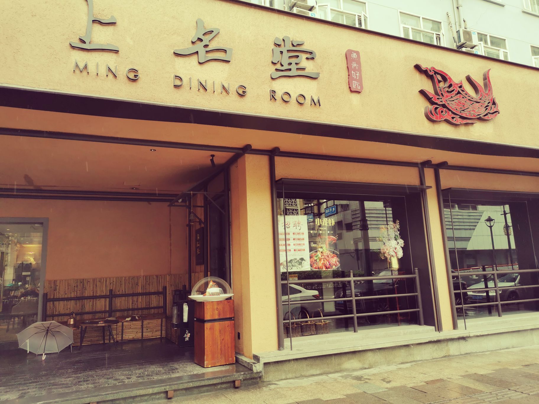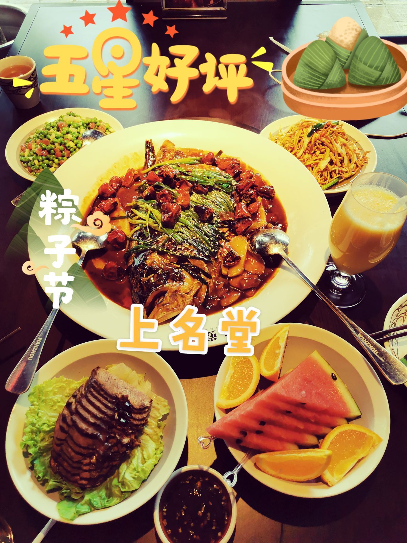 店名:上名堂鱼头好吃店 地址:体育场路30号 交通:地铁二号线建国北路站 营业时间:10:30-21:00 人均消费:113元 [薄荷]环境: 端午佳节,陪姑姑烫完发,姑姑爱吃鱼,就迫不及待带她,来以鱼头闻名的上名堂打卡了。 上名堂,杭州知名老字号美发连锁店-爱情故事,推出的杭帮菜餐饮品牌,美发美食原来可以无缝对接,跨界创意思维,融合商业新世界。 体育场路30号,门面并不起眼,旁边就是爱情故事以及员工食堂。店门口的剁椒鱼头模具,醒目热烈,直奔主题。 进入店内,却是一派江南雅致风情,黑白复古情怀。刀茅巷、宝善桥、千岛湖鱼头,牌匾名字老杭州耳熟能详。黑白老照片斗笠,“春来发几枝”,从屋顶黛瓦穿过。老杭州的文化底蕴,深藏于条条小巷。 空间开阔,邻窗而坐,阳光明媚,心情舒畅。 正是时候,感受上名堂的“大有名堂”。 [服务铃]服务: 烫完头发赶到店里,已经是下午时段。虽然空无一人,坚持全天营业,让我们很是感动。 服务员本来在休息,立马招待我们入住、倒茶、上菜、送水果,热情主动地帮我们分鱼头。服务态度,彬彬有礼,很是满意。 [糖果]菜品: |葱焖鱼头^上名堂的招牌千岛湖鱼头最有名堂!一大盘鱼头端上来,震惊比我脸都大!红烧鱼头,乍眼一看,热烈火辣。其实是葱段和辣椒覆盖表面装饰,味道一点都不辣。火候不偏不倚,赤油浓酱,滴滴入味,肉质新鲜,细嫩多汁。薄皮年糕,蘸着卤儿,咸香软糯,小小惊艳。 |五香牛肉^肉质紧实,蘸些酱料,入口果然“五香”的下酒菜。 |原味小炒^韭黄、肉丝、香干等,杭州家常小炒,刀工很细致,切得“发如丝”。入口初时香气四溢,而后感受微辣和咸香。只吃菜有些油腻,不过很适合下饭的一道本土小炒。 |香肠炒甜豆^甜豆翠绿嫣然,嫩滑清甜,与茭白、香肠丁儿一起小炒,清新解腻,夏意十足。 |玉米汁^新鲜鲜榨,自然恬淡,营养满杯。 |水果拼盘^赠送,西瓜柠檬,娇艳欲滴,酸甜多汁。 上名堂,爱情故事的鱼头名堂。 体育场,把杭州往事低吟浅唱。