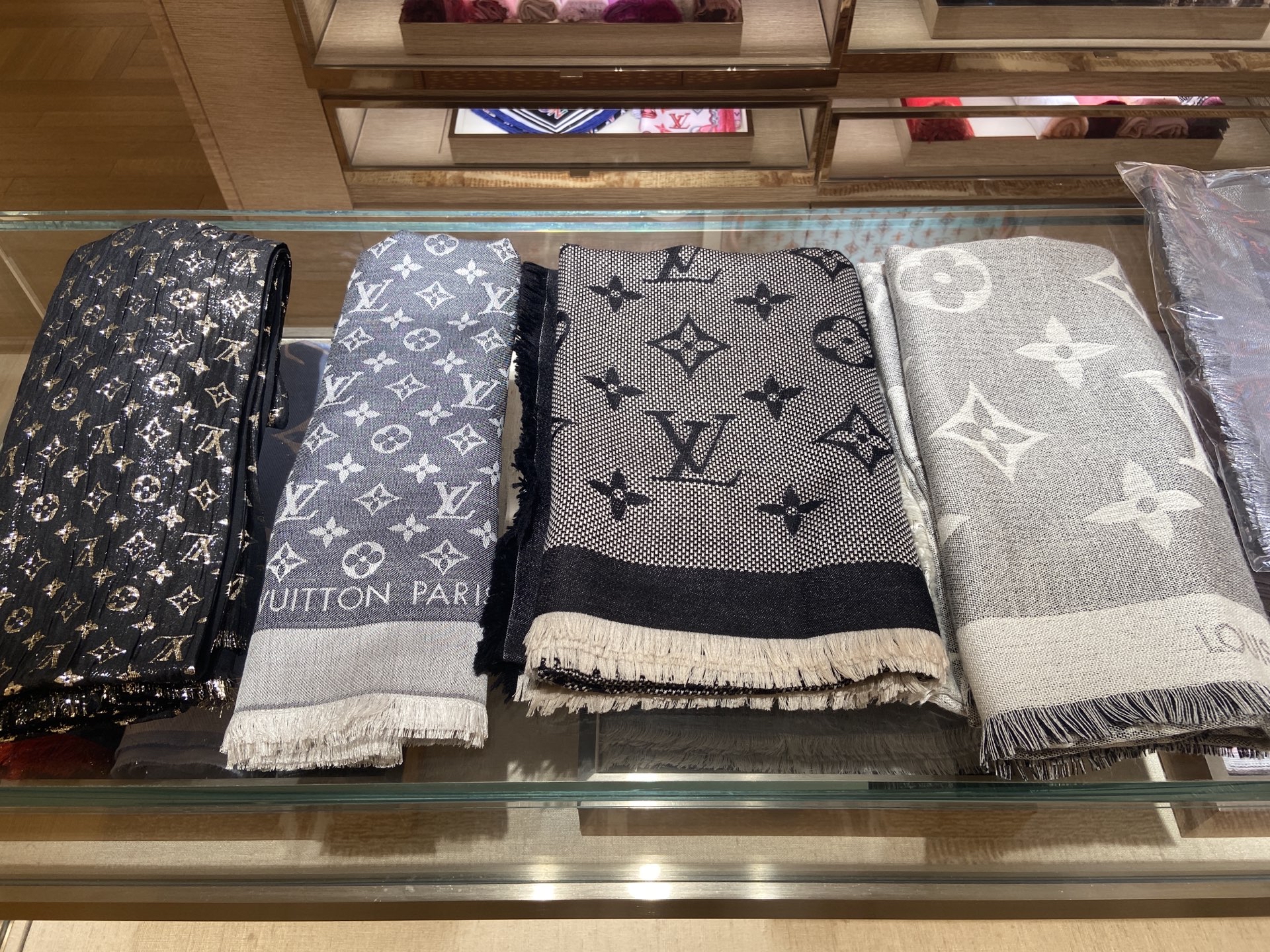 去路易威登陪小伙伴儿买一款披肩,但是小伙伴明显的没有做好功课,她想得挺好,一款披肩又想披又想围,问店员小哥有没有这种功能的披肩?小哥一脸的无奈,说姐姐你不要逗我了好不好,披肩嘛就是方的,围的么就是长的,披肩就是四方形的,只能披不能围。还好小哥哥很可爱,没有向我们翻白眼,一脸鄙视的表情“你们这一群什么都不懂的消费者!”。最终小伙伴拿下一款经典款路易威登花纹的披肩,四四方方的。