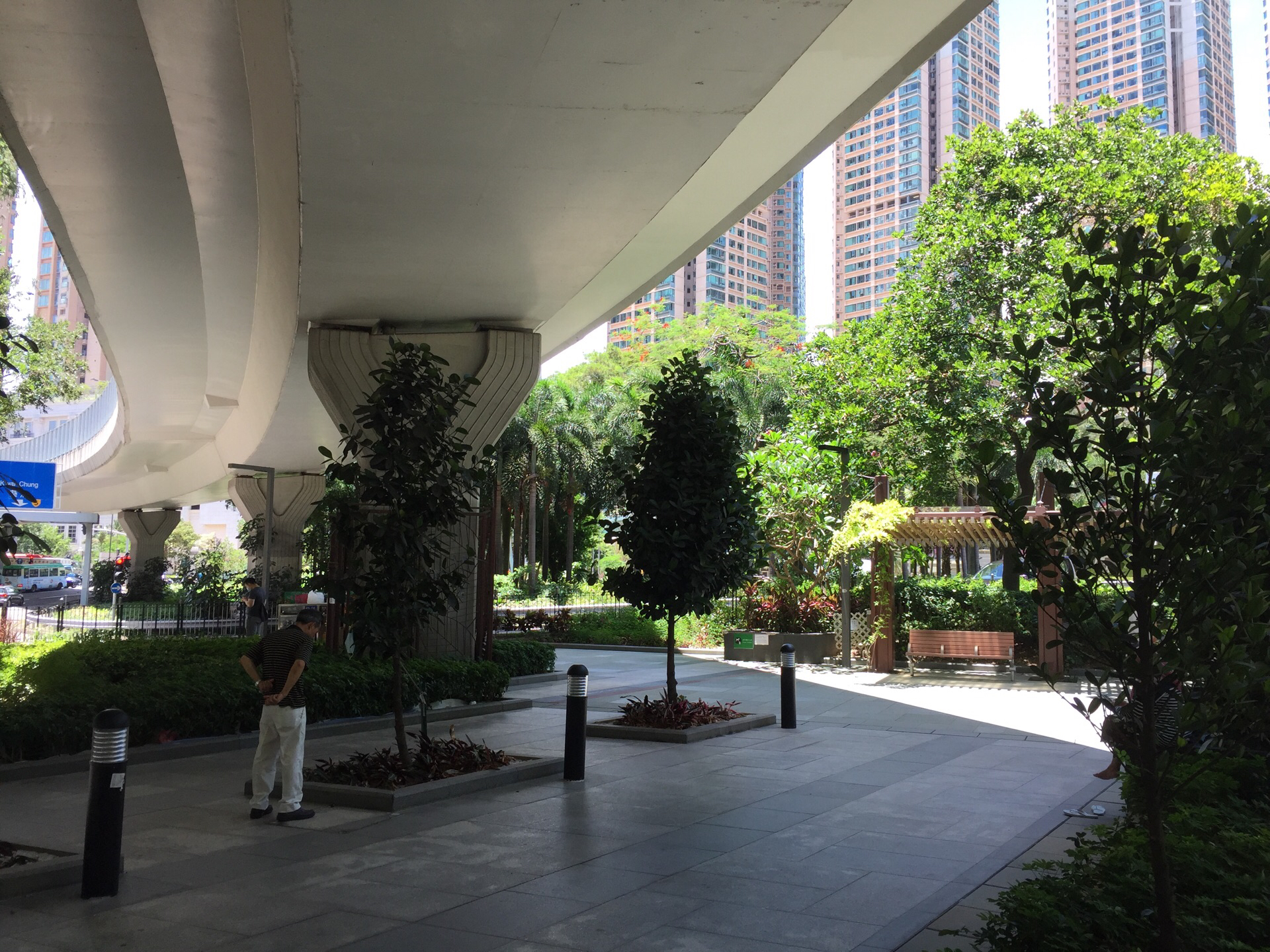 这个小公园的头顶就是西九龙走廊,即在行车天桥的下面这个小公园的头顶就是西九龙走廊,即在行车天桥的下面。有关部门利用了桥底这个不大不小的地方作为休憩空间,阳光猛烈时,天桥刚好起了挡太阳的作用,也增加了市区的绿化环境。