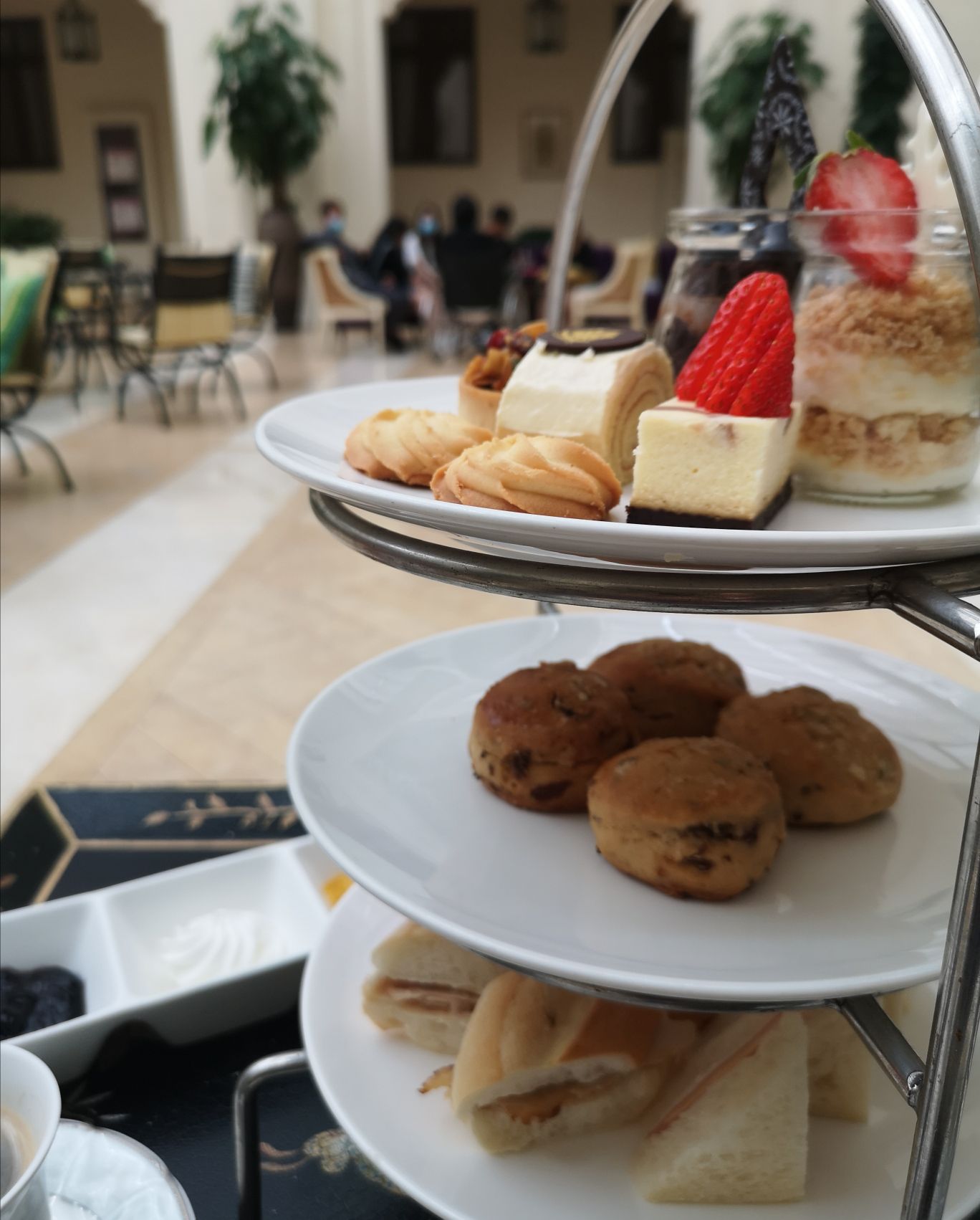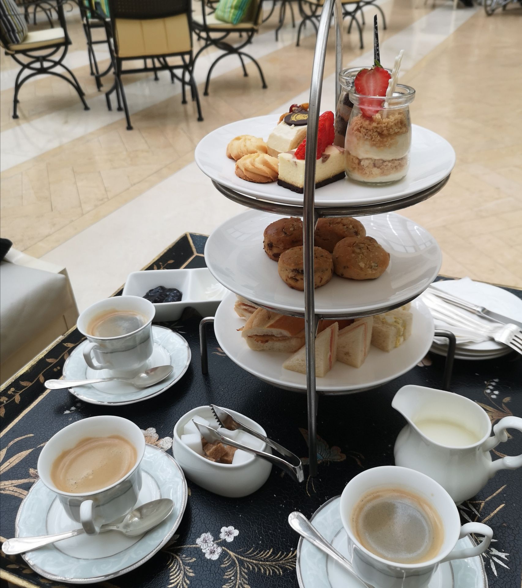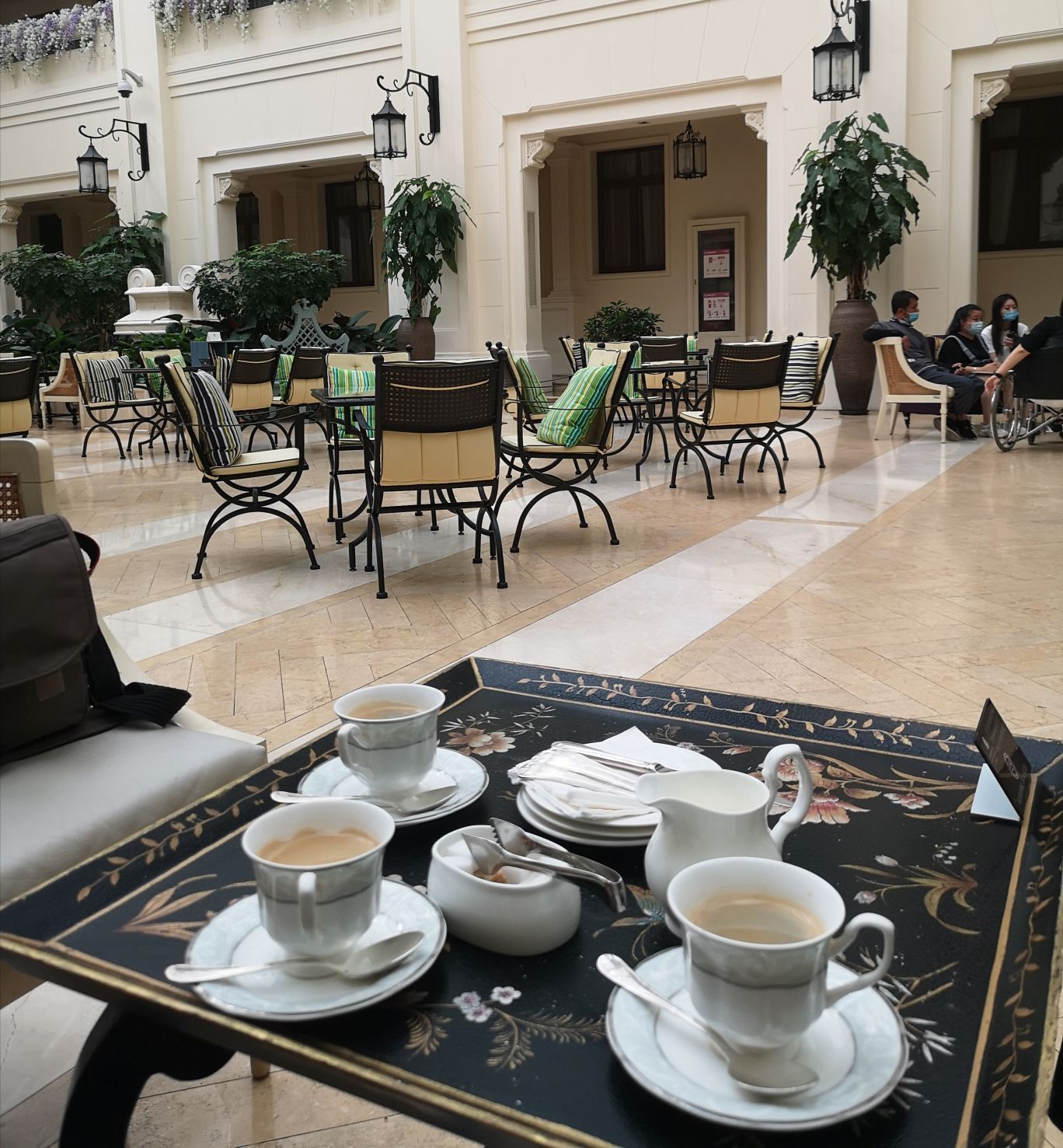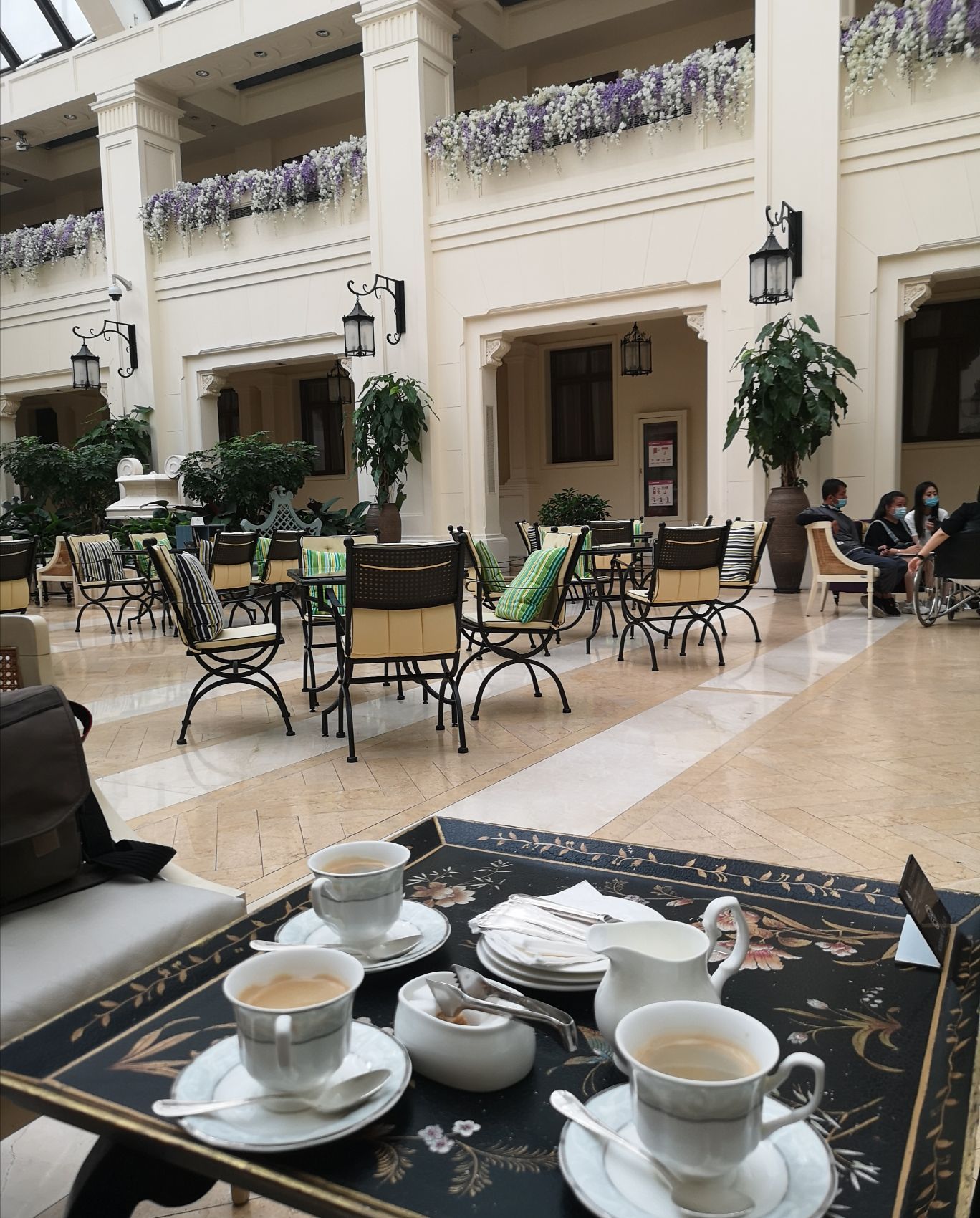利顺德大饭店,维多利亚花园的下午茶。首先环境很赞。玻璃顶采光好,不像那些光线昏暗的咖啡馆,里面绿植丰富,有阳光的味道。座位间距很大,不必担心私密性。坐在这里能迅速放松下来。 另外味道也不错。双人套餐量足,饮品可以选咖啡、果汁或茶。甜点做的挺好。 因疫情期间对人员密度的要求,需要提前预约的。