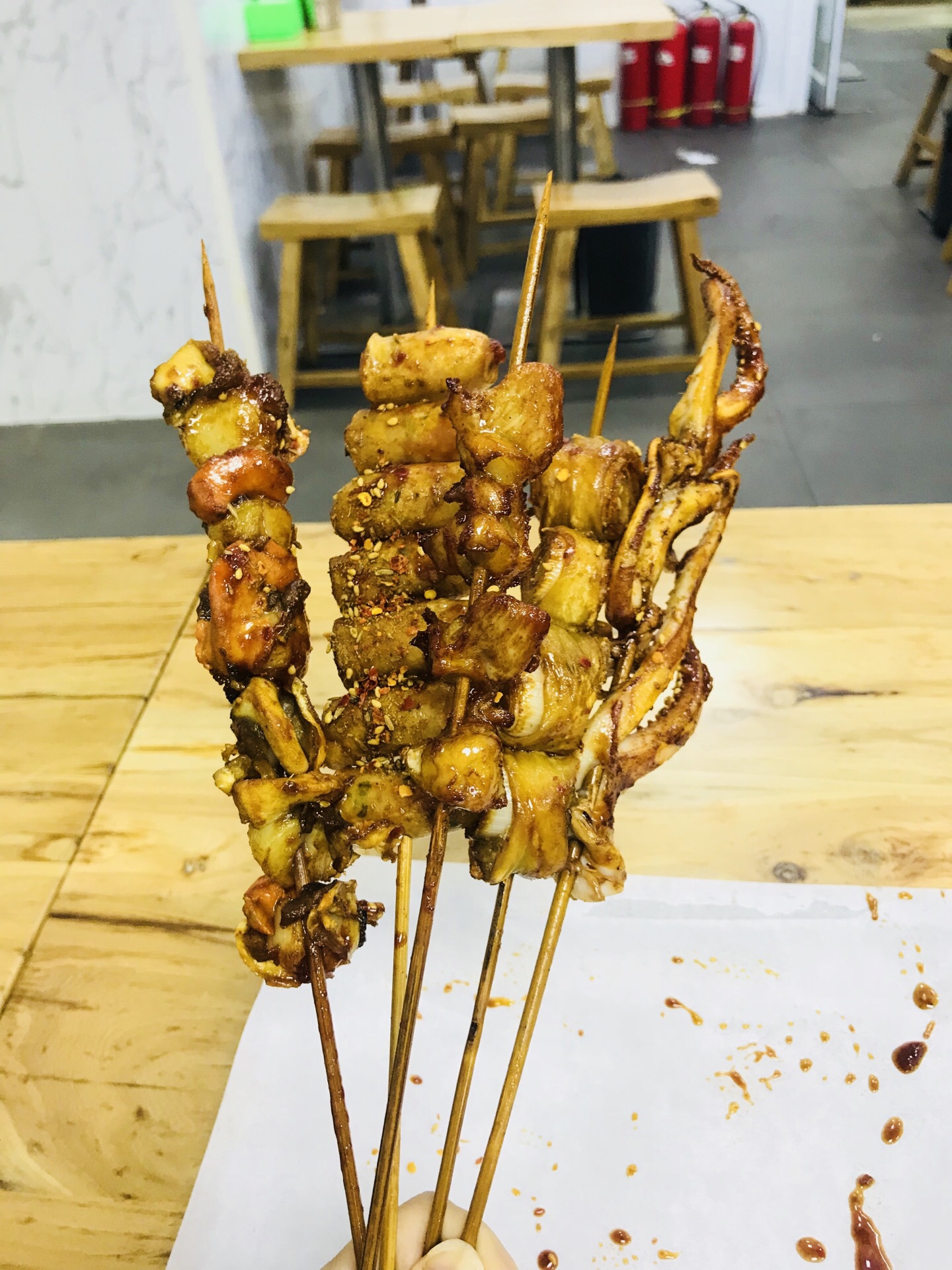 鸡脆骨和鱿鱼真的都好好吃,铁板万物皆美味!非常不错。拉面很很好。烤肥肠很一般,大葱太多非常不错。路过看大家都排着队挑串,自己正好也种草了很久,于是挑了几串儿随意吃了几口。烤肥肠很一般,大葱太多!鸡脆骨和鱿鱼真的都好好吃,铁板万物皆美味!拉面很很好。但是依旧人声鼎沸!