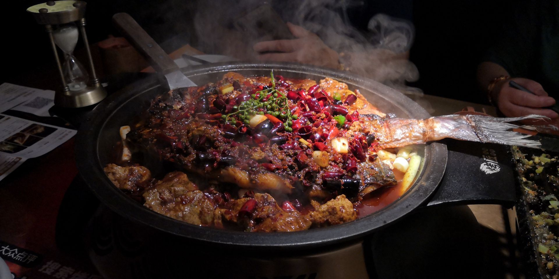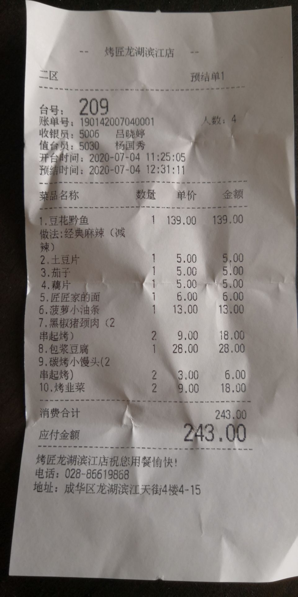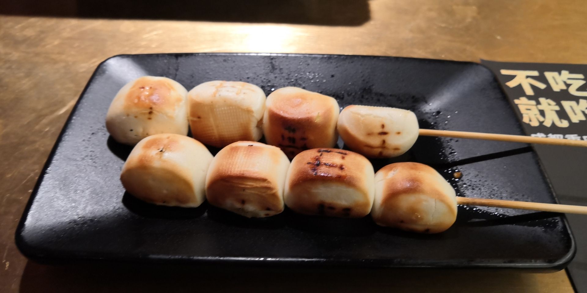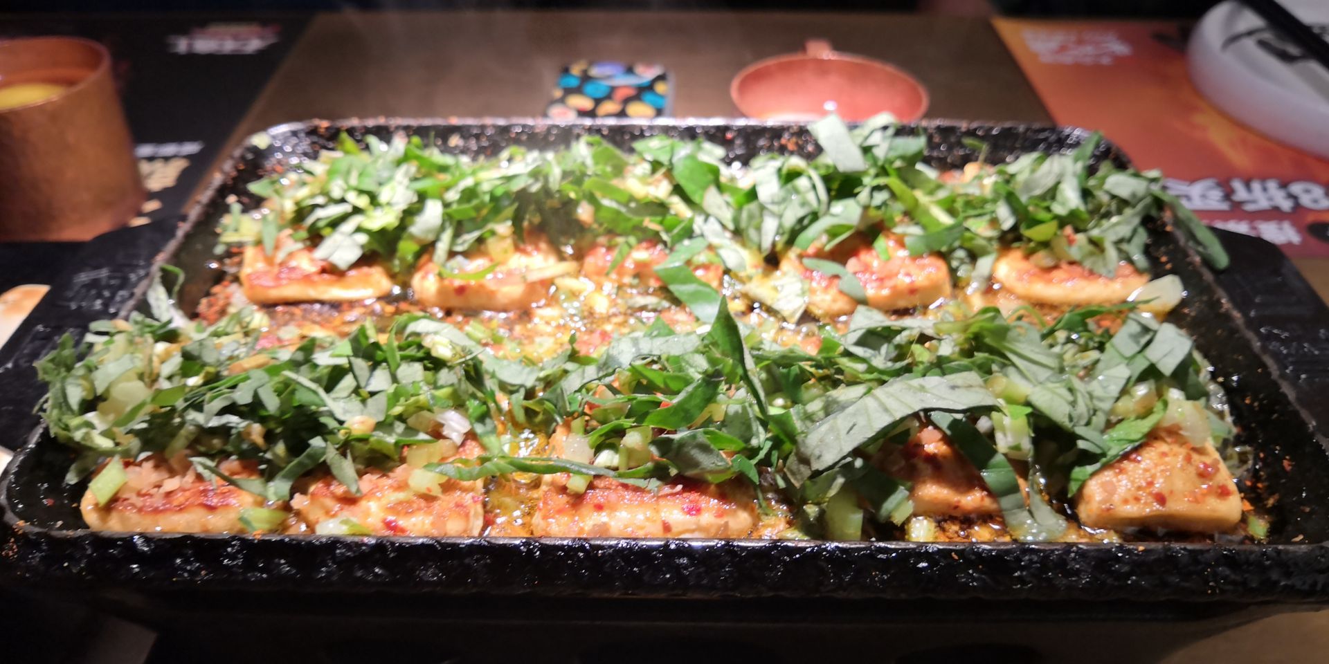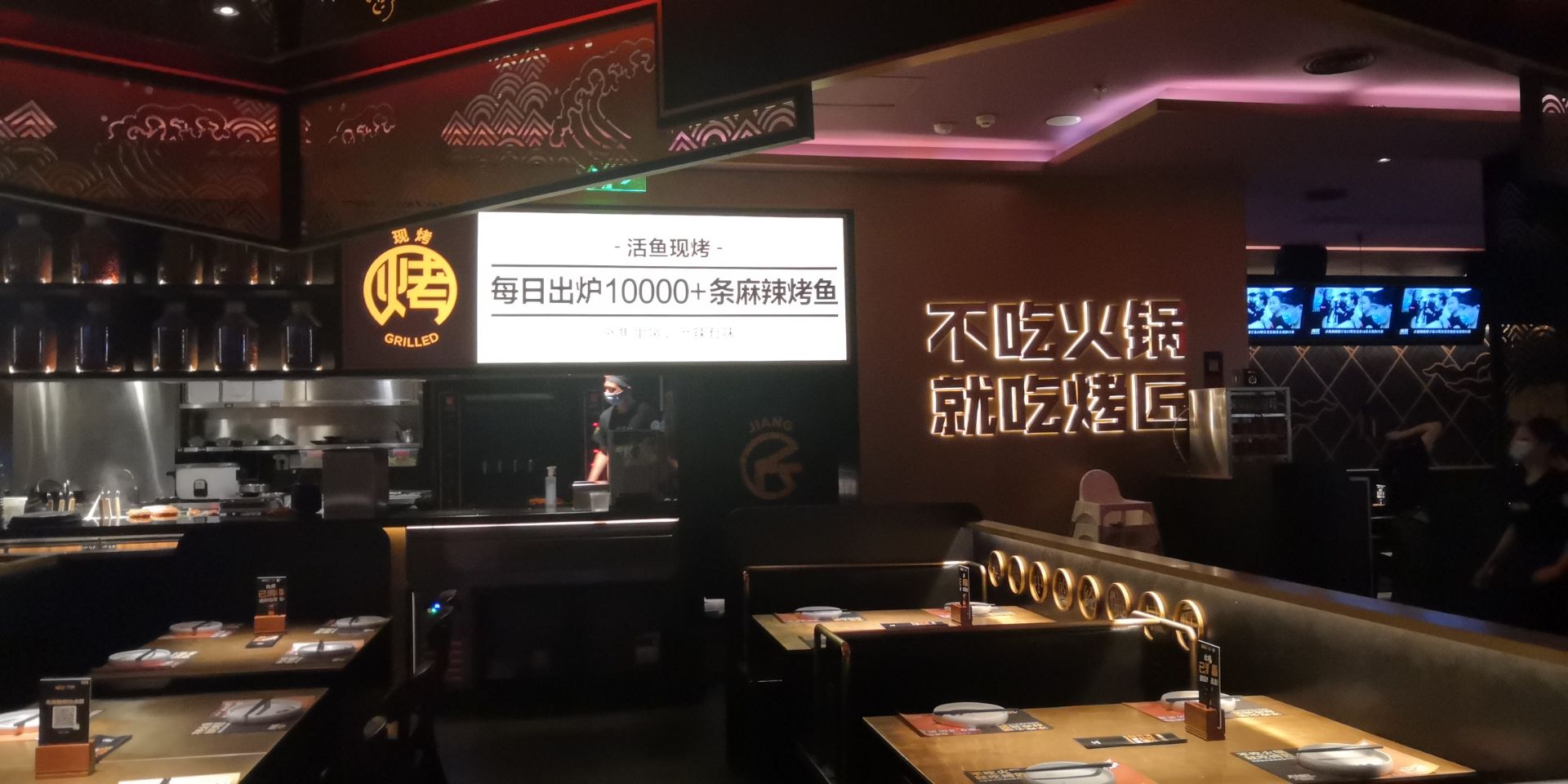 龙湖滨江的烤匠在4楼,感觉挺不错的,顾客很多,服务人员态度很好,环境风格属于黑暗系的。烤鱼很好吃,还有一圈黑豆花,垫底的蔬菜要自己点,份量较少,多点一点才行。包浆豆腐很赞,还有菠萝小油条好吃,油条是酥的,店家还赠送了冰激凌。唯一就是烤韭菜不好吃,太老了,嚼不动。