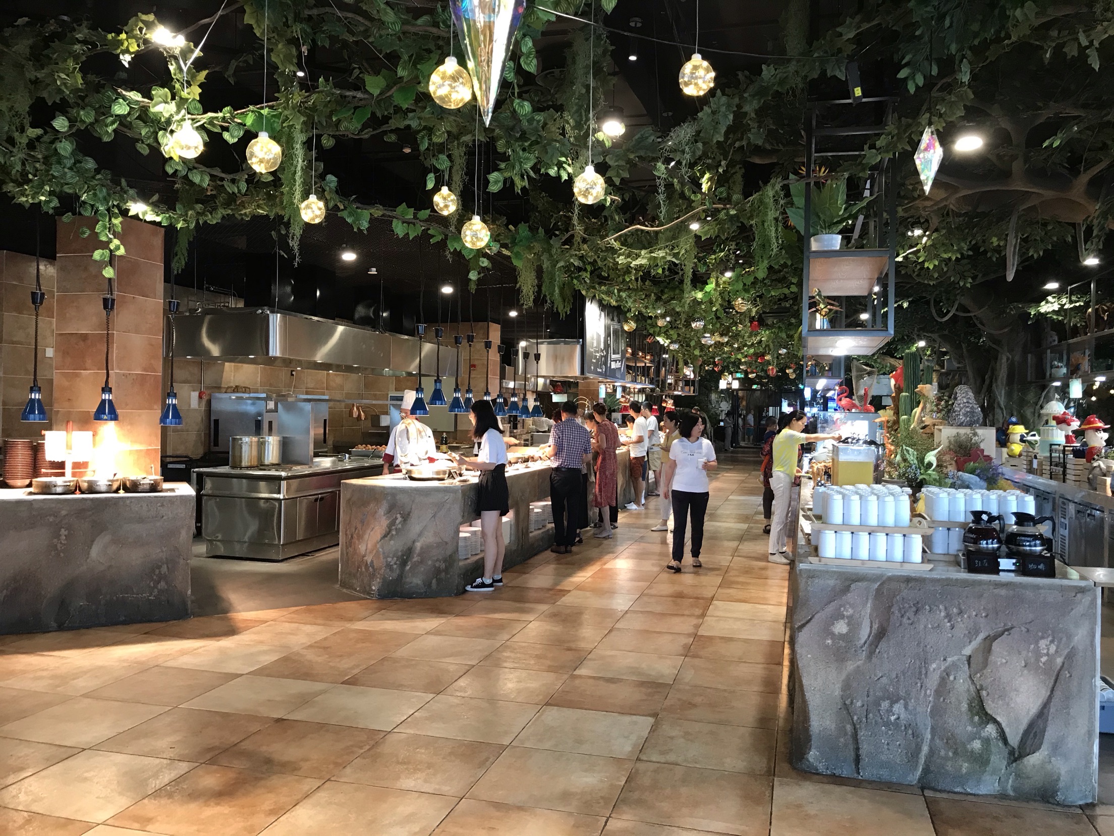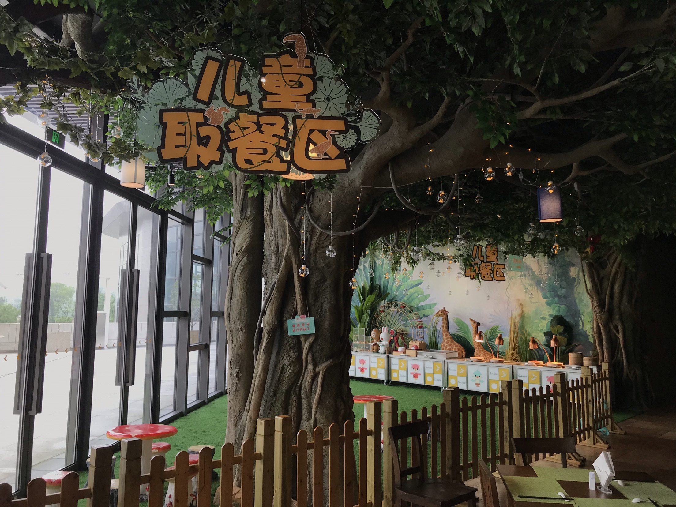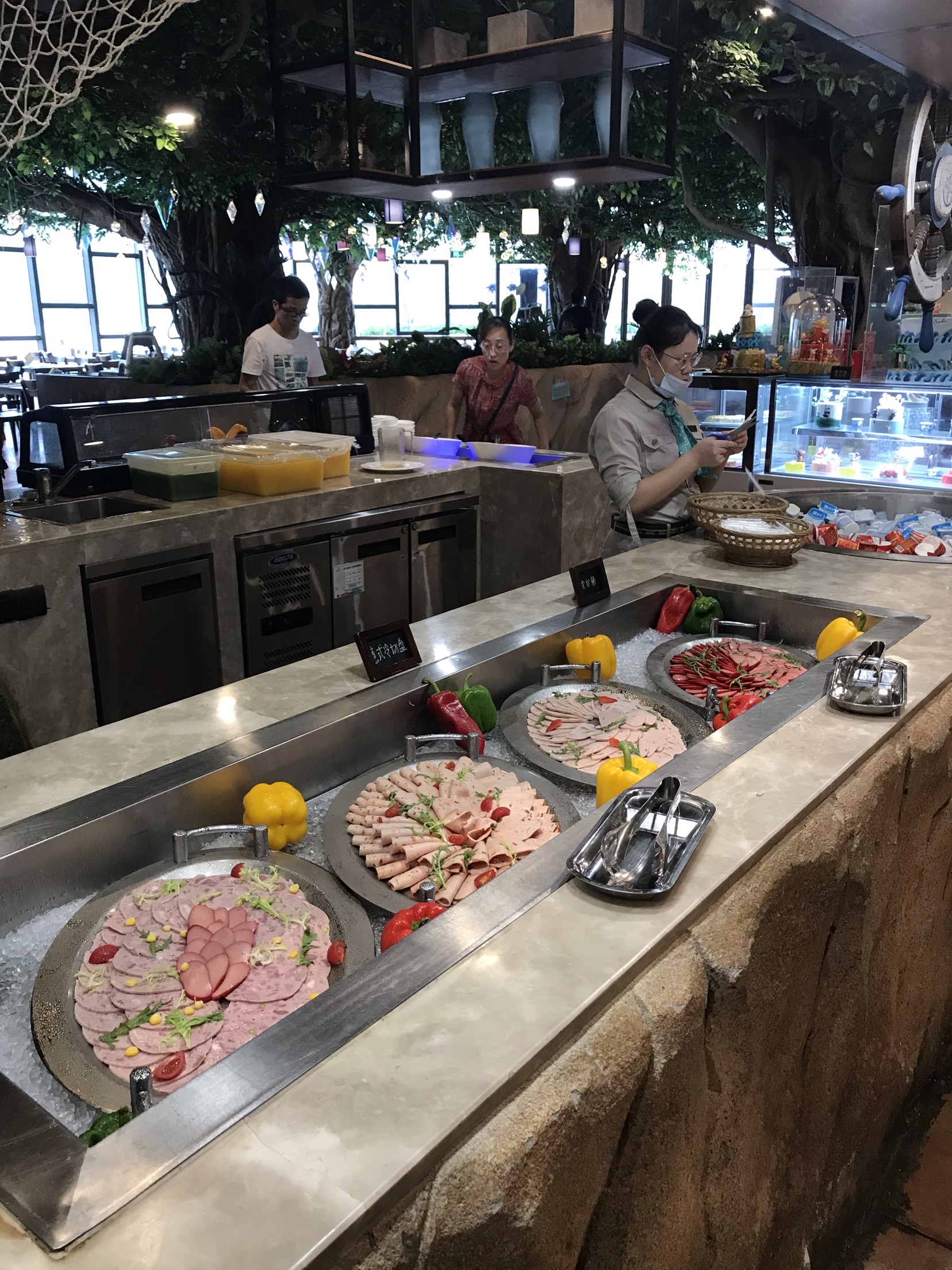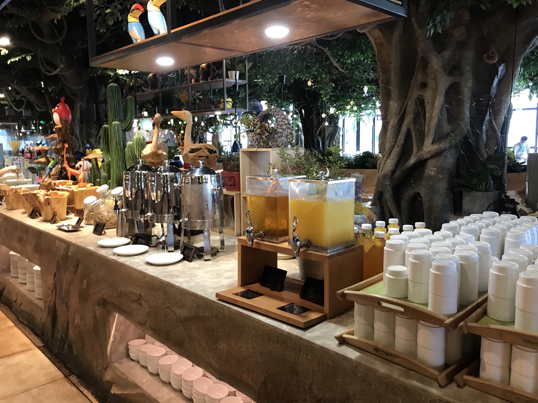 开元森泊的雨林餐厅晚上是自助餐,白天是住店客人享用早餐的地方。 酒店很贴心的标明了不同时间段的客流量,为了错峰,我们差不多7点40到餐厅吃饭。 人不多,早点出来吃饭还是比较值得的,所有东西都很齐全,觉得最棒的是煎蛋🍳。所有的荷包蛋都罗列在那里,想要太阳蛋随时都能拿到。 冷肉区,蔬菜色拉区也是一应俱全,饮料有果汁,有牛奶,只是芝士的种类少了一些。 除了西式的早餐,有面条,米粉,小馄饨等等。各种粥,豆腐花,蒸点,蛋饼,糯米饭团等中餐的特色都有。 餐厅比较特色的是儿童餐厅,给小朋友专门准备的餐食,本来以为过家家,没想到是真的,非常亲子的餐厅。 8点半到9点的时候到达了餐厅的高峰,之前空荡荡的位置全部坐满,服务员可能来不及收东西,可能体验会差一些。