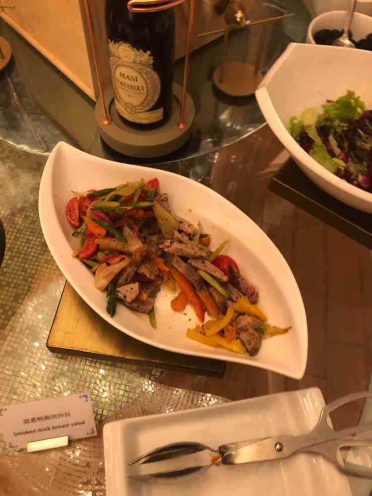 酒店有点老了,味道服务都还行。 「意大利餐前小吃」 意式的,前菜是自助餐形式。自己选,烟熏三文鱼,牛肉,土豆,南瓜,蔬菜色拉。推荐南瓜和烟熏三文鱼。 「意大利通心粉」 蕃茄味的真好吃。面很有嚼劲。酱料酸酸的。 「芒果奶冻」 没有芒果奶冻了,上的树莓奶冻,也很好吃哦。 2个人499块。免2小时停车费。
