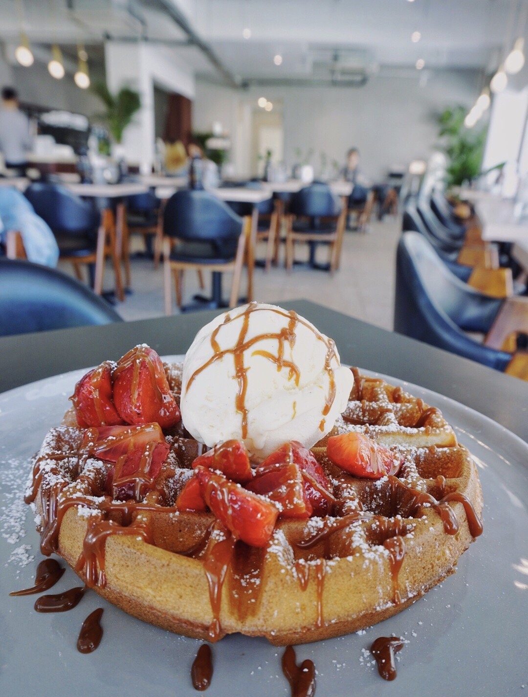 堂食会配上果酱和butter Croissant本人一般 起酥算是过得去的 搭配的莓果酱和Butter一起入口 甜度和香度共存于舌尖 只是要把握好果酱的量 放多了会太甜影响口感 毕竟吃过了神仙级别的Croissant 对比之下就相形见拙了 但是多余的果酱可以放在Waffle上 就拥有了多一个口味 聪明如我嘎嘎嘎 厚实的华夫饼烘烤得坚脆 毕竟配上冰淇淋球 坚脆点挺的时间更久 冰淇淋融过程华夫饼也会随着室温一起软化 到冰淇凌融化的一半的时候开始和华夫饼一起吃 华夫饼也不会过软而失去口感 要是等不及可以先吃蘸上焦糖酱的草莓和华夫饼 酥脆的口感也是另一种味道 把刚才剩下的Croissant配的果酱抹在华夫饼上 愉快地Get✔️第三种口味