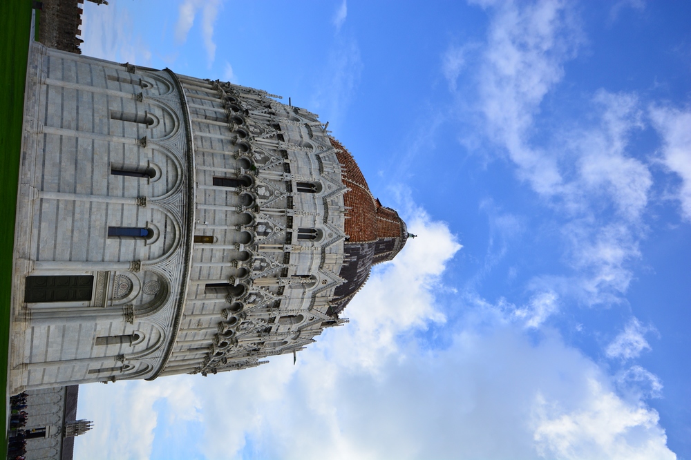 比萨洗礼堂,又名叫圣若望洗礼堂,是位于比萨奇迹广场左边的一座圆形的建筑,建筑是罗马式和哥德式风格的混合,尤其是直径 35公尺的巨大圆顶,特别显眼。洗礼堂是意大利最大的洗礼堂,礼堂内有个很大的洗礼池。而且据说这座洗礼堂内部的拢音效果和采光都很好。洗礼堂外部的装饰也很漂亮