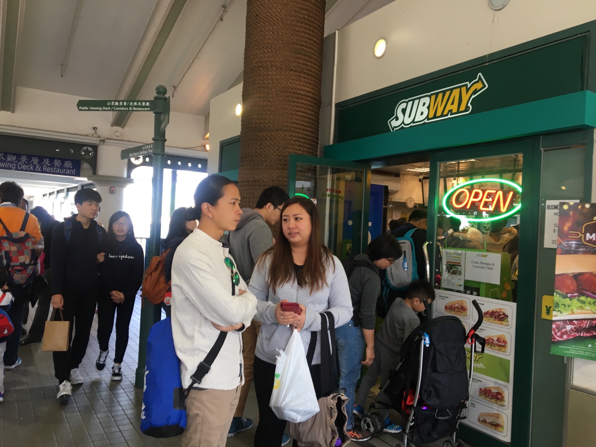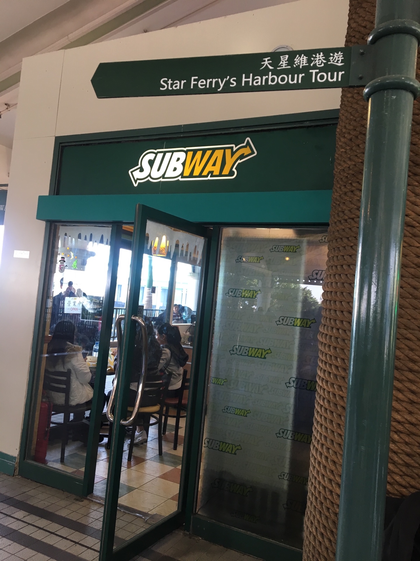 来到中环码头,准备搭船去尖沙咀。正好有点小饿,看到赛百味就打算去买一个汉堡啃一啃就行了。结果人还挺多,还得排队,再说想一想在小轮上啃个汉堡好像也不太雅观,最终放弃了。去隔壁的奇华饼家买了两个老婆饼。赛百味就在中环7号码头的上层搭船处。