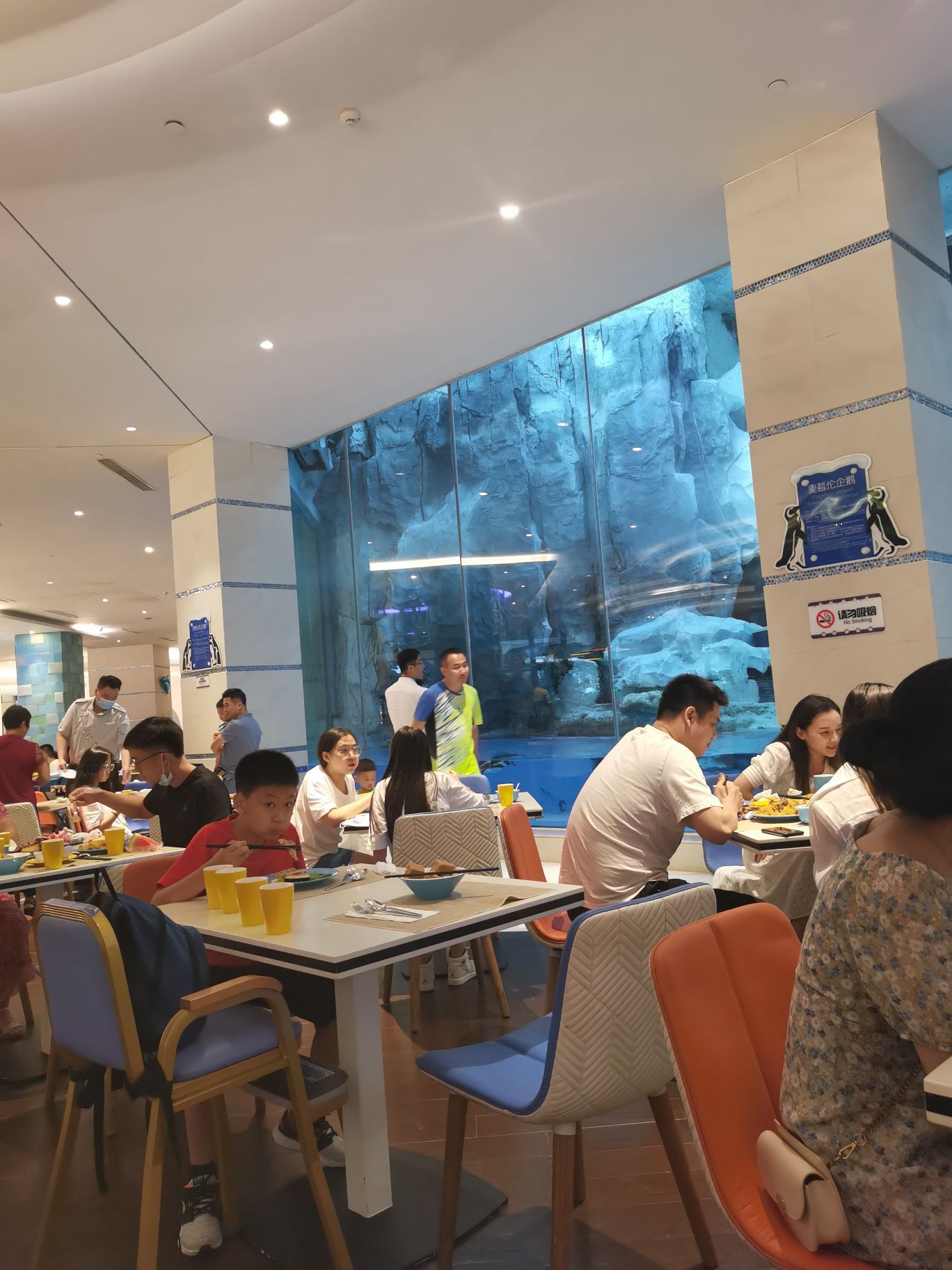 没想到现在自助餐搞活动很超值。三人家庭套票420元,是晚餐自助餐哦!在海洋王国景区里420元还不一定能吃饱呢,我们真是怕了里面的餐食才去企鹅酒店自助餐的。 晚上自助餐5:30开始入场,为了坐到企鹅池附近5:00前门口就开始排队了,我们5:20到,已经排得老远,结果孩子们抢到2个第二排位置,我和他爸抢到第三排。于是我们只能分开坐吧,不舍得放弃第二排啊。 食物还是很丰富的,味道虽然一般,但品种多且补充很及时,这个价格品质和景区里相比都笑上天了。