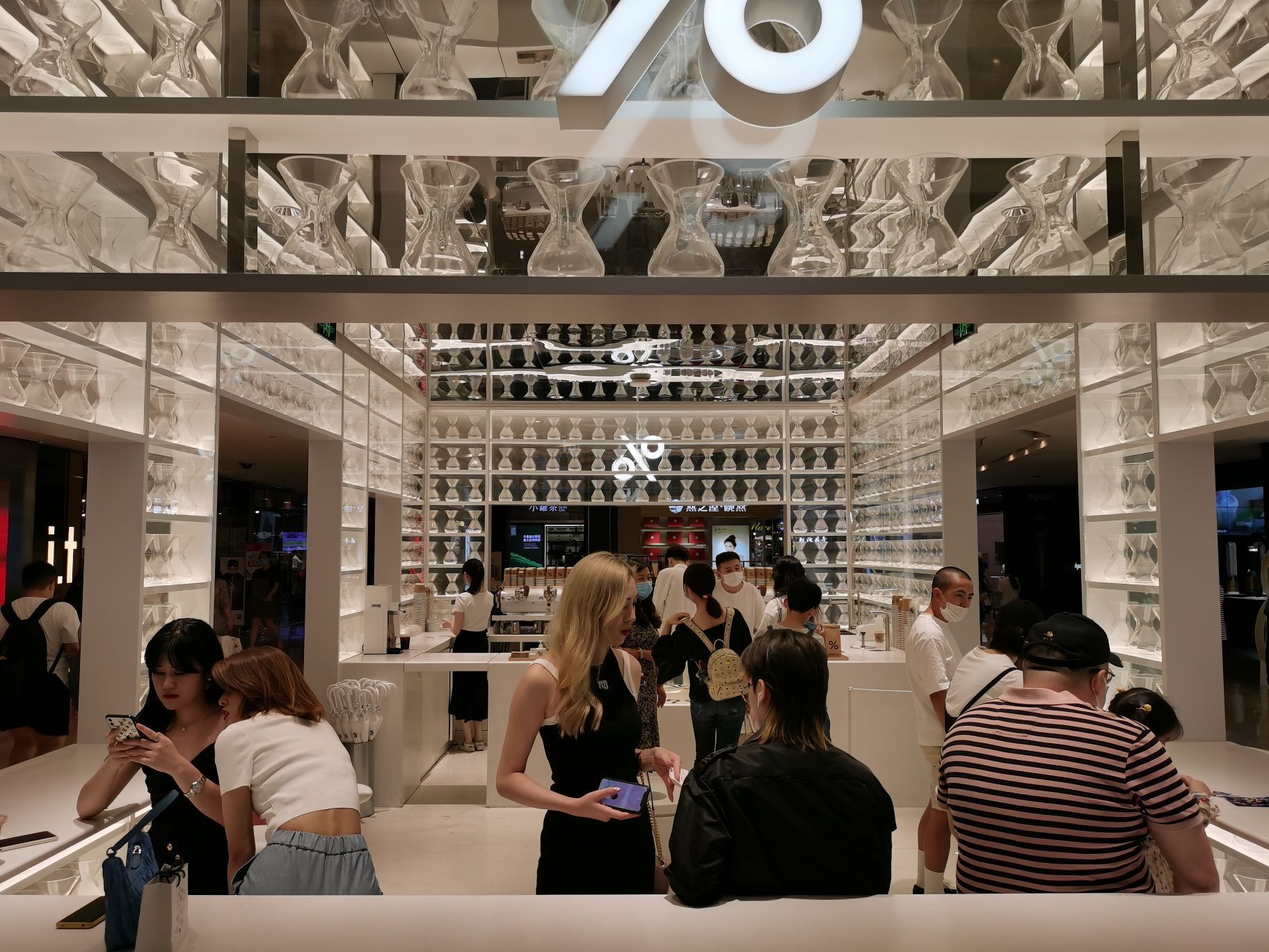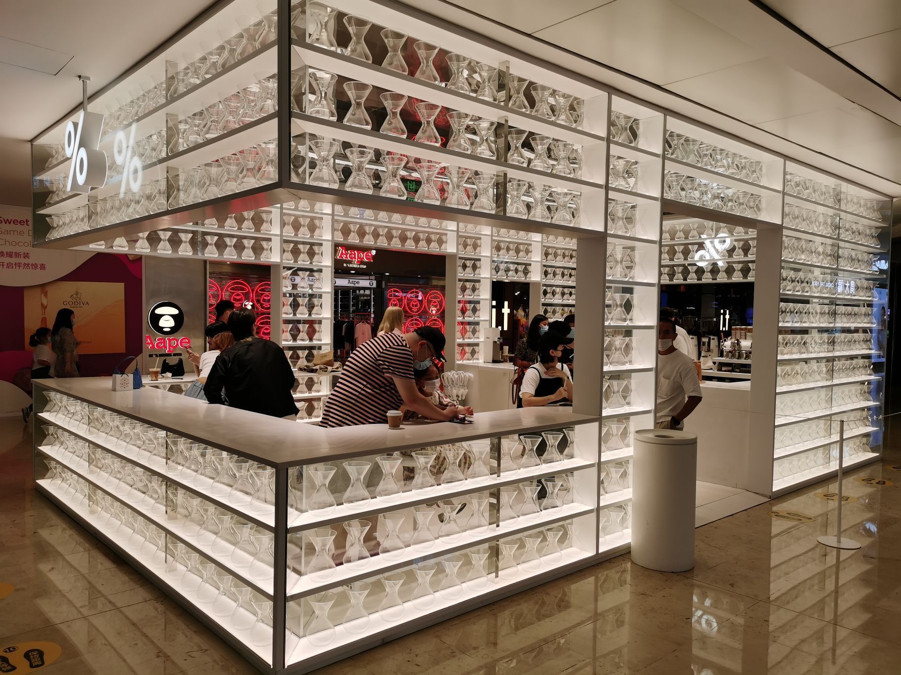 这边可以说是德基最漂亮的咖啡店了,就好像一件艺术品一样,由灯光跟里面的玻璃组成的一道墙,然后是...在德基广场的一期跟二期连接处,这边可以说是德基最漂亮的咖啡店了,就好像一件艺术品一样,由灯光跟里面的玻璃组成的一道墙,然后是一个比较大的四方体。