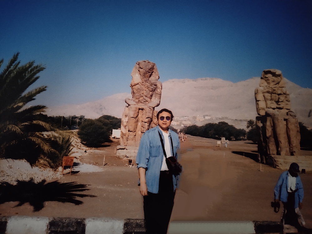 门农巨像位于底比斯尼罗河西岸和国王谷之间,建于公元前十五世纪埃及第十八王朝阿孟荷特普三世统治期间,雕象为本人坐像,建在他的神殿前,神殿由后来的法老拆除,只有这两座高21米的巨象孤独地矗立在原野上,雕像风化严重,面部损毁已无法辨识。公元前27年的地震使一个座像出现裂隙,早上太阳升起时发出声音,是温差产生气孔而致,公元170年罗马皇帝修复了这尊坐像,从此它不再发声。