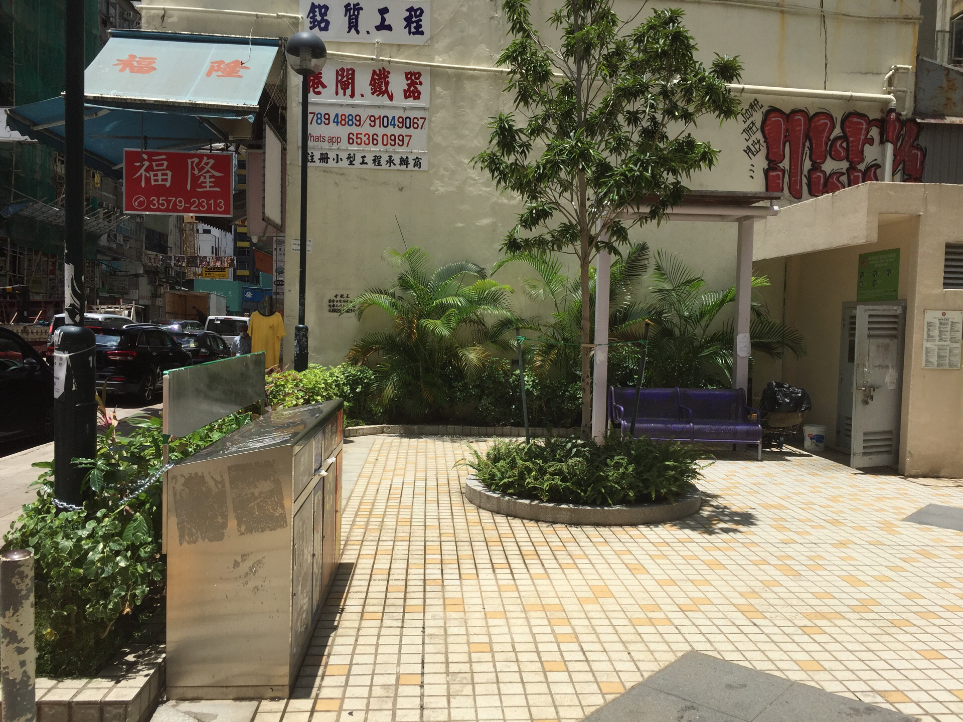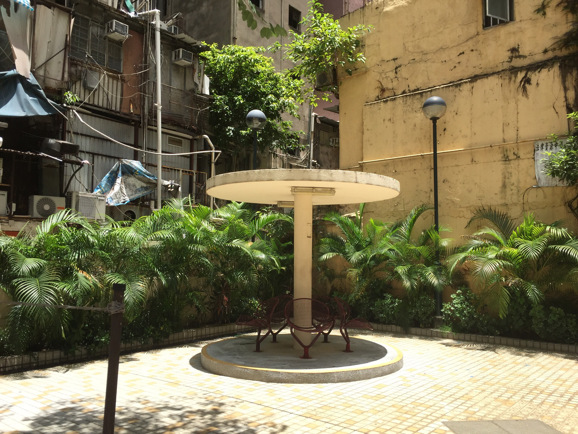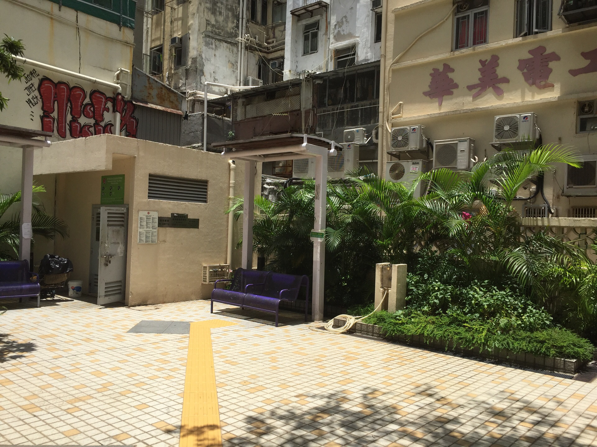 虽然位于内街,但中午时分还是受到太阳的暴晒,旁边的高楼不阻挡阳光照射。公园内没有樹,所以白天非常热,也没看到有人在休息。