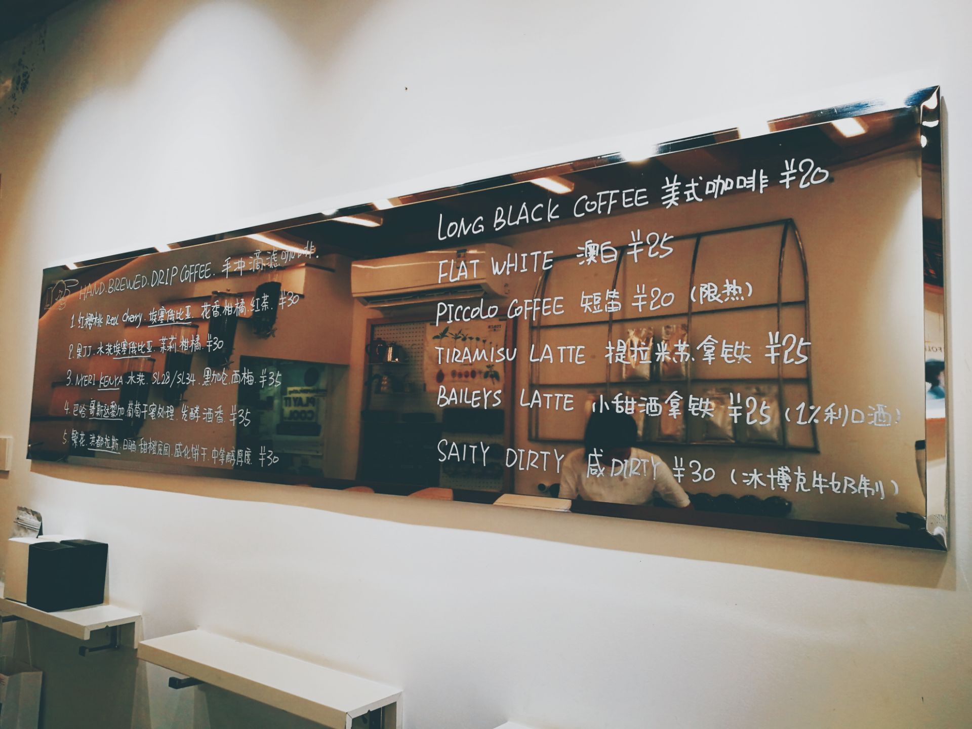 终于有机会来这家褒受好评的咖啡店了。小店有两层楼,大家自然都会上二楼看看传说中的“上房揭瓦”到底是什么样了,其实二楼很简单,很适合独自来这里发发呆,但是人一多就真的很影响环境了,还是情愿在一楼静静的坐会撸撸店家的猫猫。 第一次光顾选了提拉米苏拿铁,创意不错,好喝。临走时看到有咸dirty,很特别,以后再来试试。