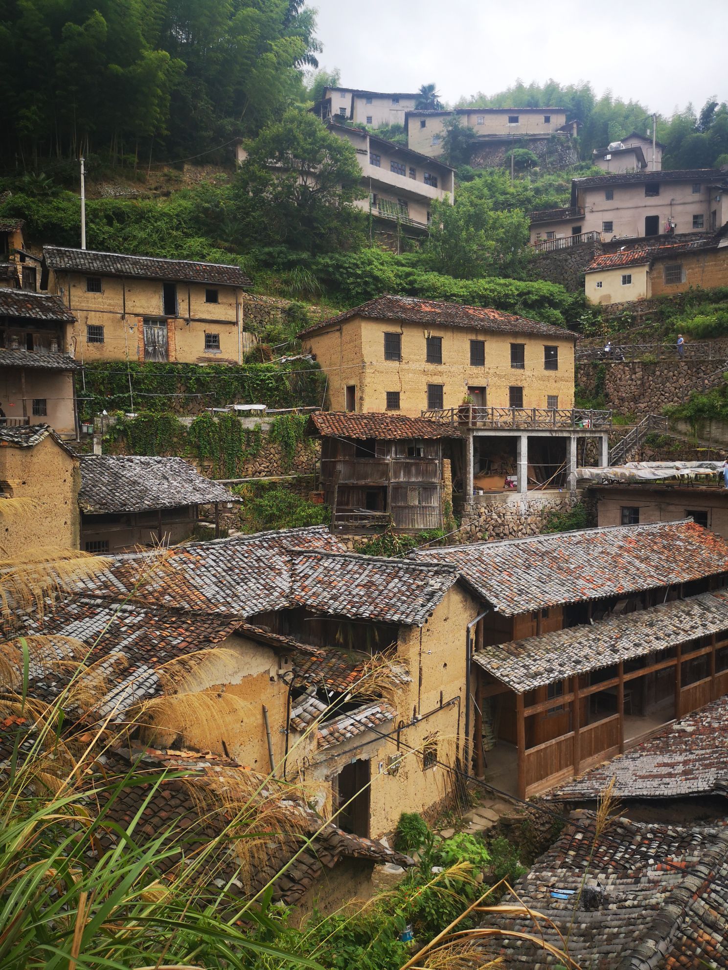这是第二次来到陈家铺了,在村口新建的民宿已基本完工,建筑风格大气,用粽綜梆绳缠绕的方块装饰有特色,估计明年可营业了。陈家铺的民居依山而建,错落有致,黄色的泥墙、黑色瓦、石头小路是主基调,原汁原味,没有被商业化污染。在接近山顶有个高雅的先锋书店,可以点杯咖啡,坐在露台上静心看书!