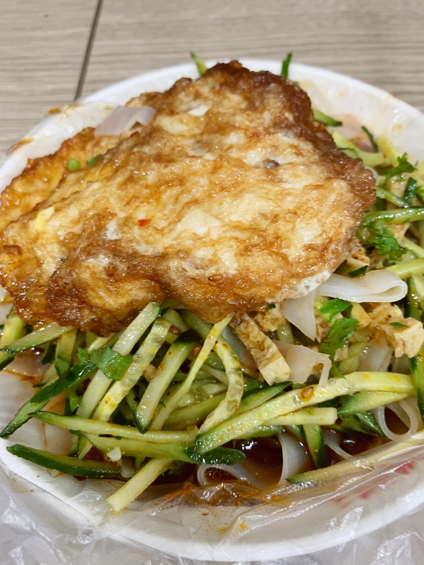 一碗碗凉皮拌着飞快,很快就到我们了,还是按照惯常的那样,点了特色凉皮+鱼香鸡蛋的组合,口感依然蛮好的