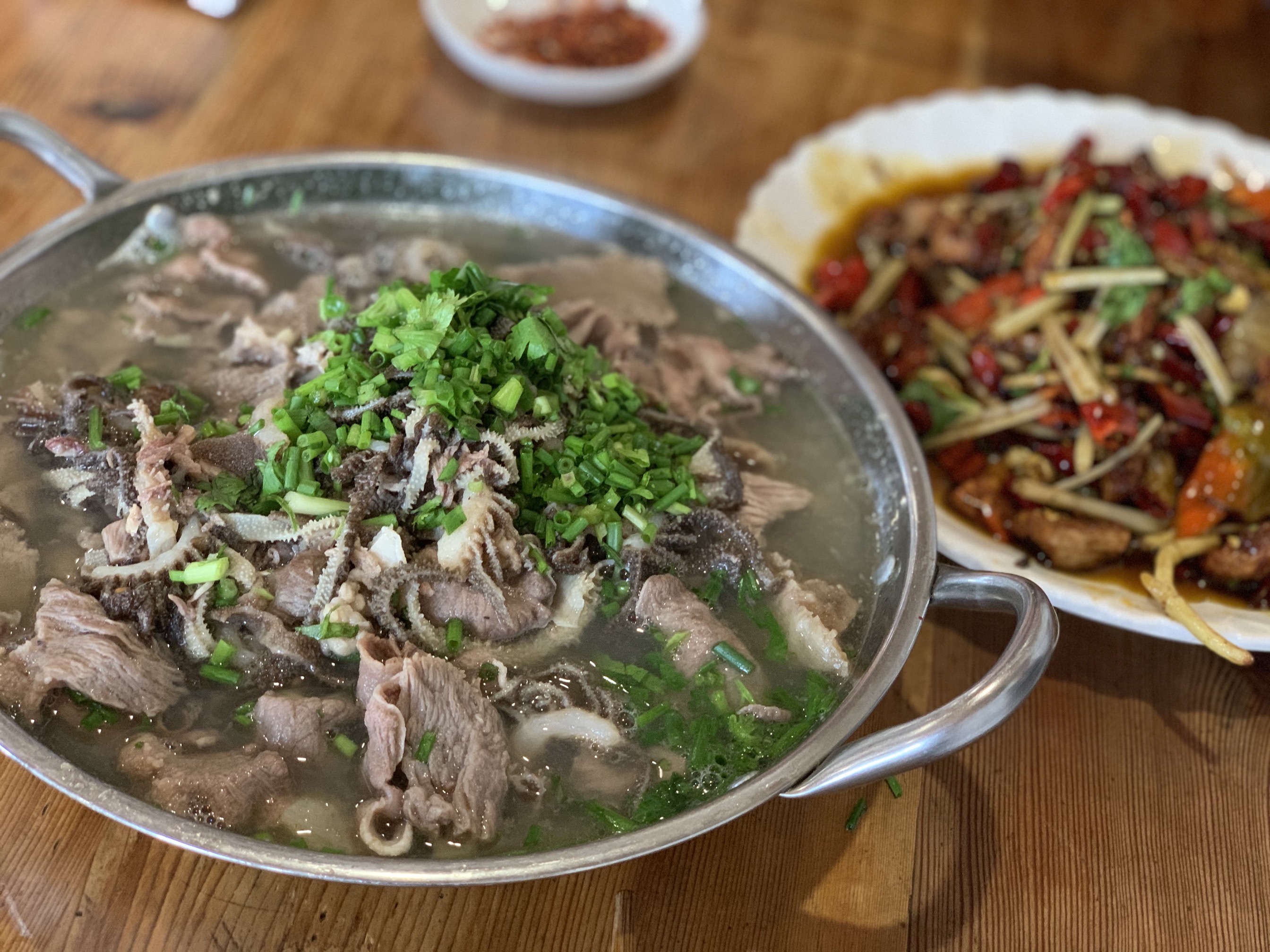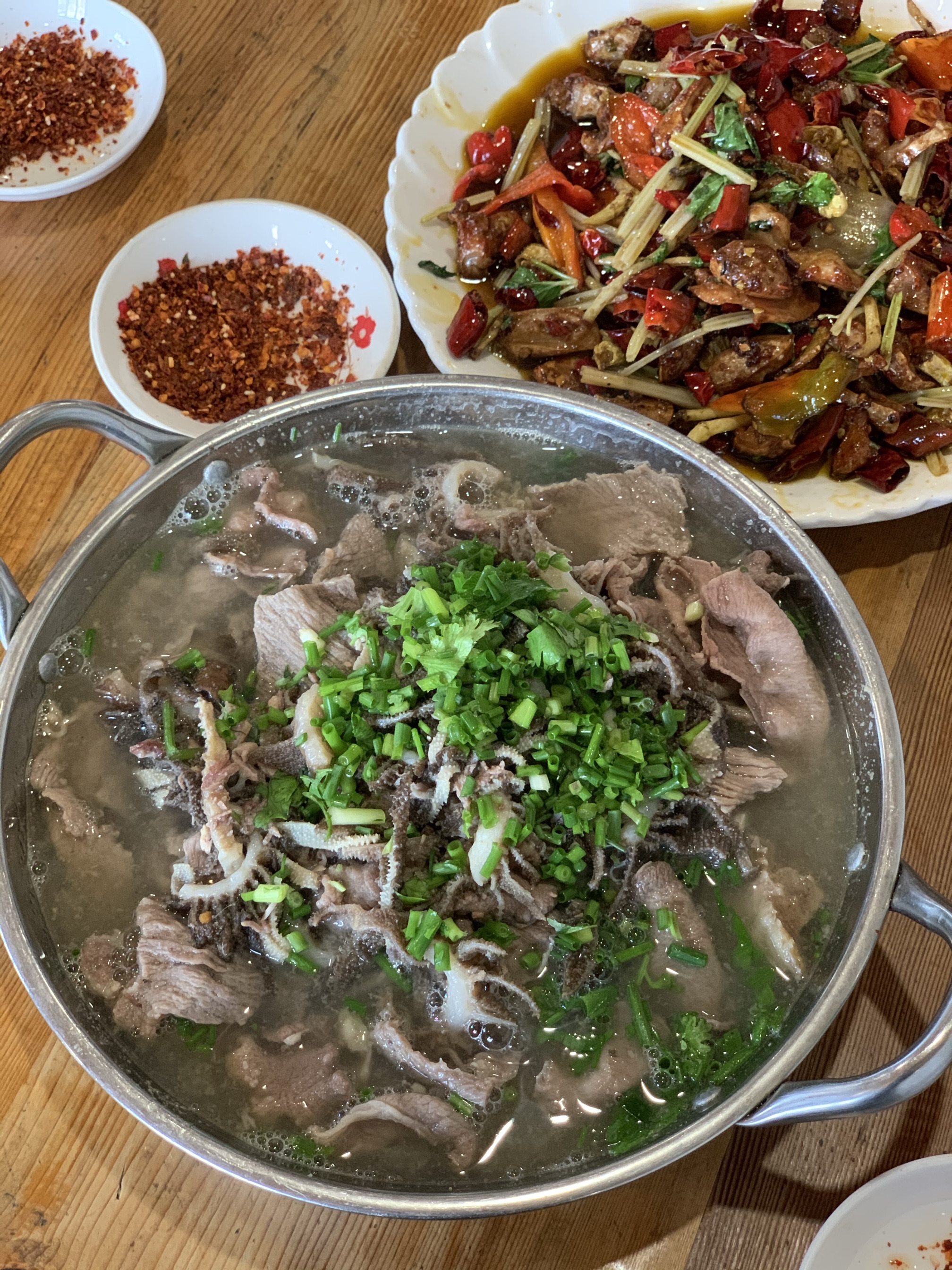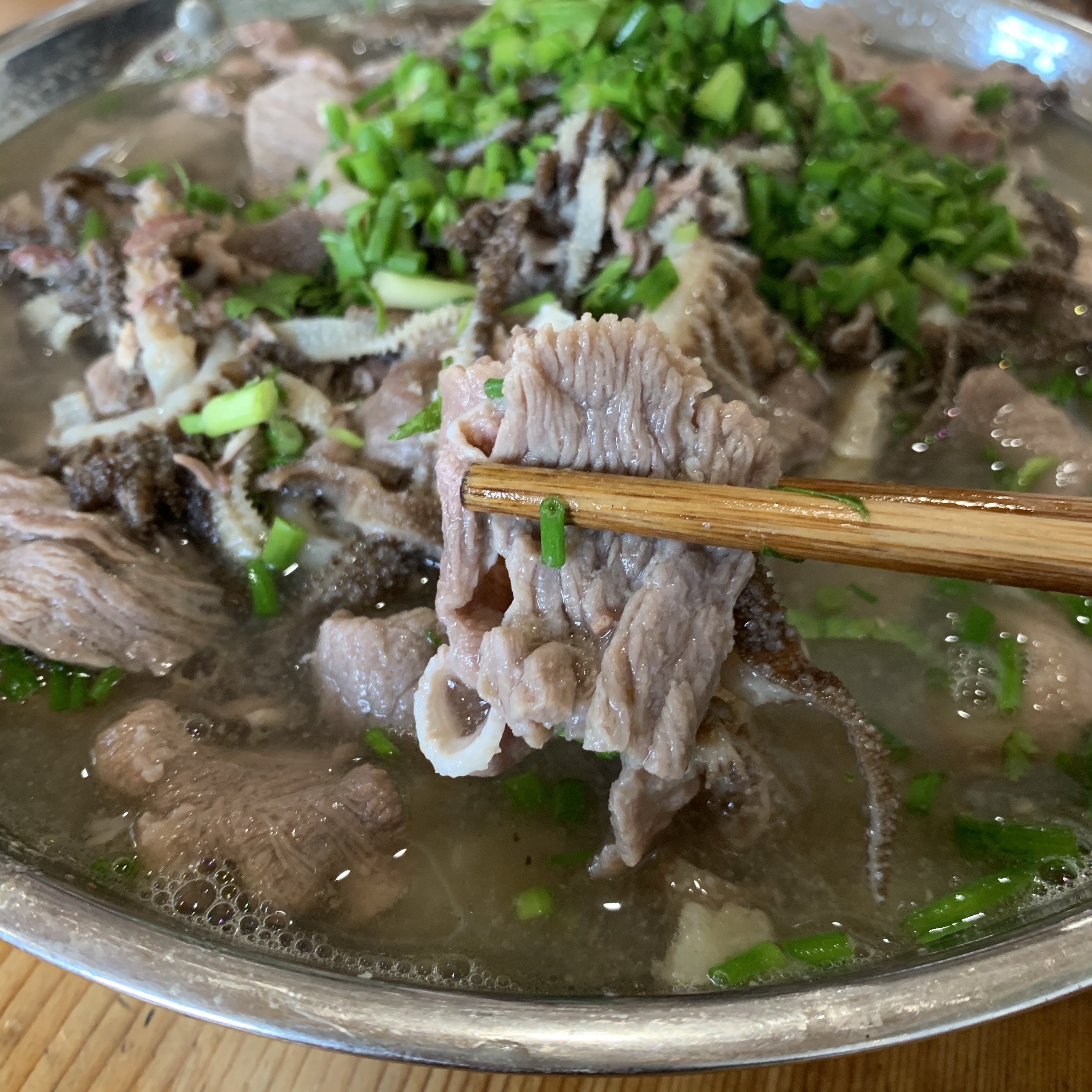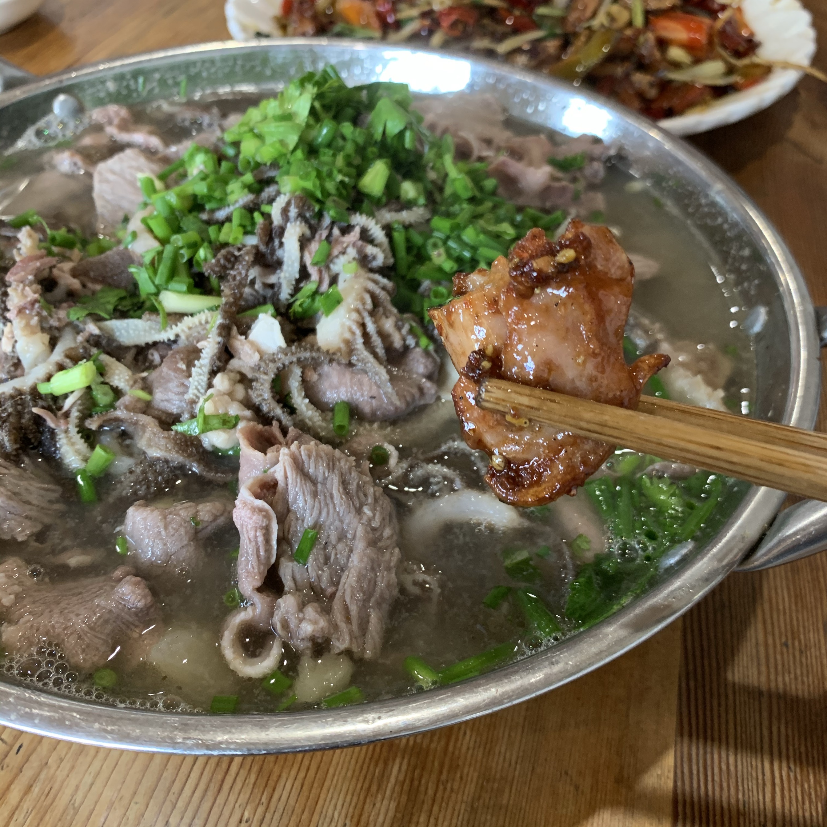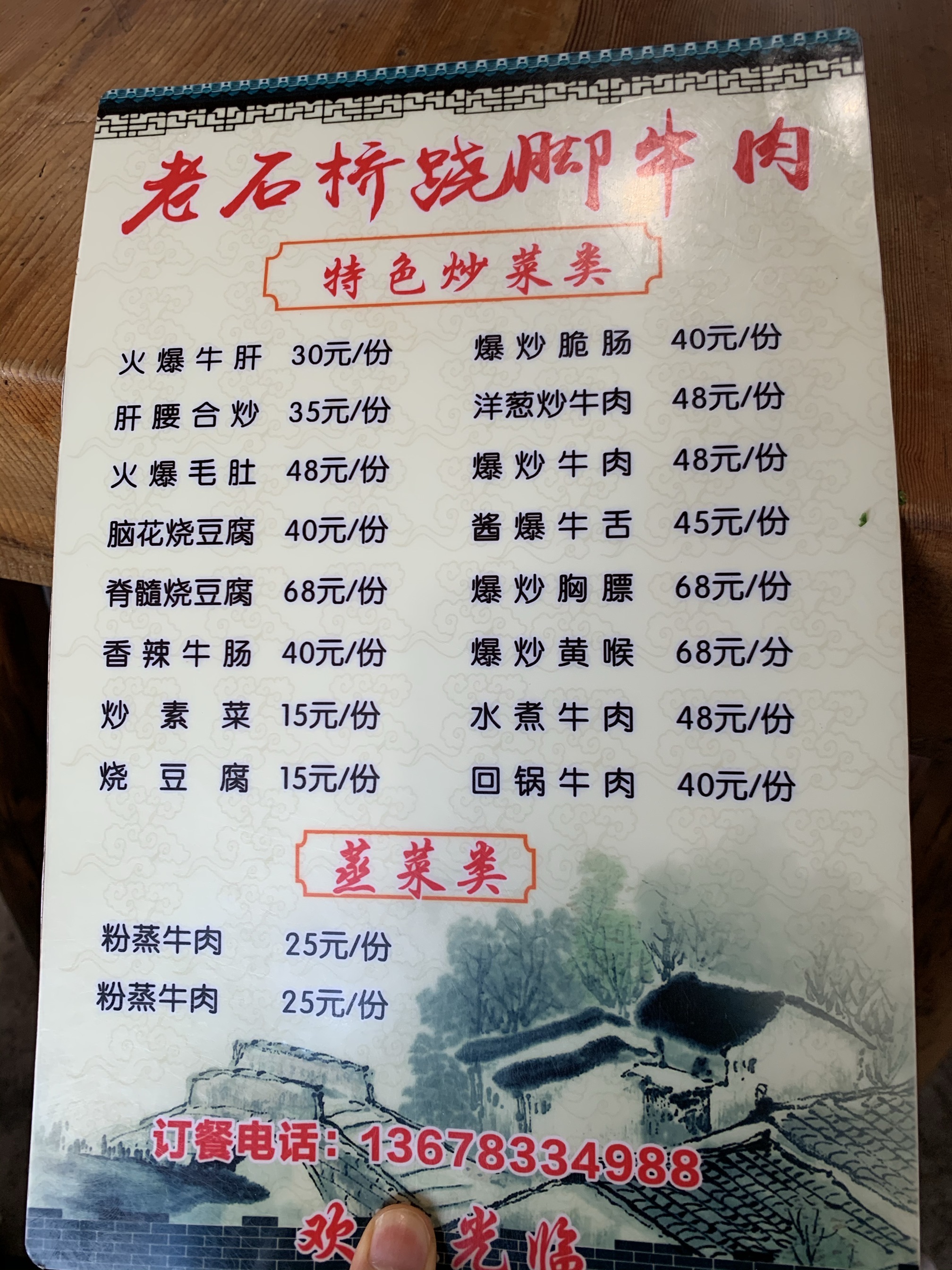 总评: 总体来说味道普通,品质一般,关键是在白菜碗里找到了头发。 有些倒胃口了。 所以,并不推荐。 优点是老板比较热情,点菜都不让顾客操心,喜欢推荐和包办! 评分:65分 性价比:❤️❤️❤️ 原本预计的是去吃豆腐脑、咔饼、凉糕三家店。 然而豆腐脑店关门了,所以主食少了一家。 吃完其他两家临时就近选了这家店。 点单的时候,老板还比较能控制场面,不让我们点太多,所以这个我算是很有好感了。 【跷脚牛肉】80元小份 跷脚牛肉算是店里招牌了,但是我感觉并没有很特别呢? 份量还算足,只是这里面有些肉,嚼很久都不烂,只能吐了,没注意是哪一部分。 还有就是汤头也没有很鲜。 【爆炒脆肠】40元 还行!但是并不惊艳,用来下饭吃吃还是可以的。略油! 【粉蒸牛肉】25元 粉蒸类的菜品都是我喜欢的,但是这家我感觉还是极其普通的。 牛肉裹的粉略厚,也有一些带筋的牛肉,根本嚼不烂。 【脊髓烧豆腐】68元 嗯!感觉脊髓略少,豆腐占比例太重。 味道也不如我的预期。 哎!这家店总的来说就是差了些火候,没有哪道菜让我觉得很满意的。 老店是老店,但味道还是各人有各味呀!