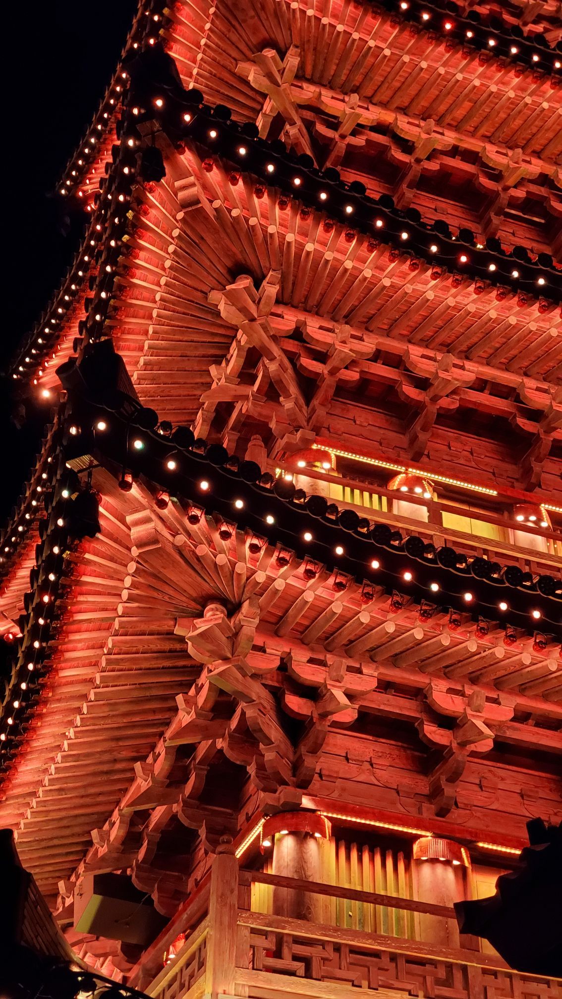 拈花塔采用重唇板瓦,平添了庄严恢弘的气势,四角飞檐也做的极为精致,悬挂的风铃叮咚作响,如袅袅梵音