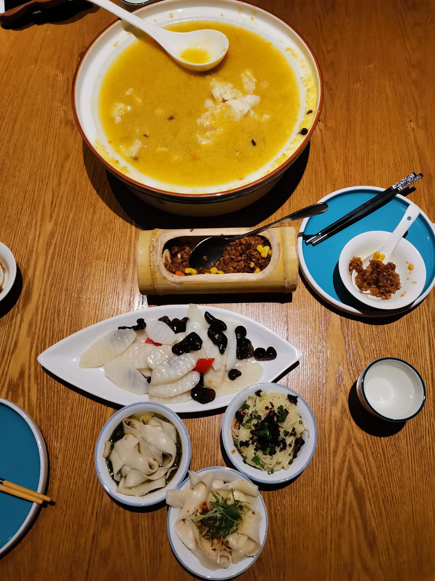 晶泽雅厨是杜甫草堂附近很有名气的中餐厅,尤其是招牌首创人生果狮子头是很多人都安利的新派川菜,这次我们来就是为了狮子头来的[呲牙]。狮子头用一个大盘子装着的,盘子下面还有连着一个瓷盆烤着小火,保证狮子头不冷不变形。大概上桌几分钟后就有店员小哥戴着手套帮忙把狮子头切开,切成一块一块的才方便好舀。狮子头里有鱼有虾有人参果等,口味清淡富有营养,汤汁鲜美好喝,不愧为创新招牌菜。小份的腊味竹筒饭就够两个人吃了,里面还有玉米,味道不错。我们还点了3种口味的面食各来一碗,而且请店家再加点油泼辣子时,厨师和服务员都很大方地帮我们再泼了辣子,态度非常好的。最赞的是餐具是用放在专门的高温蒸汽盒里高温消毒,服务员也是当着我们的面戴着手套拿出来了,卫生方面做的太好了!