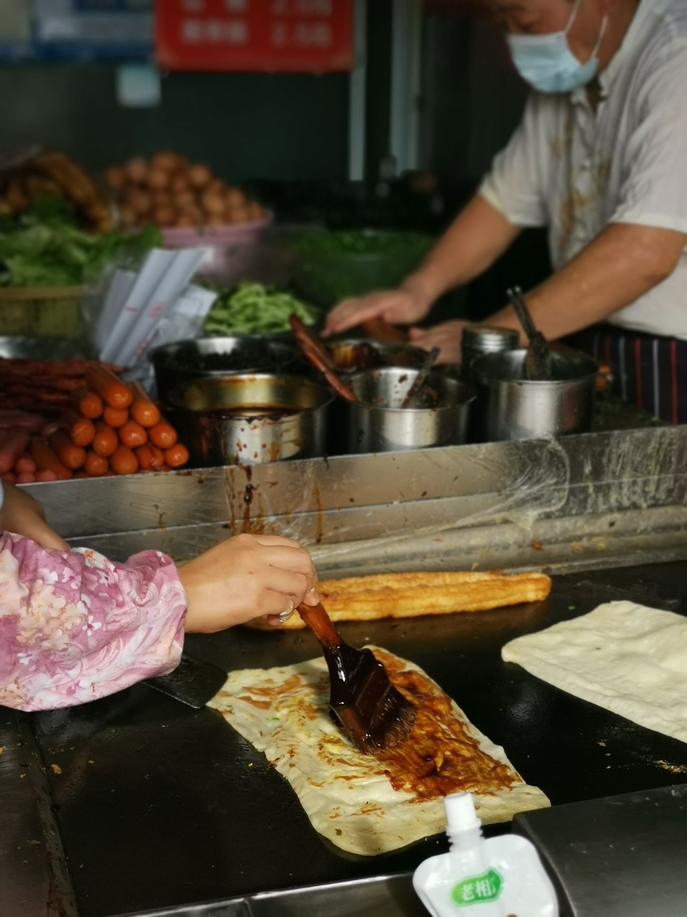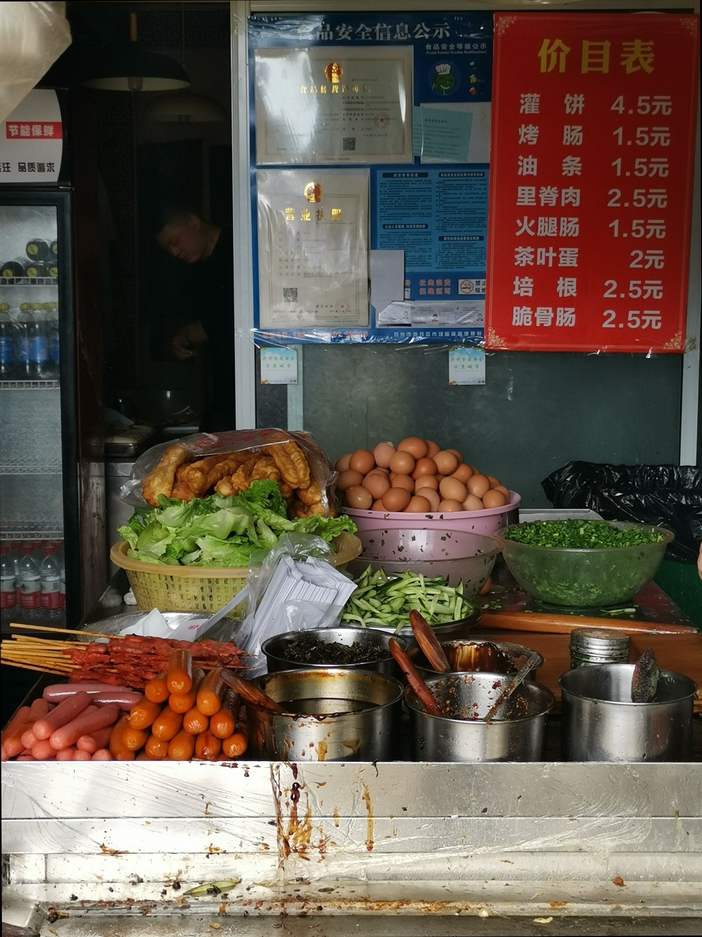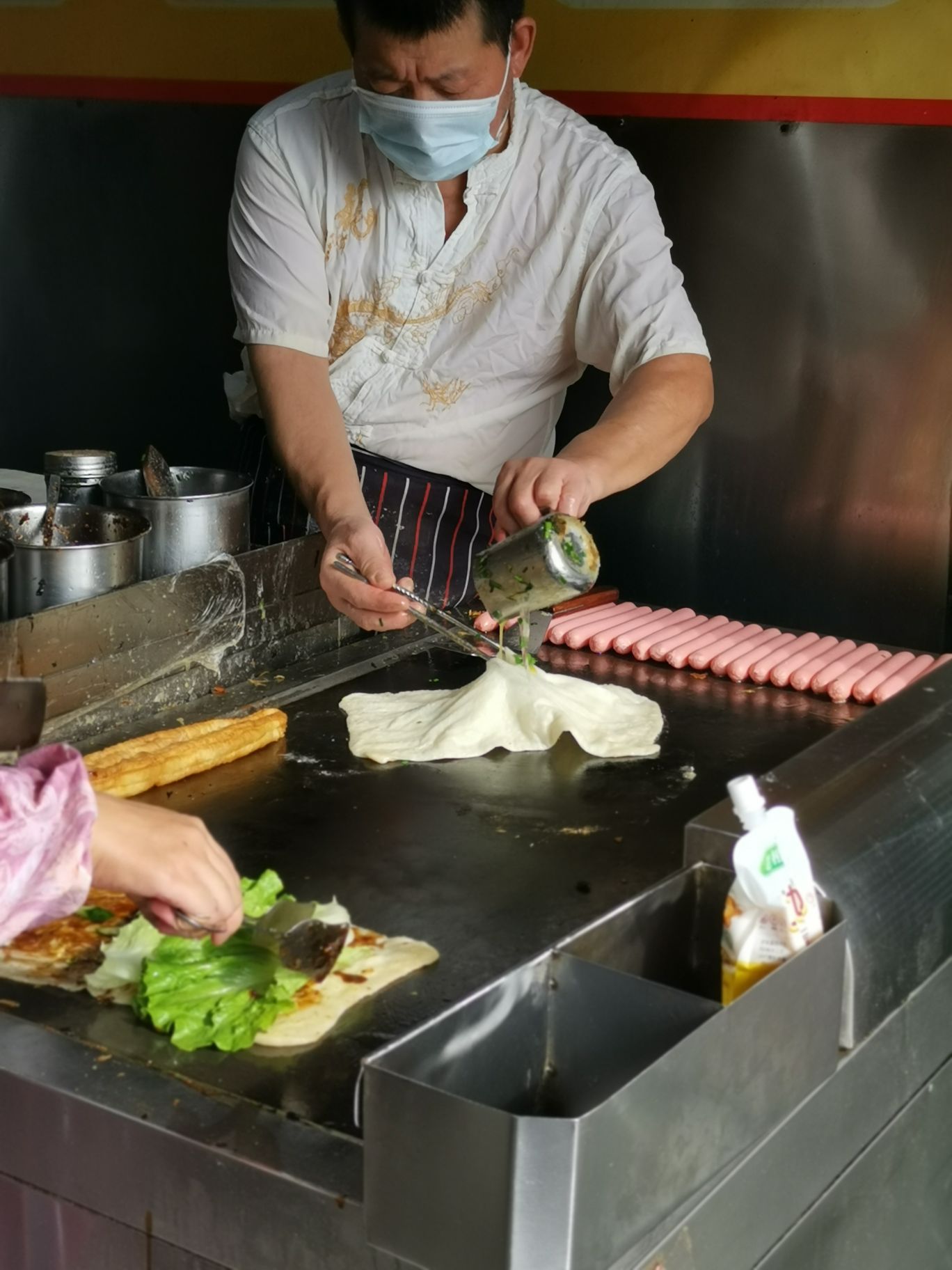 在上海还蛮少吃到鸡蛋灌饼的, 主要是蛋饼和包脚布居多。 这家店是在刷首页的时候看到的, 顿时勾起了我的味蕾,赶紧收藏哈哈哈哈。 应该不算网红店吧, 到的时候没啥人,属于正常的小摊经营日常。 👉鸡蛋灌饼 看别人都是加油条啊,加烤肠的, 对于刚吃饱的人来说就来个标准版吧! 鸡蛋灌入饼皮中煎制, 再加上黄瓜丝,酱菜和一片生菜。 涂上调制过的甜面酱,鸡蛋灌饼完成! 还蛮好吃的,口跟蛋饼差不多, 好吃就对了✔️这样一份也就4.5,合理合理👌 🍽【美食攻略】 📍详细地址:(苏州)凤凰街306号 🚗交通攻略:凤凰街上步行即可 🕙营业时间:6:00~21:00 💰人均消费:5元