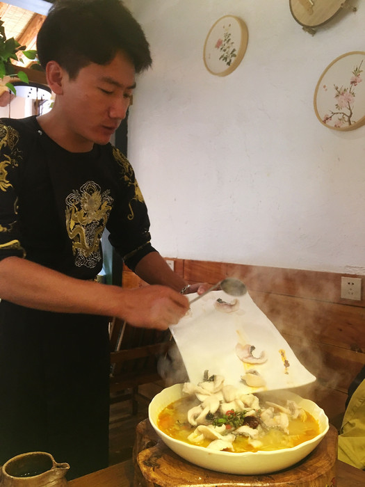 看着网上的评论很棒就过来了,服务员根据我们的口味推荐了几个招牌菜,椒花椒鸡炒的麻香入味的味道很好吃,糯米排骨上面裹着一层糯米,趁热吃很好吃一点也不油腻,蘸料也是很丰富。段氏潜龙跃水鱼,先上汤,在网里面放入高温石,瞬间加热汤,再放入鱼片,过了几分钟就可以吃,很美味,他们家的果酒很好喝,喝了两壶,度数低淡淡的花香味,喝着有一点点回甜。