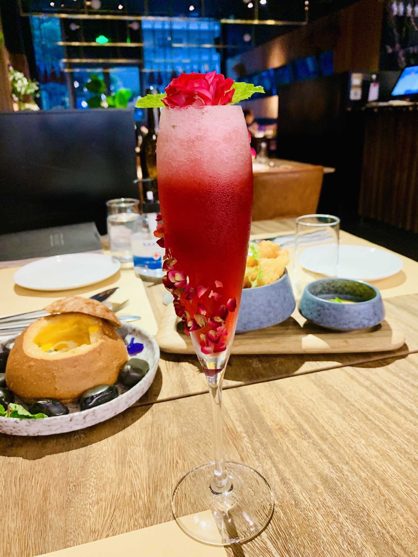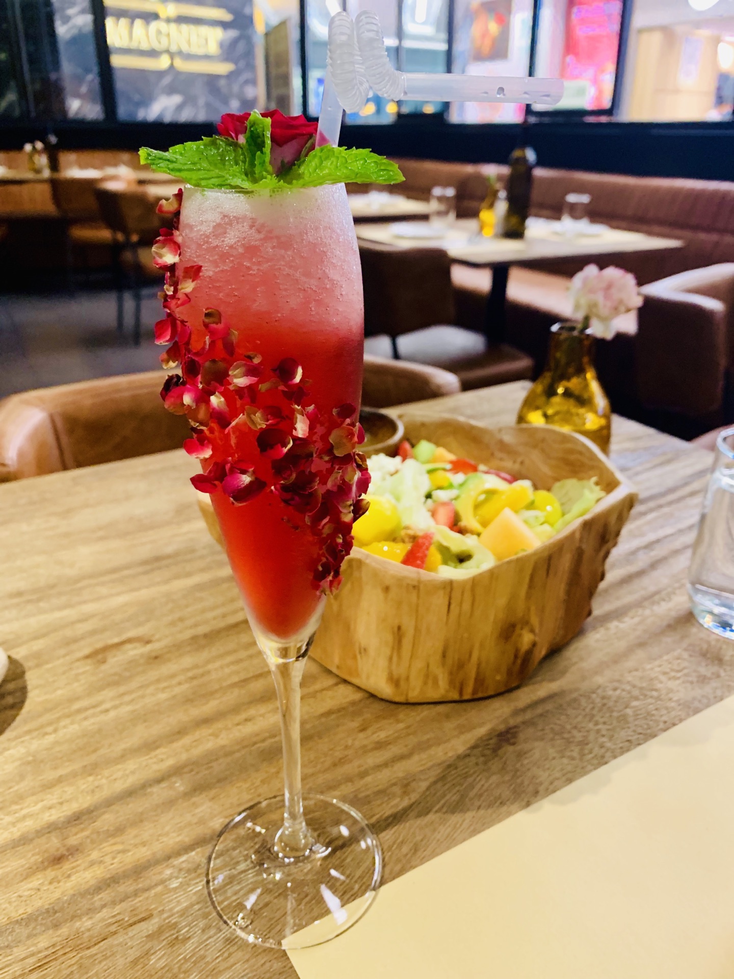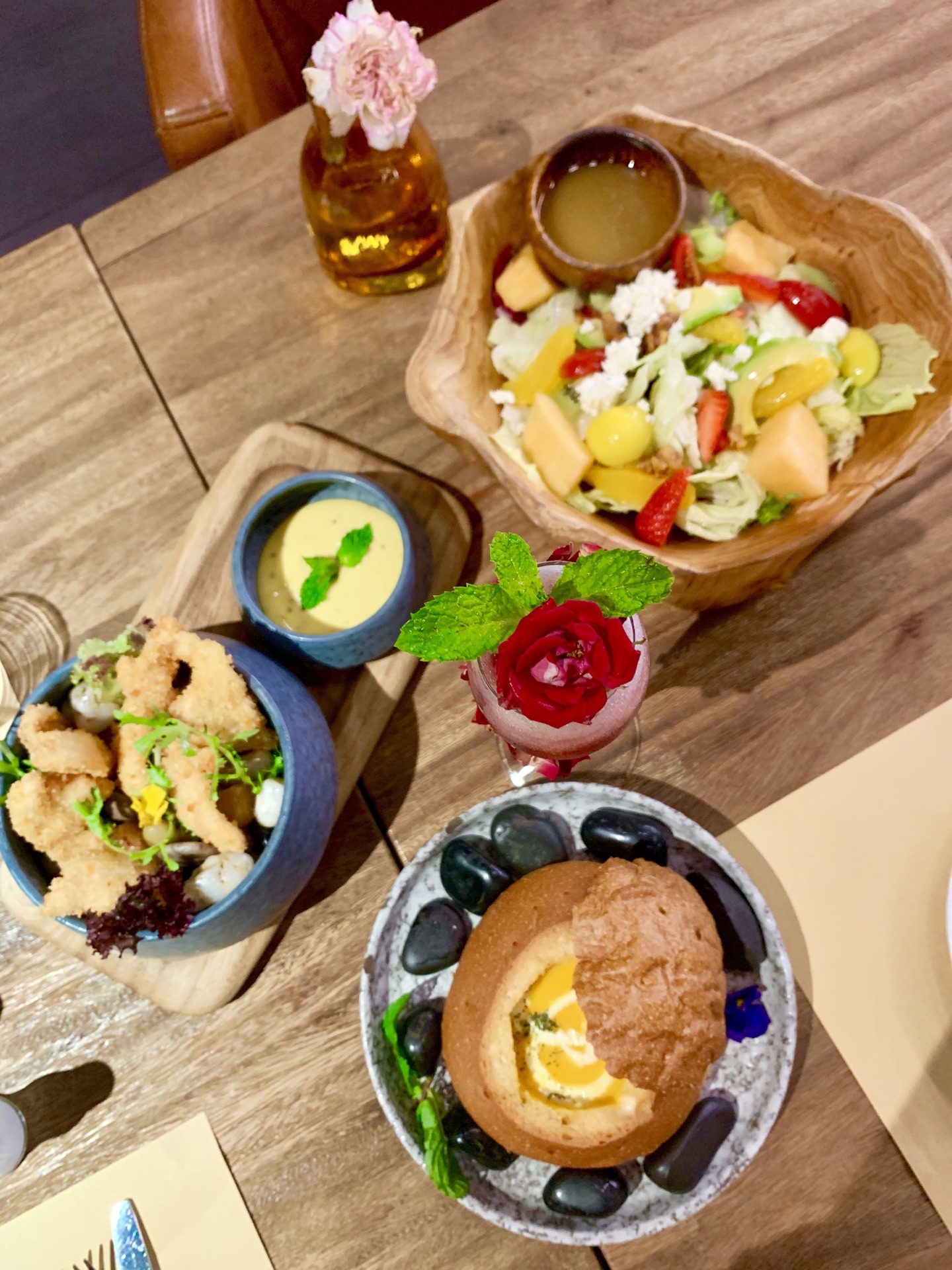 一家挺注意摆盘的简餐厅,餐厅环境布置得很适合闲聊,鲜花烘托氛围得当。直接选了特惠双人套餐,色拉、汤、主餐、小食搭配的很丰富,上菜速度超快。套餐里的田园色拉非常新鲜,搭配的羊奶酪真适合个人口味。浓浓的的面包汤,连壳都能吃下。主菜选了牛排,感觉肉质一般般,煎得恰到好处,很嫩,不用配酱更喜欢原汁原味。主食海鲜宽面奶油味正浓[强]感觉主食类做得不错。大虾另点、感觉很普通。这里的饮料也是很噱头,适合拍照,口味也就如此没有被惊艳到。所以来这简餐主食最合适,味道不错,牛排类还是去牛排馆吃比较好。