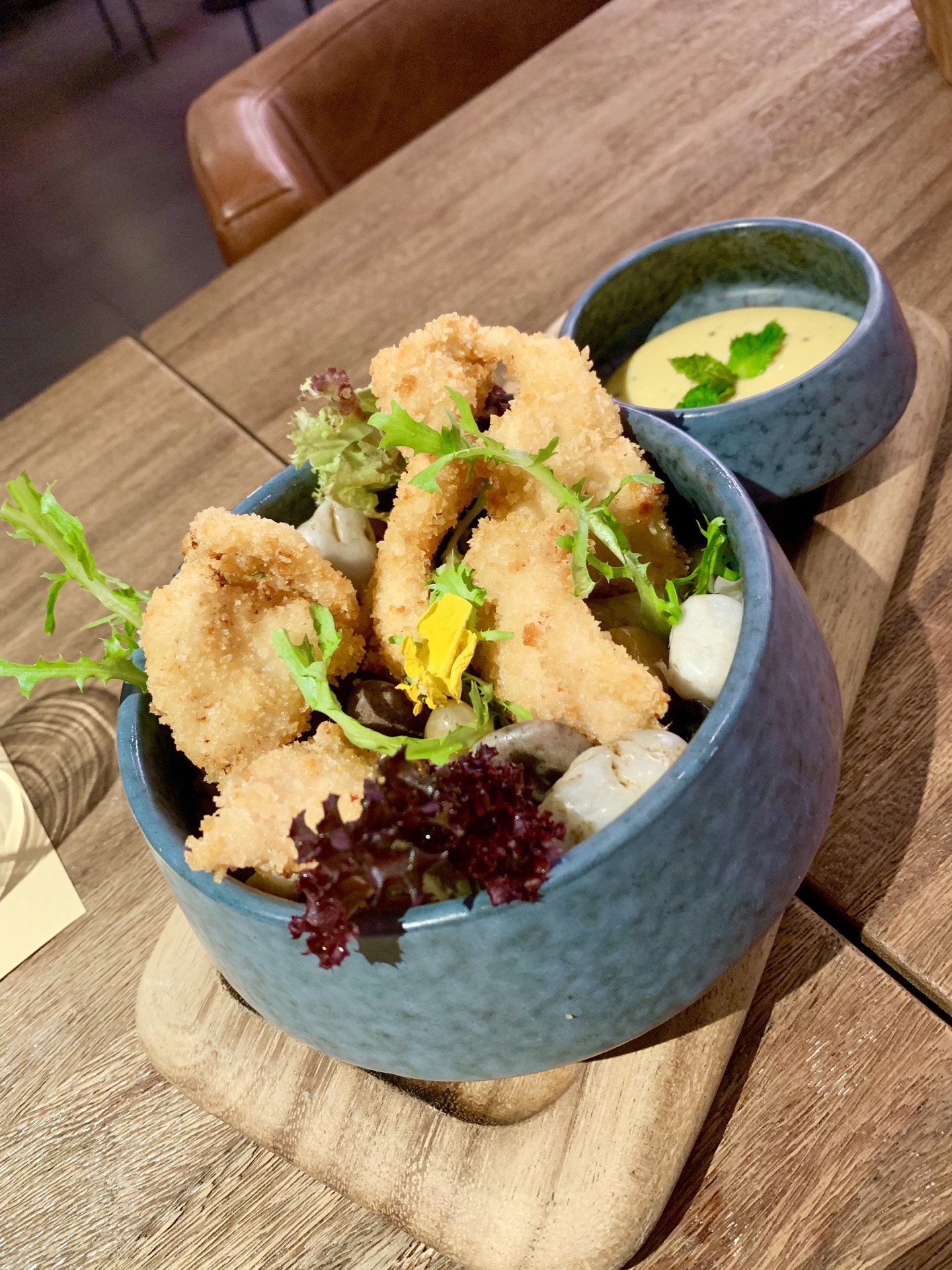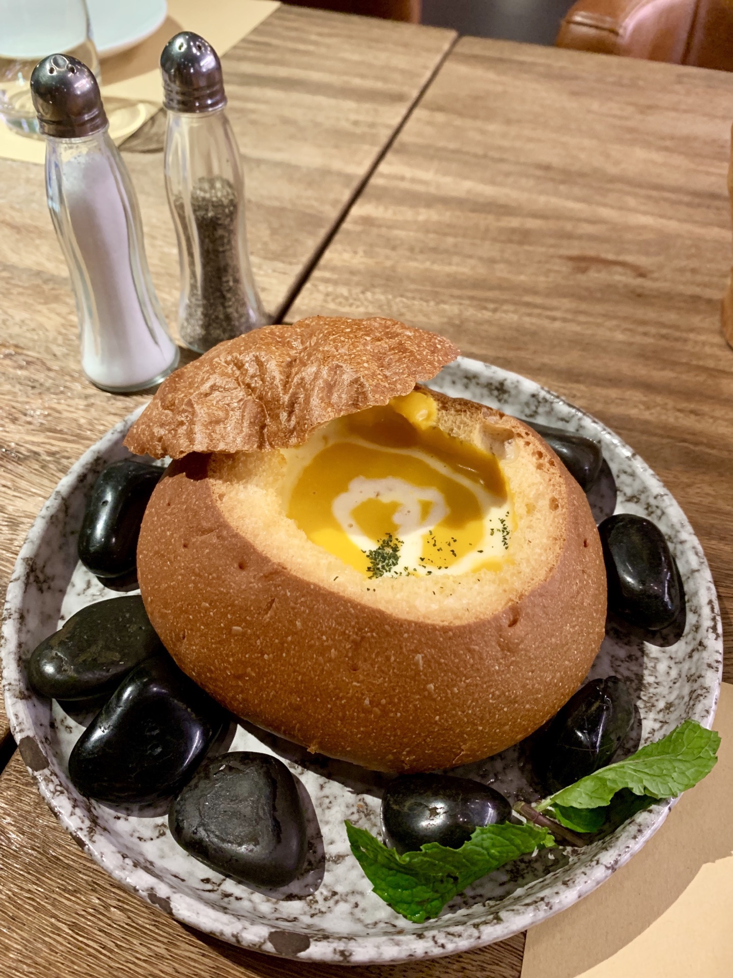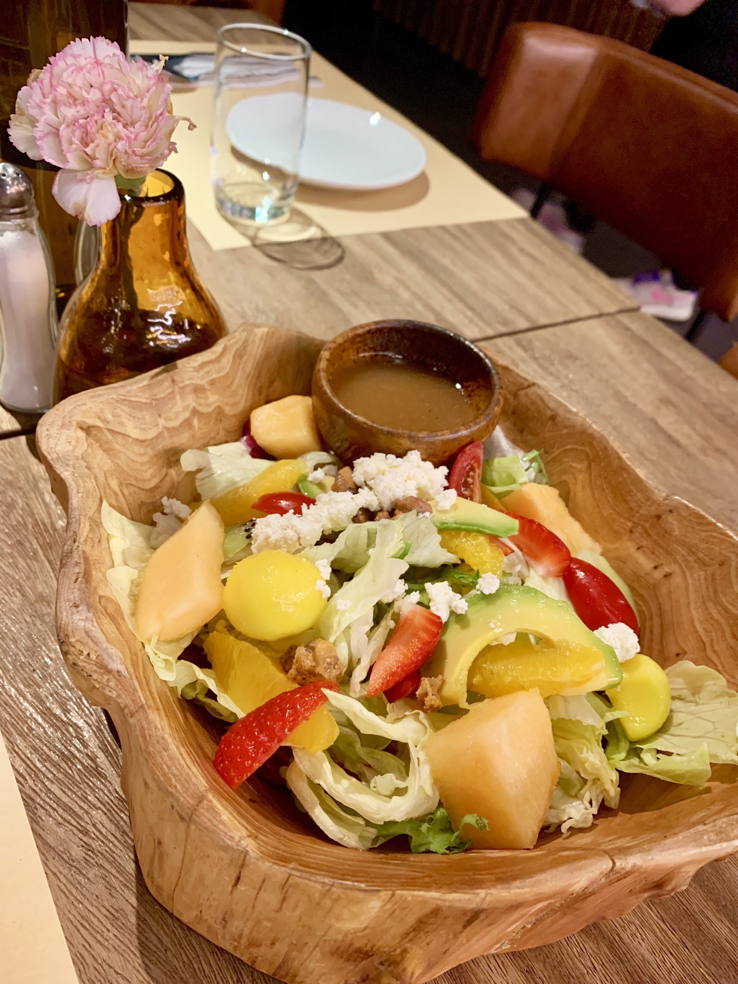 一家挺注意摆盘的简餐厅,餐厅环境布置得很适合闲聊,鲜花烘托氛围得当。直接选了特惠双人套餐,色拉、汤、主餐、小食搭配的很丰富,上菜速度超快。套餐里的田园色拉非常新鲜,搭配的羊奶酪真适合个人口味。浓浓的的面包汤,连壳都能吃下。主菜选了牛排,感觉肉质一般般,煎得恰到好处,很嫩,不用配酱更喜欢原汁原味。主食海鲜宽面奶油味正浓[强]感觉主食类做得不错。大虾另点、感觉很普通。这里的饮料也是很噱头,适合拍照,口味也就如此没有被惊艳到。所以来这简餐主食最合适,味道不错,牛排类还是去牛排馆吃比较好。