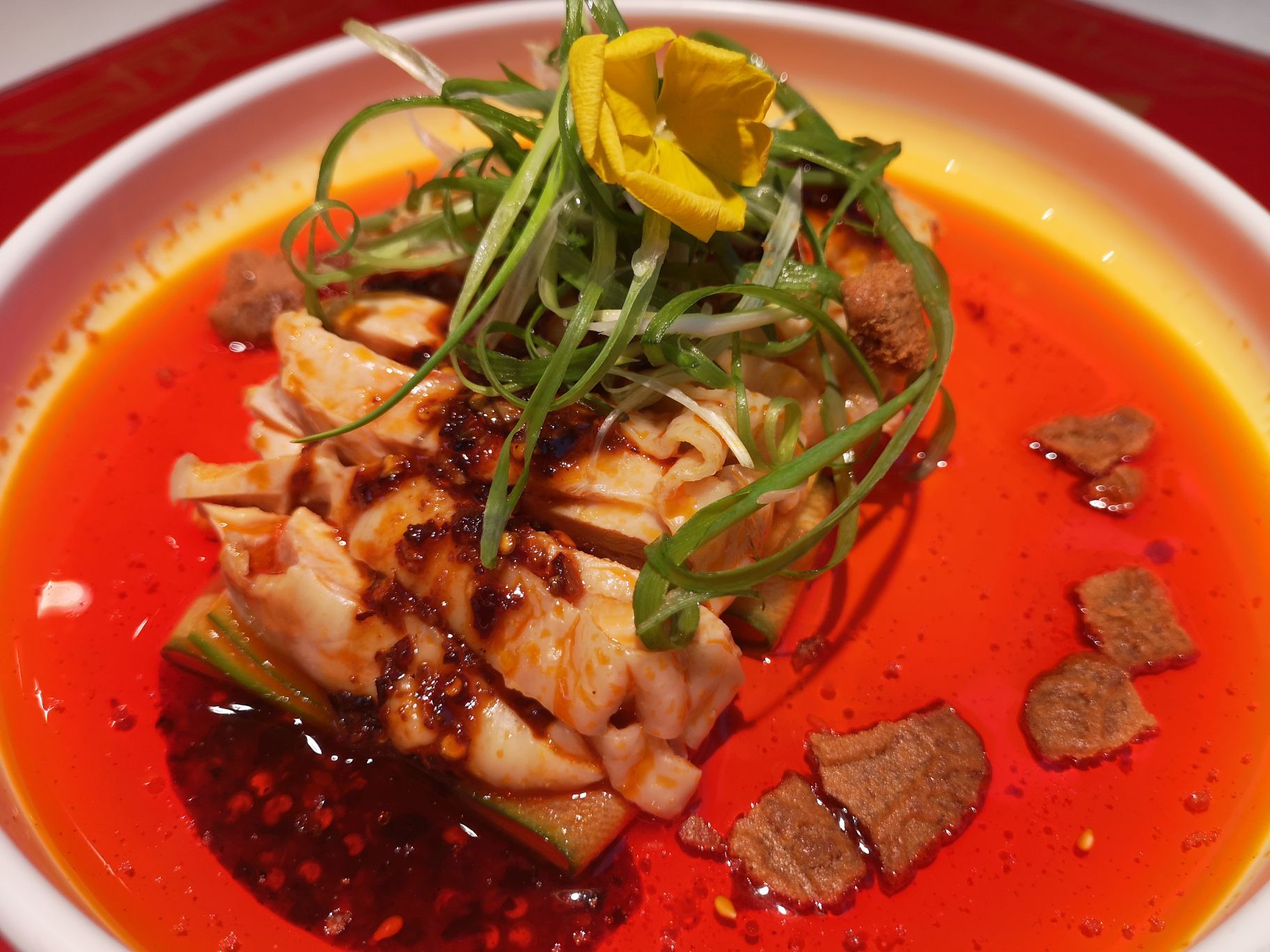 推荐配肥肠和金针菇,不能吃辣的也可以试试爆炸葱香味或黄金蒜香味,口水鸡作为前菜比较开胃,鸡肉有点弹牙