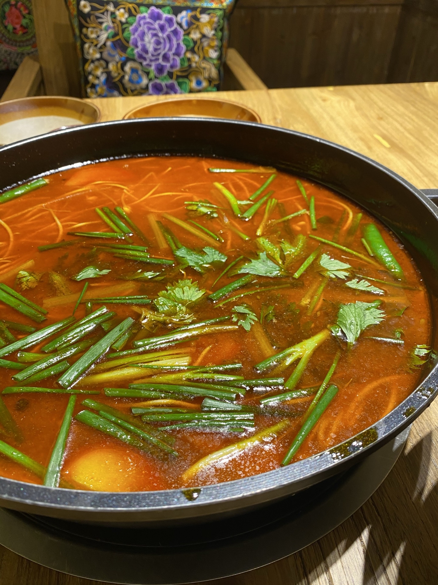 来贵阳第一天的晚饭,特意选了点评榜上第一名要打卡的餐厅,简直绝了[OK]。晚上9点到的,前边还排了40多号,火成这样!让我对这顿饭充满了期待!中间有很多空号,也是等了20多分钟就落坐了,因为是吃火锅🍲,冷气吹得很足,扫码点餐。 「酸汤锅底」特色锅底,肯定得尝尝,从电梯里就闻见的味道,一股浓浓的香茅草的味道,果然是酸汤,酸的彻底!奉劝各位北方的小伙伴不要轻易尝试[流泪]…真是酸到不行…服务员💁♂️小妹儿热情的调了一碗蘸料…直接给我辣到起飞🛫️…蘸料也可以自己调,不能吃辣的提前说啊!!! 「牛腩肉」牛肉还是蛮新鲜的,挺有嚼劲的,但是也就是不好不坏吧。 「牛黄金」没听过的名字,所以就点了,看其他点评说是脆脆的口感,结果根本不是,嚼了半天都不带烂的,像猴皮筋儿一样的口感。应该是牛肉的筋膜部分的肉…总之体验贼差… 「牛雪花」点了,但是半天没上,最后退了。 「蔬菜台」基本都是南方的蔬菜,北方的常见菜一个都没有,好多都是没吃过的蔬菜🥬,还蛮长见识的。只是蔬菜🥬到了酸汤锅里,稍微煮久一些就会变成酸菜的颜色,让人分不清是锅底料还是蔬菜了[抓狂]~ 「按人头计算的米饭」最后上了一桶米饭🍚,嗯,吃饱了! 【服务】 有一说一服务员小姐姐态度都超级好,热情[爱心]还贴心,服务态度超好! 总之还是推荐来尝尝的毕竟是特色,不过也要做好踩雷的准备,毕竟南北方口味差异巨大,小伙伴做好心理准备前往~