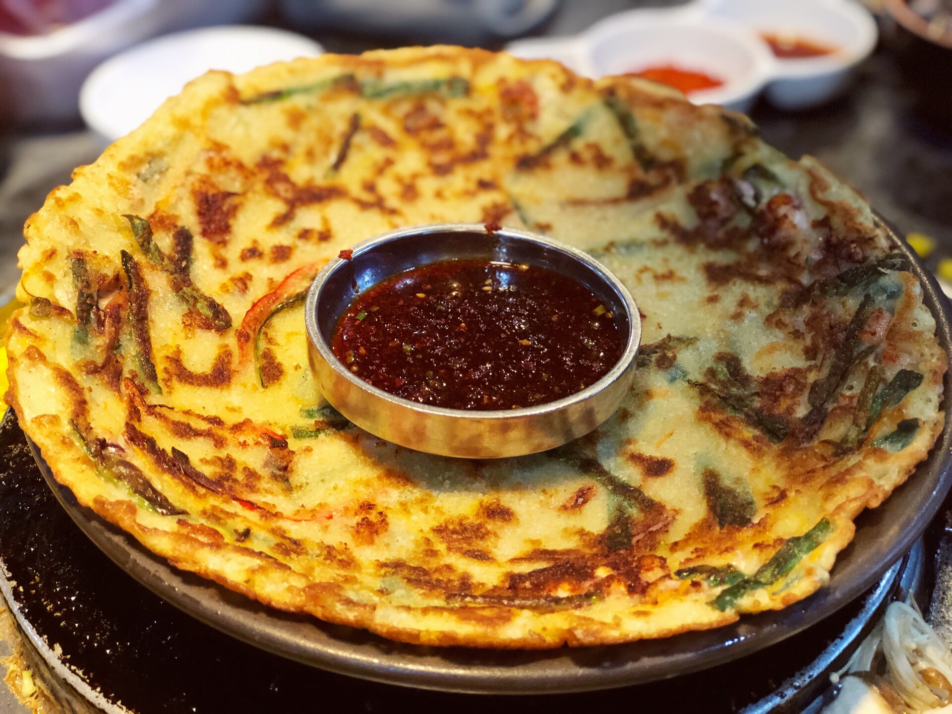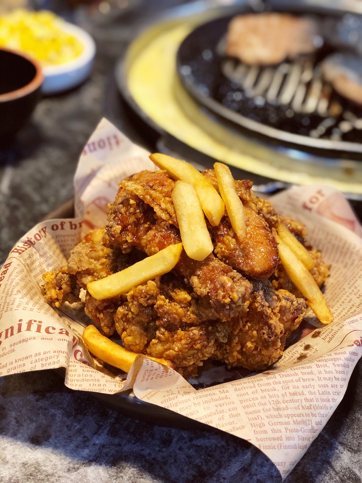 韩国烤肉在上海的生意真好啊,咕的咕的炭火烤肉吃的就是热闹,晚上都爆满的哈! 就在轻轨下面的店铺,靠近地铁3号线大柏树站,交通便利! 桌子挺多的,去的晚了旁边的沙发位没了,中间的小圆桌有点挤,菜上了摊不开的感觉! 每桌都送10几碟小菜和南瓜粥,丰富的来,还没吃烤肉就可以扫一圈,烤盘外圈有玉米炖蛋菌菇! 「和牛牛排肉」原味的,肉质看着挺不错的,烤好吃起来有嚼劲,还不错哈! 「调味梅花肉」肉质一般,味道一般! 「呵妮黄油炸鸡」炸鸡可以点半只的,选了蜂蜜黄油味,口感偏甜,鸡肉挺嫩的,里面还加了薯条! 「海鲜韭菜饼」蛮香的,蘸酱有点咸辣,不蘸吃原味也还好,总体没什么惊喜! 可以让服务员帮忙烤,不过一个服务员要负责几桌,烤一会就要几桌轮流走,也是很忙碌呀!