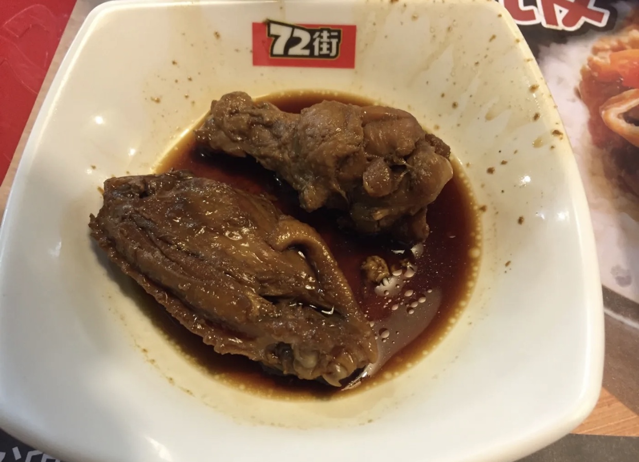 这家72街连锁快餐店位于中山路与东川路交接,在地铁从东川路那个出口出来,你的右手边就是了,楼下一楼只有一个柜台,专门是外卖送餐使用的,让送餐员在那里交接的,所以客人需要到二楼去,二楼的地方很宽敞,一直走到里面才是点餐的柜台,当时我有一些免费券,必须要有任意消费才可以使用一张券,服务员对着我有点不太耐烦了,因为我手上有好多张券,每一次都需要在手机上面按确认,才可以下单,然而我又分开了很多次下单,因为我要尽量把手上的券都用完,在这下单,备餐,询问,再下单,再备餐,再询问的过程中,服务员显得有点不耐烦了。 吃了一份冬菇滑鸡饭,和都城快餐的经典餐相比差不多,72街的饭都是原盅炖饭来的,炖出来的饭更加柔软,吃的时候也是热乎乎的,鸡肉的量挺多的,很入味,没有骨头,就是啖啖肉,加上冬菇煮熟了以后,香味都出来了,连鸡肉的肉汁一起渗进了米饭,我喜欢吃有汁的饭,更好入口。 鸡翅,是卤水的,腌制的味道还不错,很入味,鸡翅的大小刚好,连里面的肉都味道十足,但是个人口感喜欢烤的那种,可能是更加香口吧。