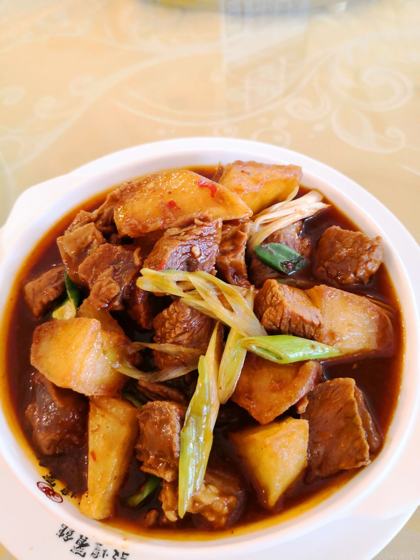 ...2菜一汤,南方人想吃这边的牛肉,首先来一个土豆烧牛肉吧,土豆油炸过,脆香内粉,牛肉大块入味软烂
