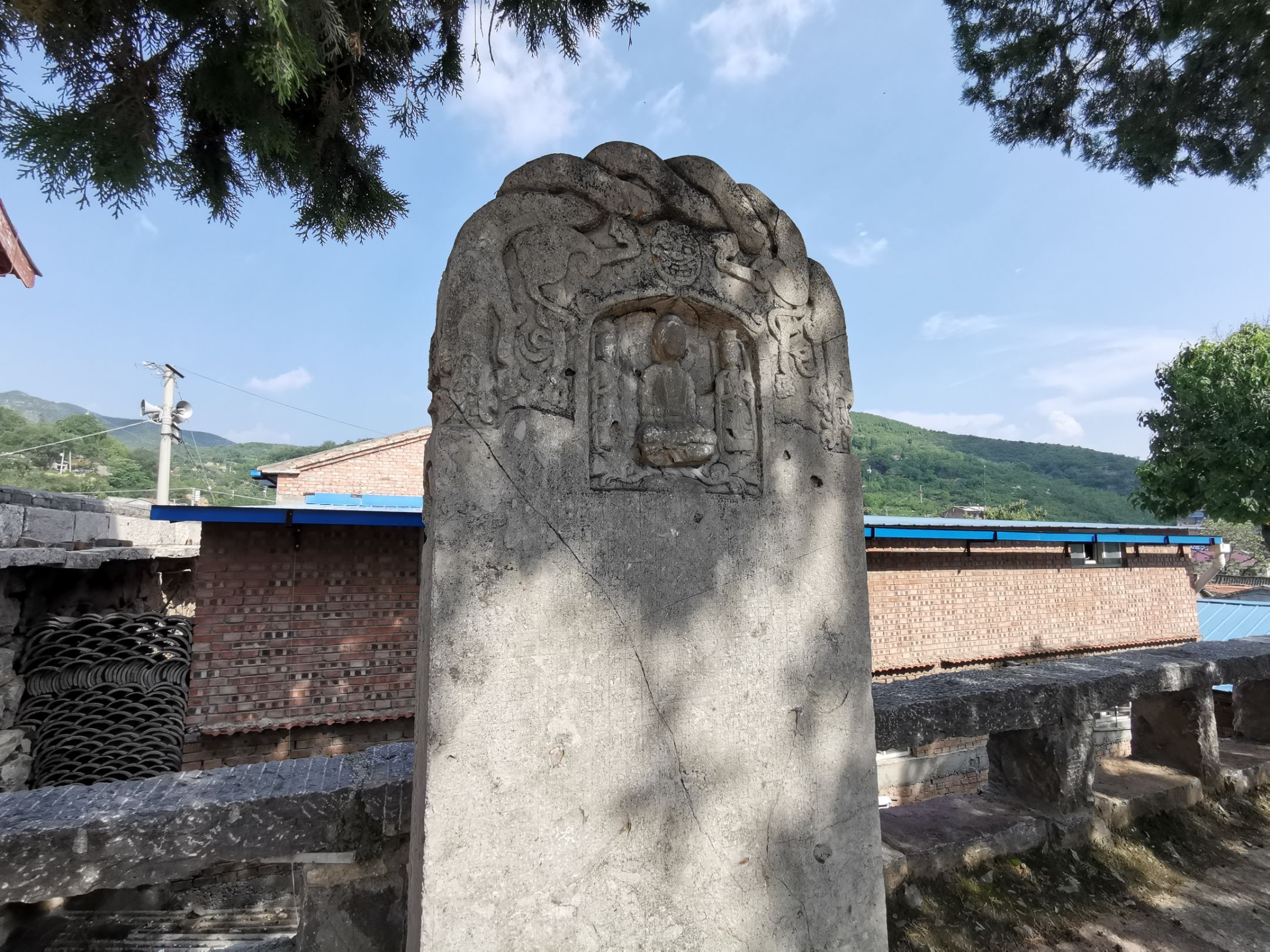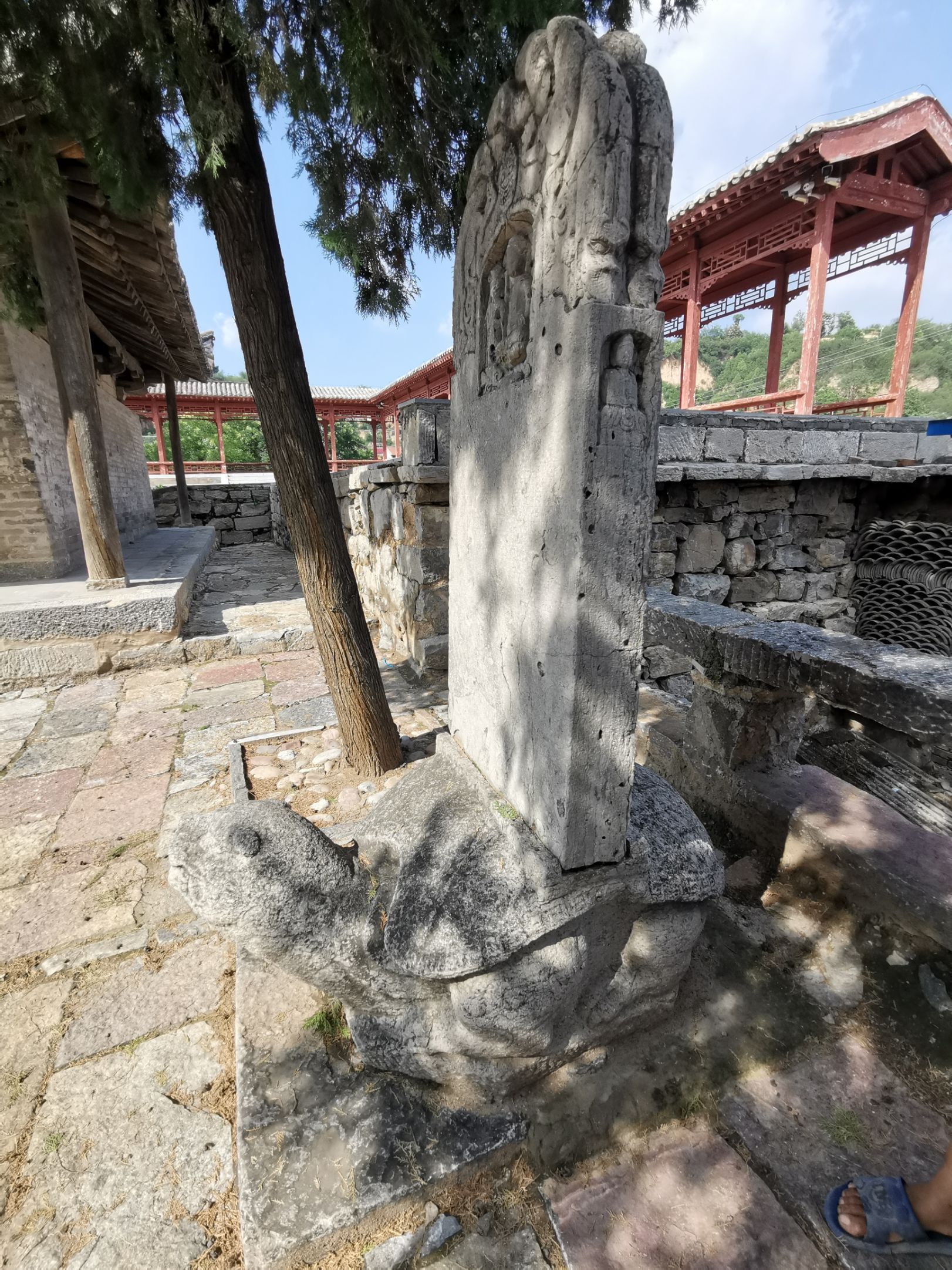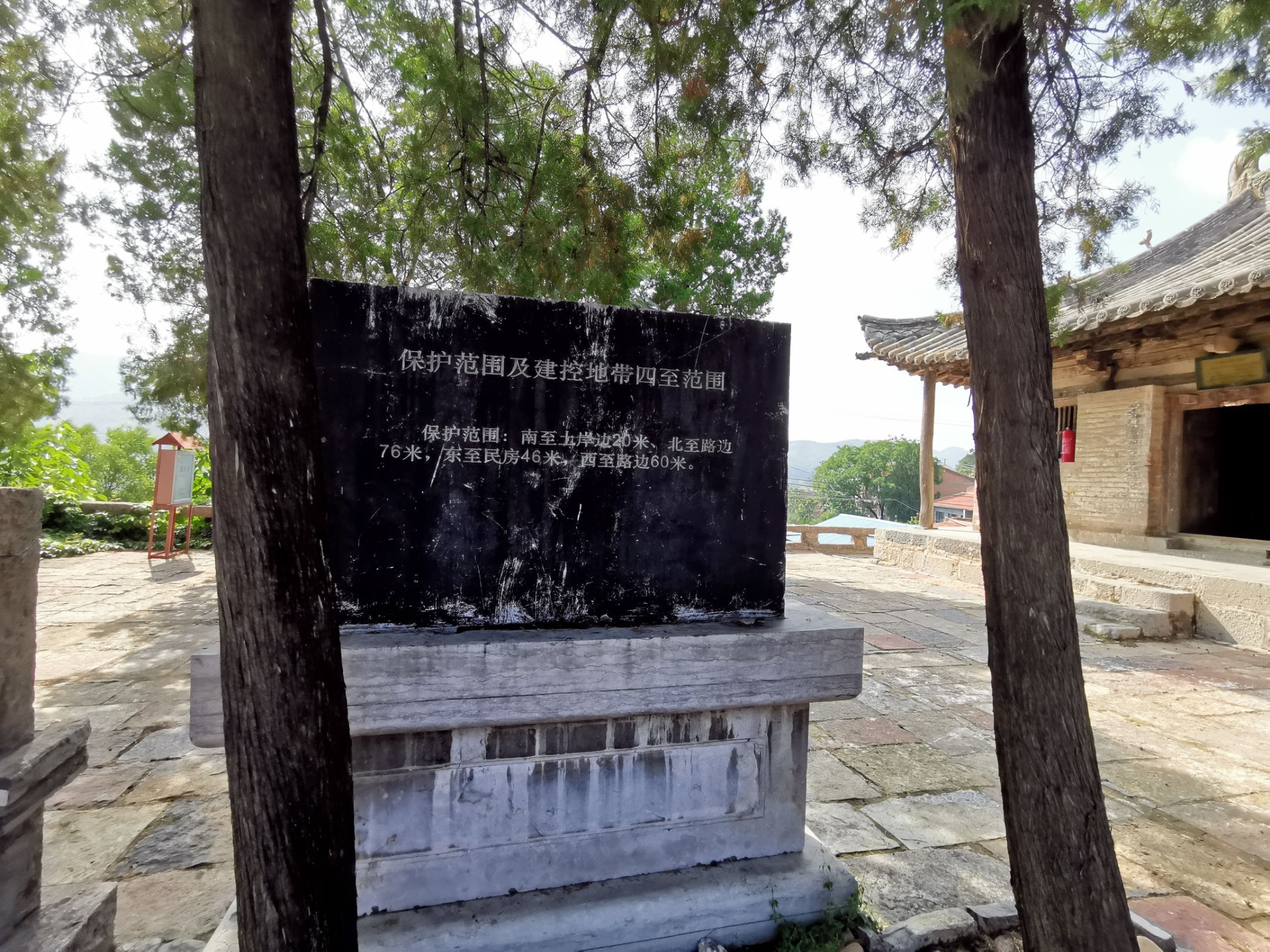 天台庵在古建的地位不言而喻。地方好找,跟导航即可到达台下停车场。天台庵建在高台之上,由北侧石梯上行入门。平时门锁不开,有专门看守人员。如吃闭门羹,可在周围打听一下,一般很快就能找到值班人员。开门进院,一方大殿孤立,几棵侧柏扶荫。殿前有唐碑斑驳,店内有画栋隐现。台下已改做当地办公行政场所,四周村民居房林立。看守者尽职尽责,兼任讲解,为我解释庵和庙的区别,指导我去看梁上唐代彩绘,以及泥墙后面的壁画(脑补)。不虚此行。