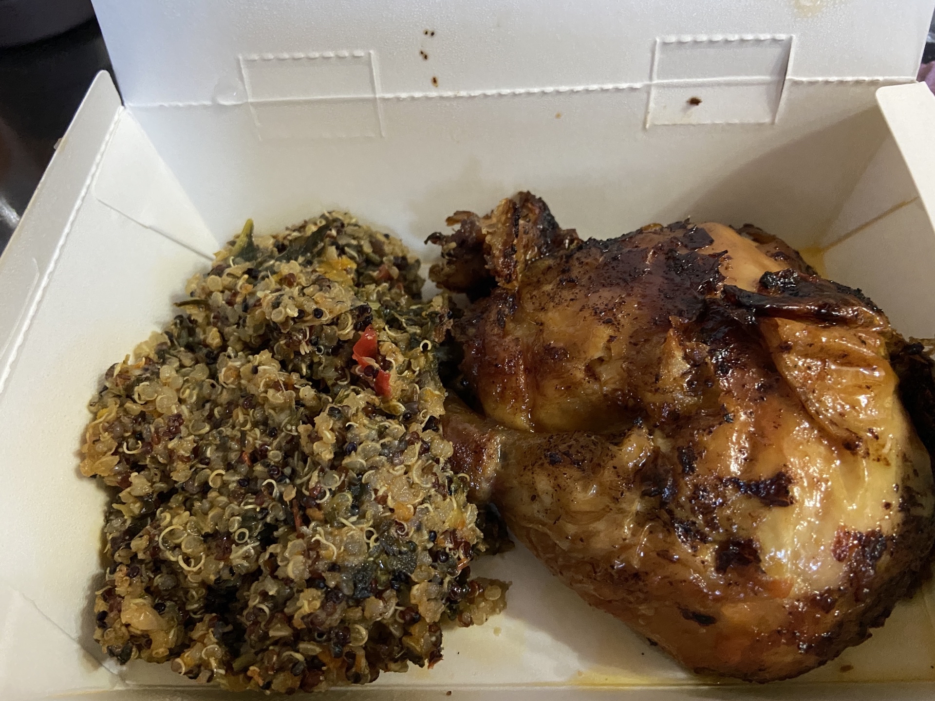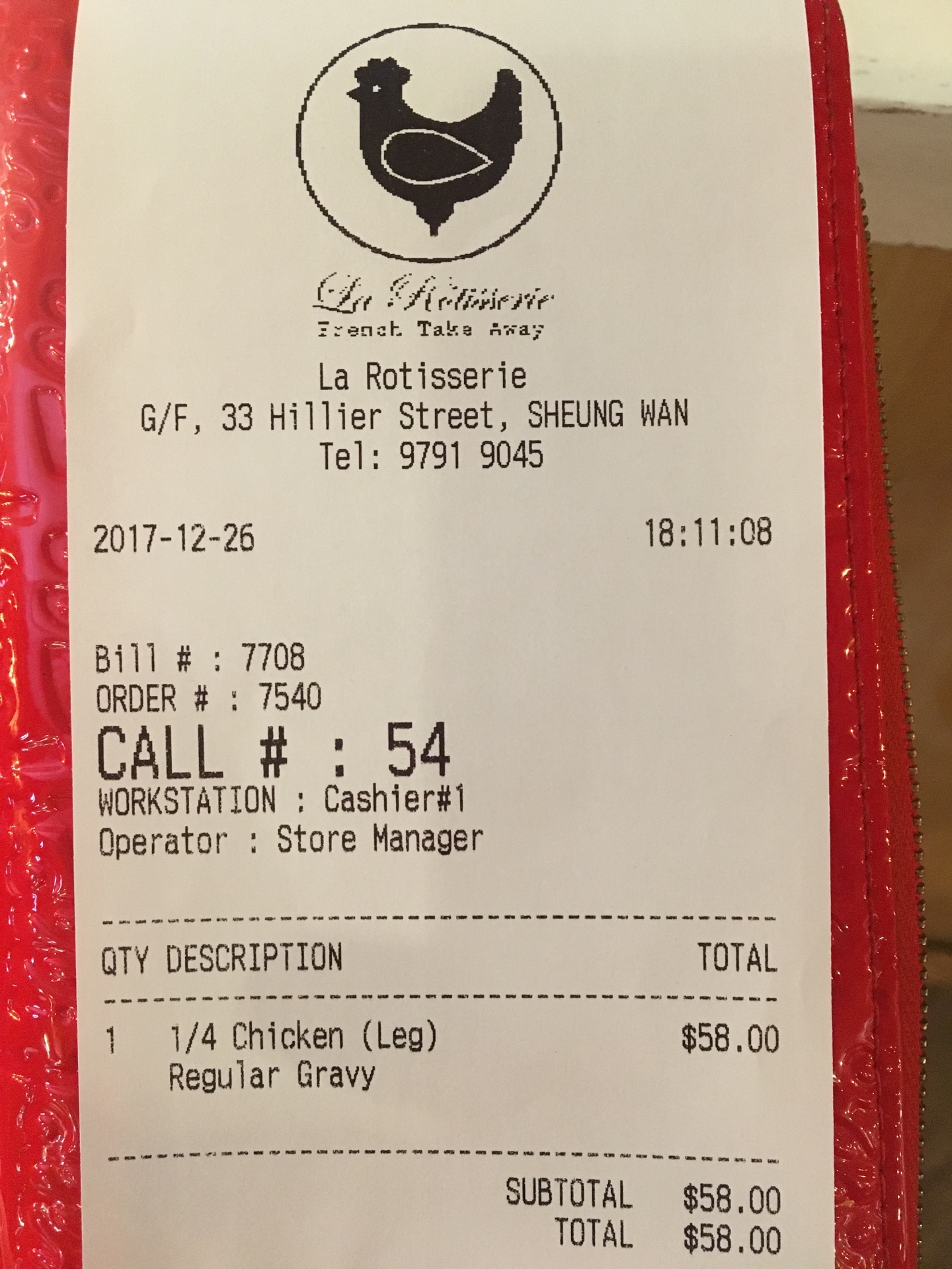 就在香港网红步行街利东街的附近,法式的一家烤鸡店。店面小小的只能外卖,烤鸡的主要配菜是土豆,这一次这个点的是什么我都不太记得了,炒杂菜?1/4鸡腿58块钱,一个人吃差不多刚刚好,烤鸡有香草的味道,吃到里面有一点柴,但是外面还是很好吃的,最好是再配一杯啤酒。