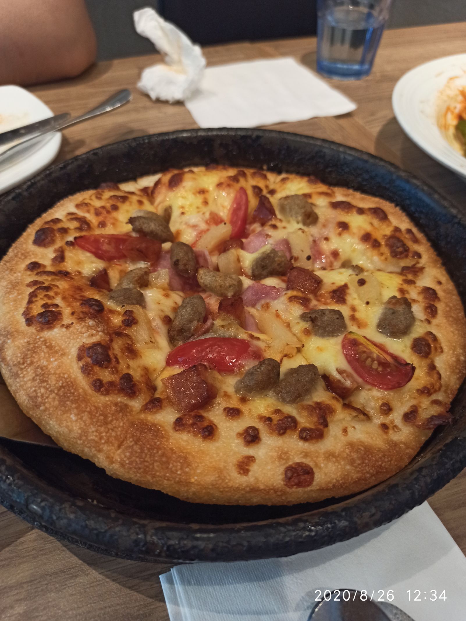 周三的必胜客简直不要太划算~夏威夷肉多多披萨才29,今天的披萨做的很不错,火候口感都正好的~肉眼牛排39,虽然不太能保证是原肉还是合成肉,但是挺嫩,孩子吃正合适~再来个意面,两个人100块就够用了。服务也很好~