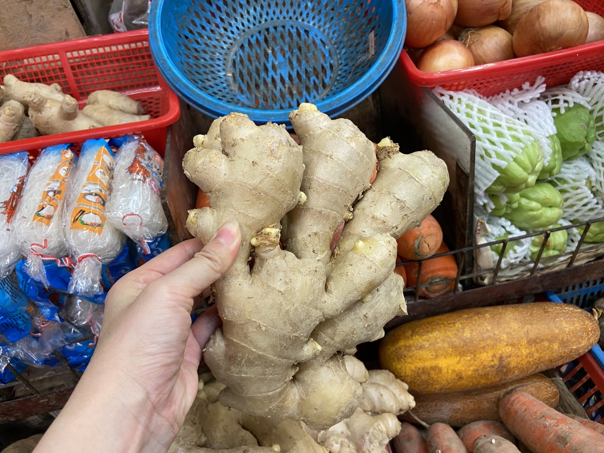 ...价格肯定比大陆的贵,我看品种也不太一样,尤其是这个生姜,怎么会有这么大块的姜啊,比我手掌还要大