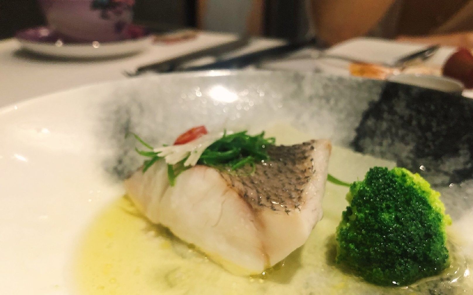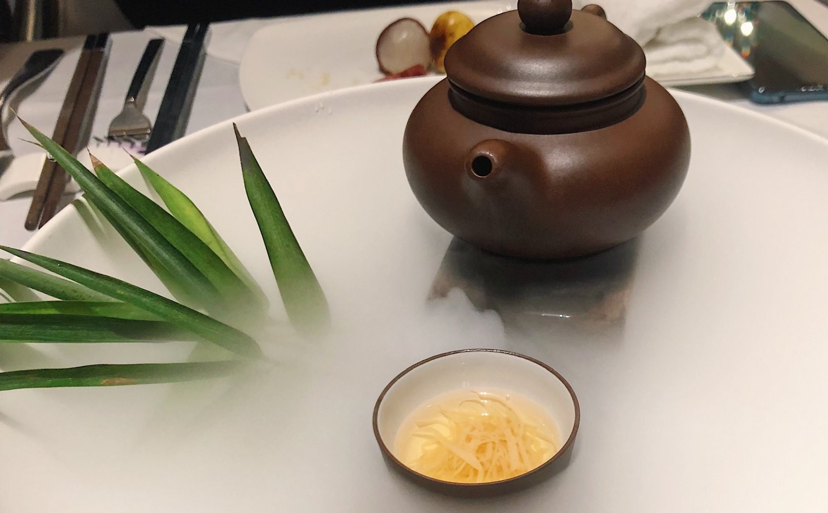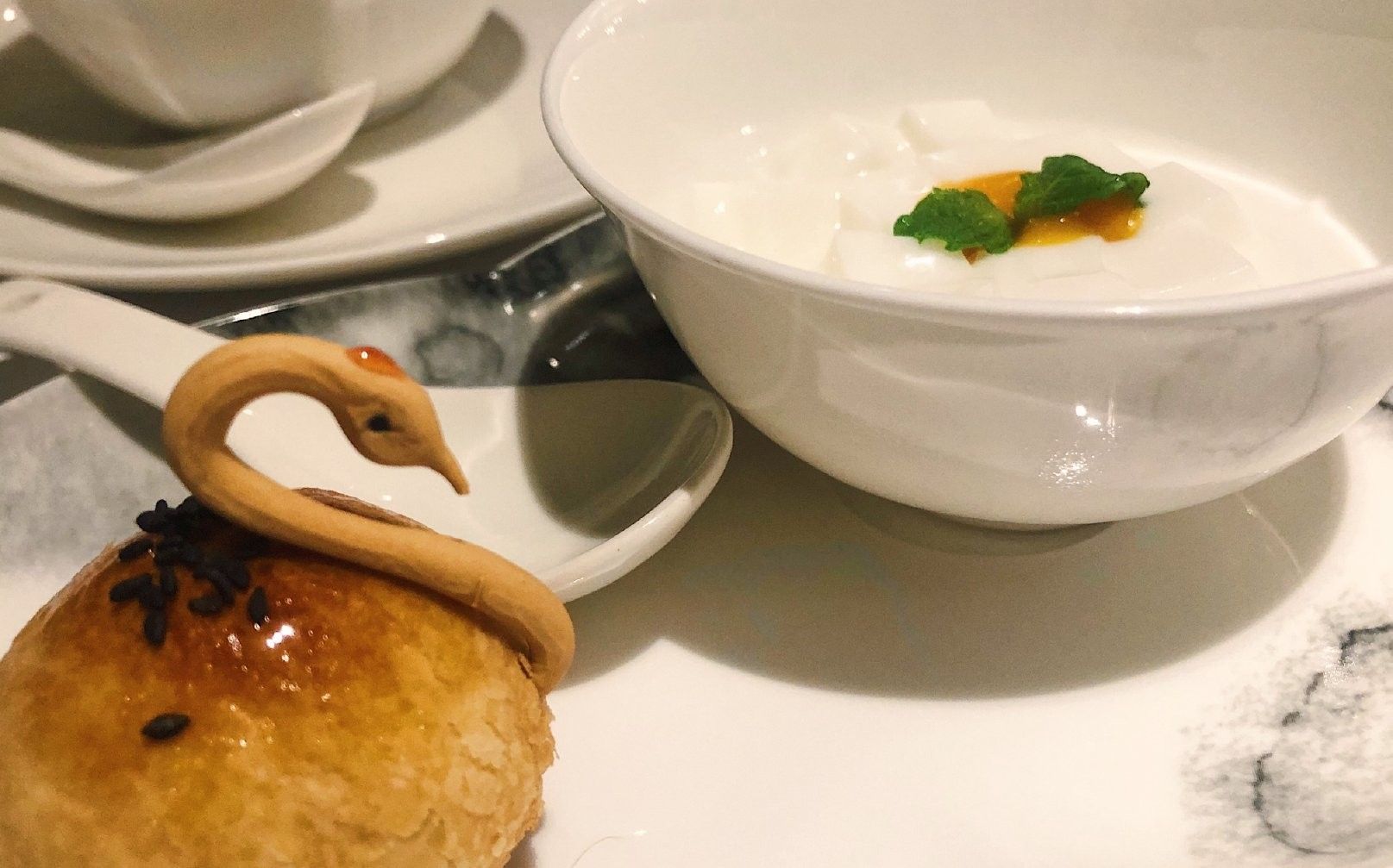 精致但不经吃的【精选三式头盘】 海鲜(海蜇) 蔬菜(应该是瓜类吧) 烧鹅组成。颜色上官方说是由浅入深,海蜇比较爽口,酸酸的比较开胃,瓜类很脆,凉凉的,夏天很舒服,烧鹅,肥瘦相宜,口味比较清淡。 颜值满分的【钱湖仙境】 腾云驾雾的鸡汤,是放在茶壶里面的,这一道菜可以说是惊喜,因为鸡汤可以做得毫无油腻感,真的是还挺考验功力的,杯中应该是药材类的食物,汤,入口有一种茶的感觉,干净,纯粹,柔和,似乎还有点甘甜,配在边上的小笼包皮薄,会爆汁,不油腻。 并不出彩的【松露和牛礼物盒】 应该就算是牛排吧,大概七八分熟,手掌般大小 黑松露配上牛肉没有违和感,但是就是感觉没有太多出彩的地方。 吃法奇特但口感一般的【橄榄油火焰虾】 虾大概一共两只,完全浸泡在油里,感觉有点像是一道川菜,上菜了之后,服务员会点火,让整个石锅熊熊燃烧,蒜香味很浓厚。 肉质紧实又鲜嫩的【招牌米鱼】,有点像是我们本地的清蒸咸米鱼,但是米鱼很新鲜,肉一丝丝的,很飘逸,腌制的咸度也刚刚好,保留了鱼的鲜味,符合本地人的口味。 家常【翠绿时蔬】 广东菜心,碧绿,青翠,但是,非常家常,口味比较清淡,适合夏天。 没发现内涵的【花雕竹丝鸡炒饭】 官方称是内藏乾坤,惊喜不断,但是我好像没发现, 感觉就是一份清爽不油腻的鸡丝炒饭,饭量刚刚好, 花雕酒有提味。 甜品类【杨枝甘露>天鹅酥>杏仁豆腐】 杨枝甘露还不错,吃起来很清凉,甜度适中。