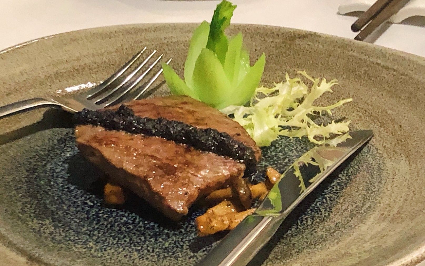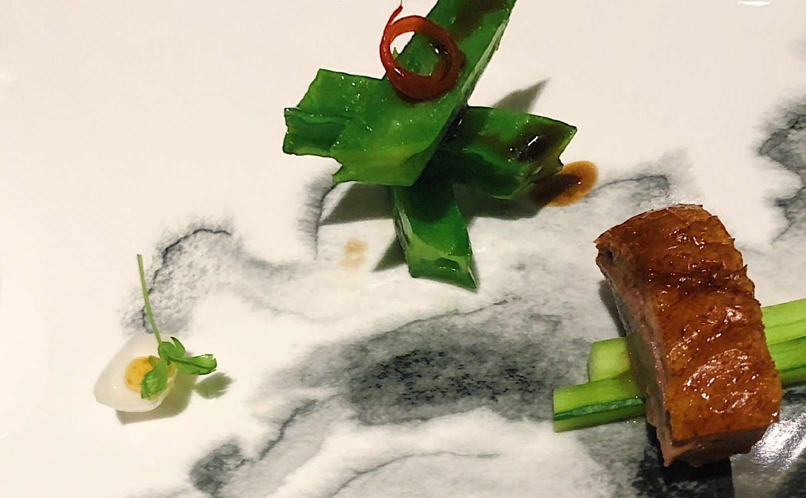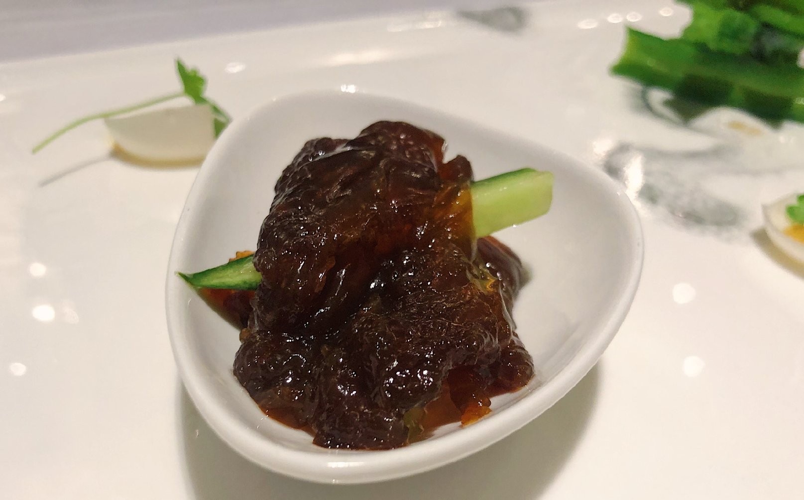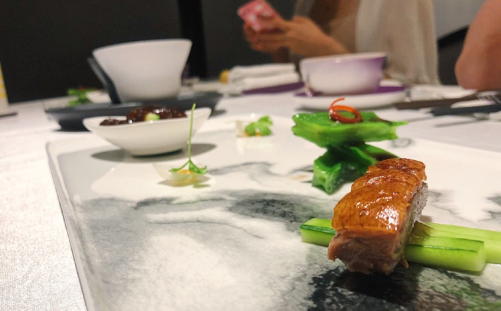 精致但不经吃的【精选三式头盘】 海鲜(海蜇) 蔬菜(应该是瓜类吧) 烧鹅组成。颜色上官方说是由浅入深,海蜇比较爽口,酸酸的比较开胃,瓜类很脆,凉凉的,夏天很舒服,烧鹅,肥瘦相宜,口味比较清淡。 颜值满分的【钱湖仙境】 腾云驾雾的鸡汤,是放在茶壶里面的,这一道菜可以说是惊喜,因为鸡汤可以做得毫无油腻感,真的是还挺考验功力的,杯中应该是药材类的食物,汤,入口有一种茶的感觉,干净,纯粹,柔和,似乎还有点甘甜,配在边上的小笼包皮薄,会爆汁,不油腻。 并不出彩的【松露和牛礼物盒】 应该就算是牛排吧,大概七八分熟,手掌般大小 黑松露配上牛肉没有违和感,但是就是感觉没有太多出彩的地方。 吃法奇特但口感一般的【橄榄油火焰虾】 虾大概一共两只,完全浸泡在油里,感觉有点像是一道川菜,上菜了之后,服务员会点火,让整个石锅熊熊燃烧,蒜香味很浓厚。 肉质紧实又鲜嫩的【招牌米鱼】,有点像是我们本地的清蒸咸米鱼,但是米鱼很新鲜,肉一丝丝的,很飘逸,腌制的咸度也刚刚好,保留了鱼的鲜味,符合本地人的口味。 家常【翠绿时蔬】 广东菜心,碧绿,青翠,但是,非常家常,口味比较清淡,适合夏天。 没发现内涵的【花雕竹丝鸡炒饭】 官方称是内藏乾坤,惊喜不断,但是我好像没发现, 感觉就是一份清爽不油腻的鸡丝炒饭,饭量刚刚好, 花雕酒有提味。 甜品类【杨枝甘露>天鹅酥>杏仁豆腐】 杨枝甘露还不错,吃起来很清凉,甜度适中。
