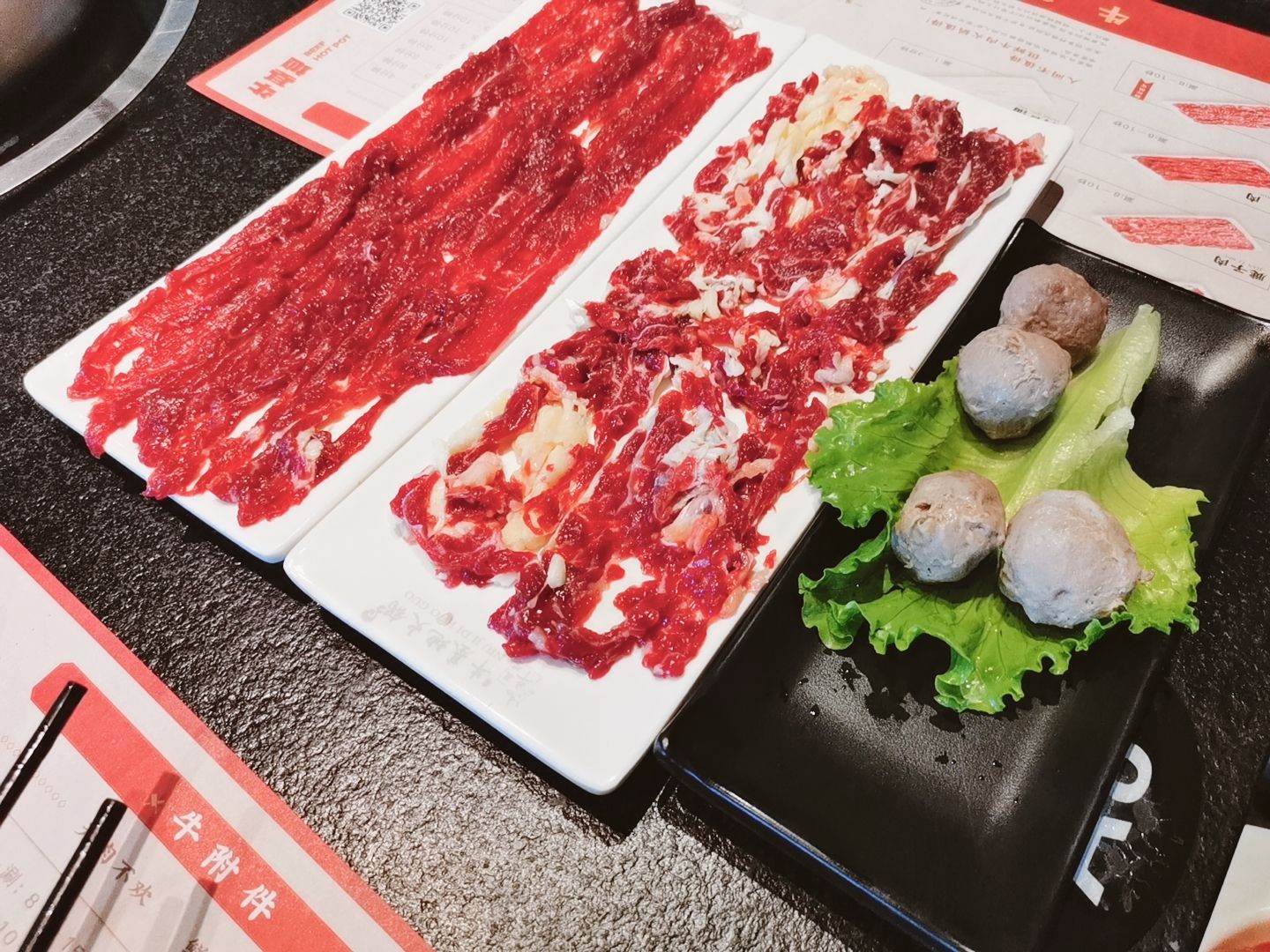 最近一直超想吃牛肉🥩的 于是就带上老公来大吃一顿[鬼脸] ✨✨✨啊,满足[加油] |吊龙^|嫩肉^都超好吃的哎 还有|炒河粉^很入味,我好喜欢这个主食 [耶]竟然在这里吃到了我想了好久的绿茶饼哎 🔔🔔到店后下单一定要快准狠,真的,我们选完后有两个菜都售罄了,就是虾滑和那个双拼锅,所以没吃到这两个😭😭,我下次去一定要点这两个的 [服务铃]服务: 服务态度很好,服务员中途还过来帮忙涮肉,哈哈,解放我的双手,让我认真吃吃吃