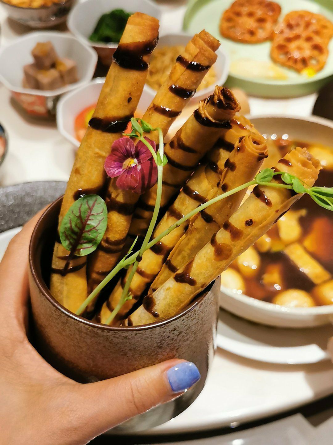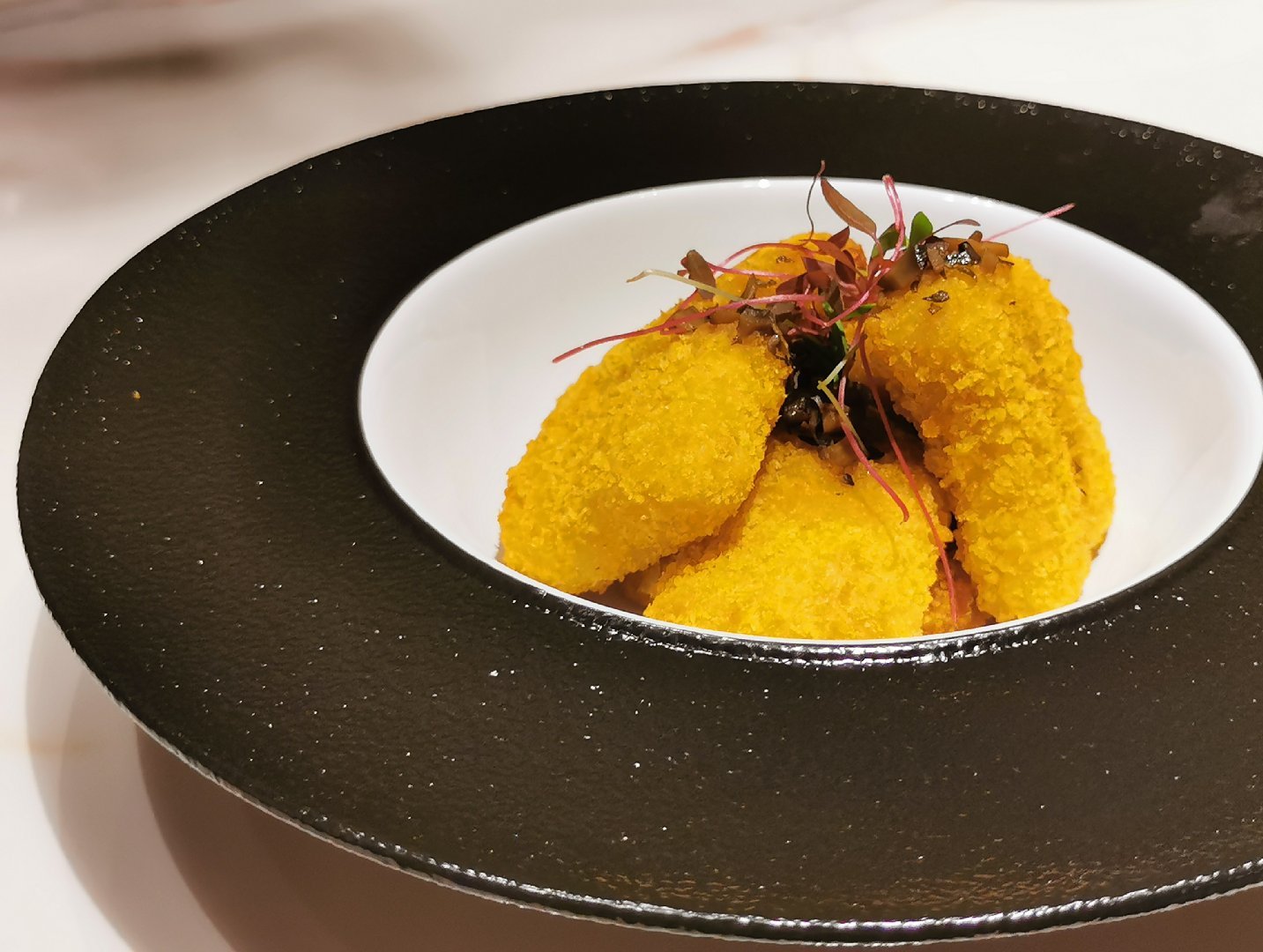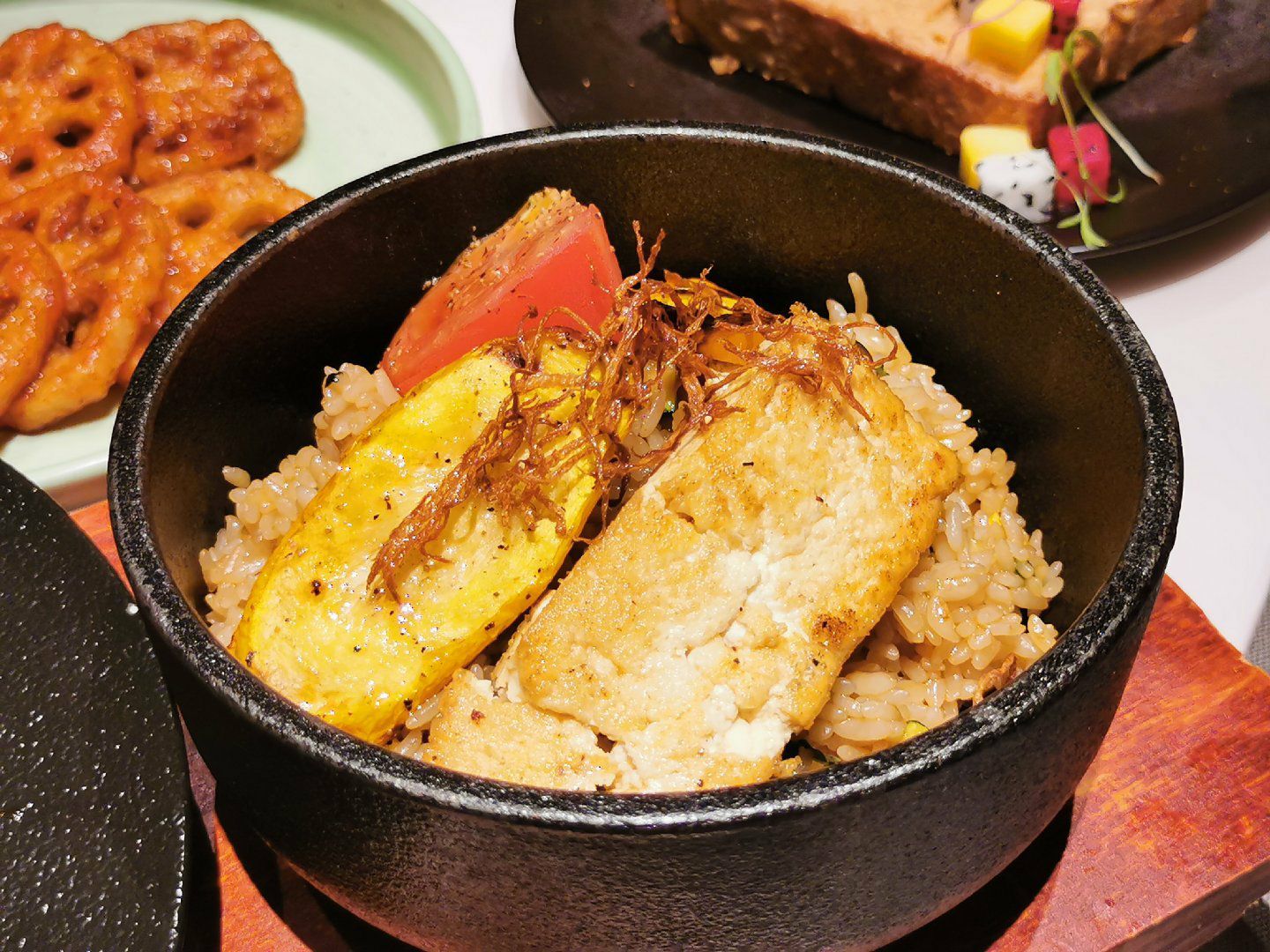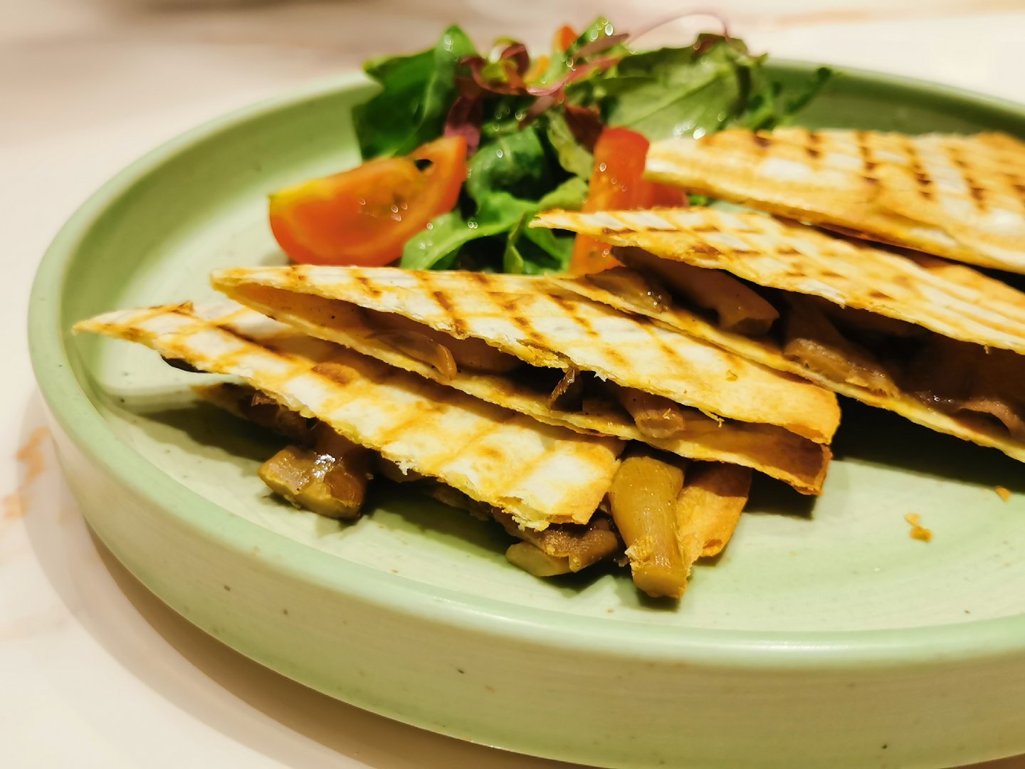慈悲在心,多吃素食。在我心里,庆春食堂很像一个“无国界”餐厅,从传统中餐、到西式料理、到下午茶甜点,应有尽有。 烤南瓜 太!好!吃!了!又香又甜!我爱了。而且摆盘非常讲究,对于我这种强迫症来说,特别舒坦。 香草素鸡块 金黄的色泽十分诱人,第一口吃下去真的以为是在吃鸡块呢! 菌菇暖沙拉 大爱的一道菜,颜值极高。一半菌菇,一半沙拉,平分秋色,很喜欢里面的核桃仁。 印度咖喱薄饼 饼又脆又薄,和咖喱搭配棒极啦,口感很美妙。