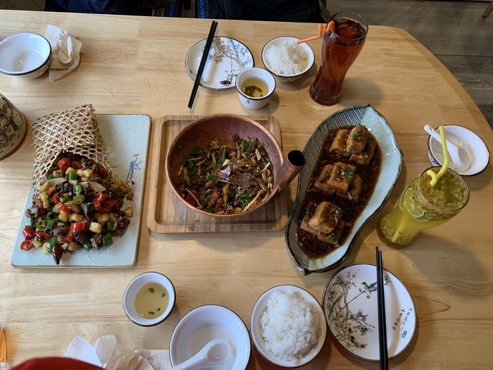 来丽江古城玩当然要尝尝当地的特色的菜,所以在古城里面逛逛吃吃。古色古香的小院,种了许多花花草草,门口就有菜品介绍,看看就就进去吃了。有一个眼睛超漂亮的小姐姐,特别的热情,超可爱。介绍菜品也是非常的熟练,感受到了丽江人民的热情。包浆豆腐的确非常的好吃,日本豆腐的口感,酱汁配饭也是非常的好吃。火瓢牛肉里面还有各种各样的花,攀枝花也是非常的好吃。白族木瓜鸡是乌骨鸡炒的,口感扎实,酸木瓜非常的酸爽。酥油茶我感觉非常的好喝,一点都不涩。