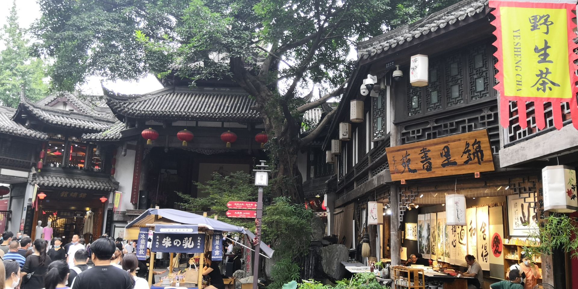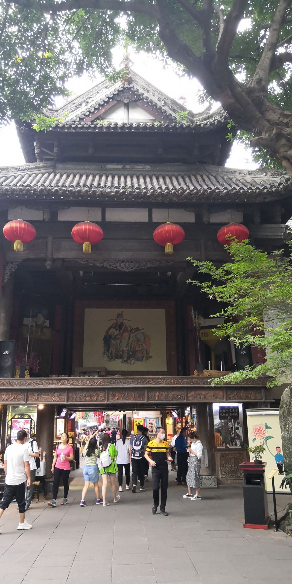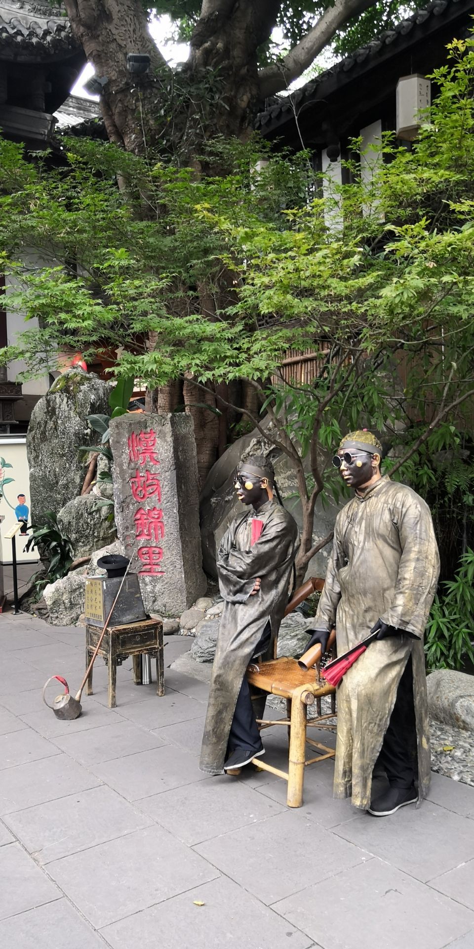 锦里古戏台位于古街区中心位置,旁边有一书屋,前面有一开阔地带。旁边也有许多餐饮小铺。游客至此,可在此买些风味小吃,休息休息。戏台约在离地面二米处,是古代舞台风格,站在远处的观众也可欣赏到台上的表演。可惜的是我们来时,并无节目上演,只能看看建筑本身。所幸台前开阔处,有两位青年演员穿了古装,脸部涂成古铜色,进行茶文化表演,也算小有所补了。