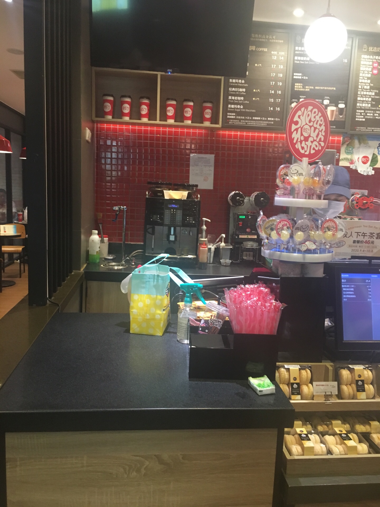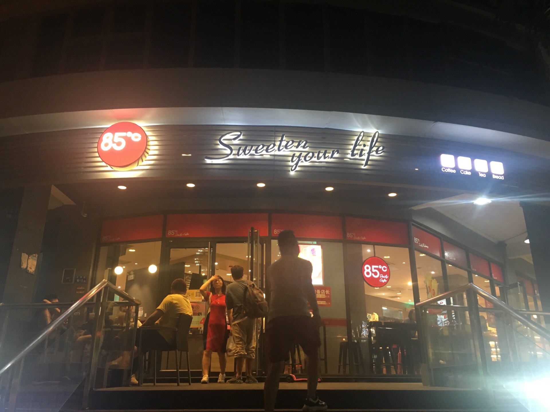 江头的85度位于江头台湾街菜市场的对面,十字路口,很容易找到。因地点好,生意一直很兴隆。 前面是销售区,后面是面包制作区。进门的右手边,陈列的是当日新鲜出炉的面白,品种很挺多的,总有一款适合你的。正面是蛋糕和甜点区,造型可爱,很让人有品尝的冲动。收银柜台与饮品制作区连为一体,咖啡的香气始终弥漫着整个店铺。 店里有喝饮料吃甜点的地方,如果是烟民,就需要到外面去抽烟了。不少人,在这来一杯饮料,聊聊天,玩玩游戏。