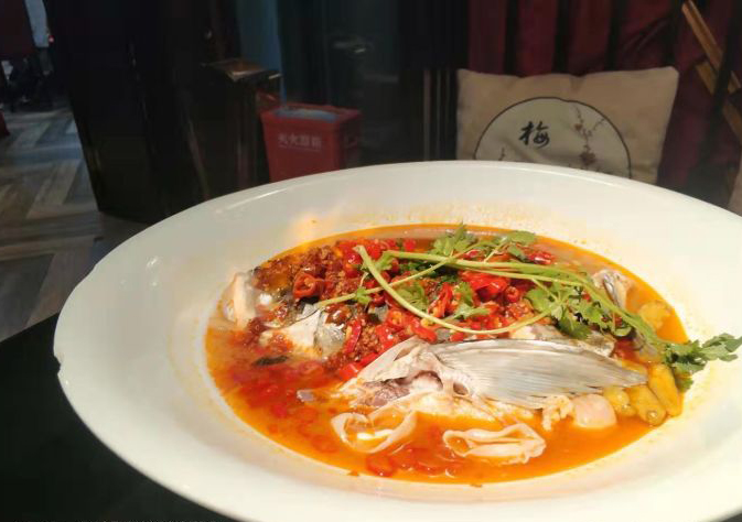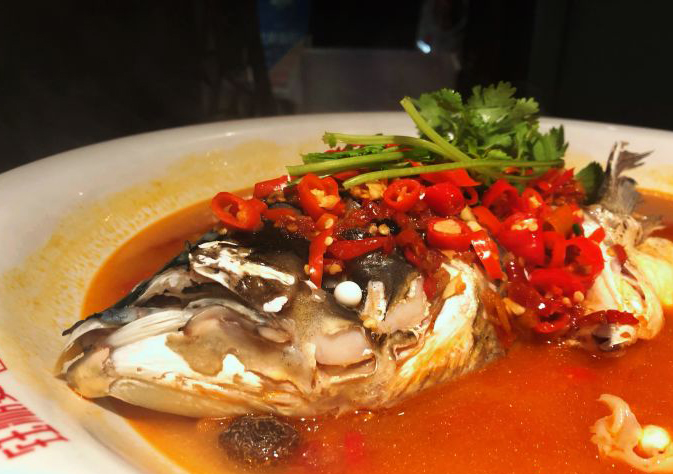 位于王陵公园内,环境优美,挺幽静,根据点菜员推荐点了个肉炒肉、板栗烧牛排、流沙包,肉炒肉很下饭,板栗烧牛排要是板栗再烂一点就好了,流沙包皮薄汁多,好吃,装鱼头的是一个很大的瓷质的盆子,把做好的鱼头放进去 红色的汤汁上铺着一层剁辣椒和湘菜 看起来已经很有食欲了,然后服务员会在鱼头上洒 上高 度摆酒然后点火,整个就是火焰剁椒鱼头了 配上一句“祝各位鸿运当头”真的是仪式感满满