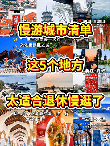 慢游探寻 | 退休后的悠闲生活,这5个地方太适合了🌿 终于可以远离“打卡式”旅游,找个能慢慢享受的地方,轻松度过退休后的生活了。今天我分享五个适合慢慢逛的城市,让人心情愉悦,生活也倍感精彩。 1️⃣ 云南·大理 大理四季如春,生活配套成熟,古城与洱海相拥,适合长住的客栈星罗密布。这里不需要赶景点,漫步在苍山和洱海之间,逛一逛本地的菜市场,偶尔坐在咖啡馆发发呆,享受生活的惬意。🌊 💡 小贴士:可以选择在洱海边的才村或龙龛码头附近找一间民宿,住上一周,清晨看海鸥,傍晚看霞光。抓住机会体验一次白族扎染,感受那份手工的魅力。 2️⃣ 浙江·嘉兴 相比乌镇和西塘的喧闹,嘉兴的月河历史街区、梅花洲和新塍古镇更保留了淳朴的生活气息。这里的消费也很亲民,一碗热腾腾的馄饨,搭配一壶清茶,可以让你在水边悠闲地度过整个下午。🍵 💡 小贴士:春秋季节最为宜人,别忘了乘坐一次水上巴士,从当地人的角度欣赏城市风光。尝试一下真正的老式粽子,临走时带点杭白菊回家。 3️⃣ 四川·青城山 青城山被誉为“天下幽”,环境宁静宜人,负氧离子丰富,特别适合我们的慢节奏。山势不陡,轻松徒步就能上山,山脚与前后山周围有许多隐秘的民宿,许多还提供三餐,极省心。🍃 💡 小贴士:建议选择住在后山的泰安古镇,生活更宁静。和当地人一起在山泉边打水泡茶,体验道家的“呼吸吐纳”。别忘了尝试白果炖鸡,滋味无穷。 4️⃣ 广西·涠洲岛 涠洲岛没有三亚的热闹与高价,依然保留着原始的火山岛气质和朴实的渔村氛围。你可以租辆电动车,花上一周时间环岛,去各个不同的海滩捡贝壳,欣赏绚丽的日落。🏖️ 💡 小贴士:避免在节假日上岛,推荐在滴水村或贝壳沙滩附近找个住所。另外,要记得和渔船出海体验海钓,品尝最新鲜的海鲜,绝对会让你回味无穷。 5️⃣ 福建·泉州 泉州被联合国认证为“世界遗产城市”,这里的生活烟火气息和闲适氛围交融。特别适合喜爱历史与文化的人。在老城区,寺庙、教堂与清真寺往往在同一条街上,漫步博物馆,听南音,看木偶戏,每天都会有新发现。🎭 💡 小贴士:建议住在西街附近,这样步行就可以探索大部分古迹。泉州的美食也是一大亮点,面线糊、姜母鸭、石花膏等,完全可以专门为美食制定一条路线。 这5个地方都散发出独特的魅力,适合退休后的悠闲生活,慢慢享受人生的每一刻吧!✨