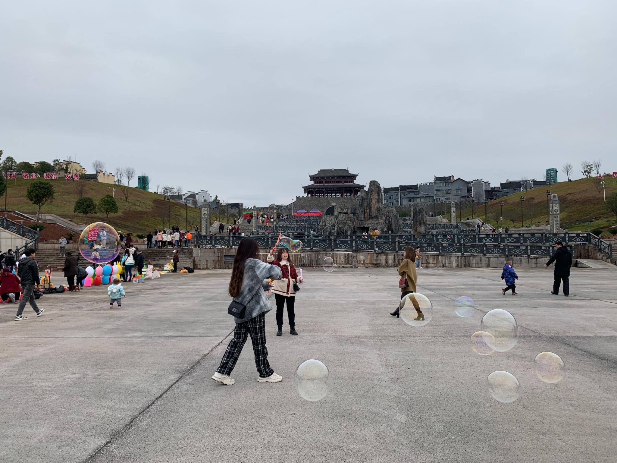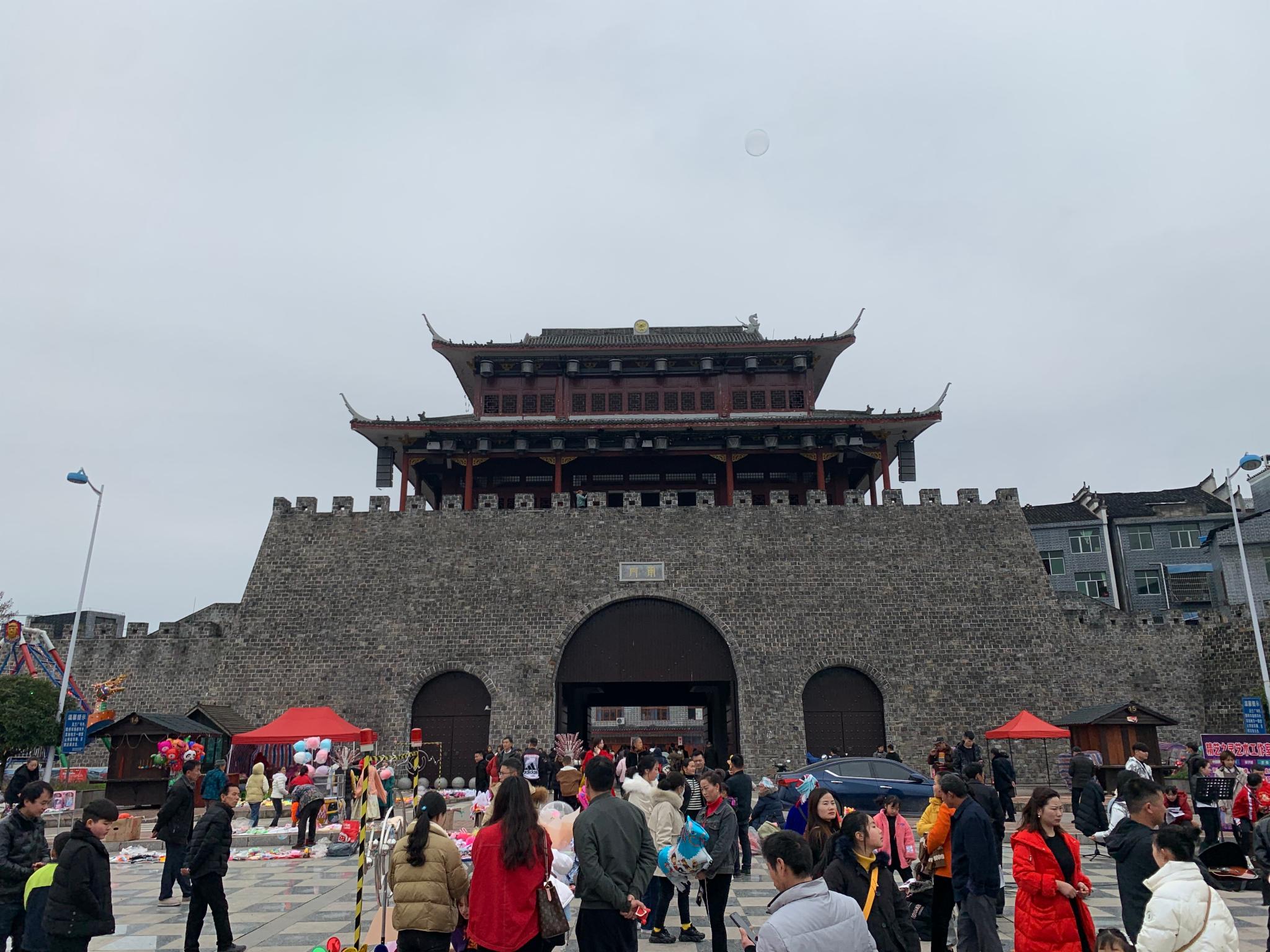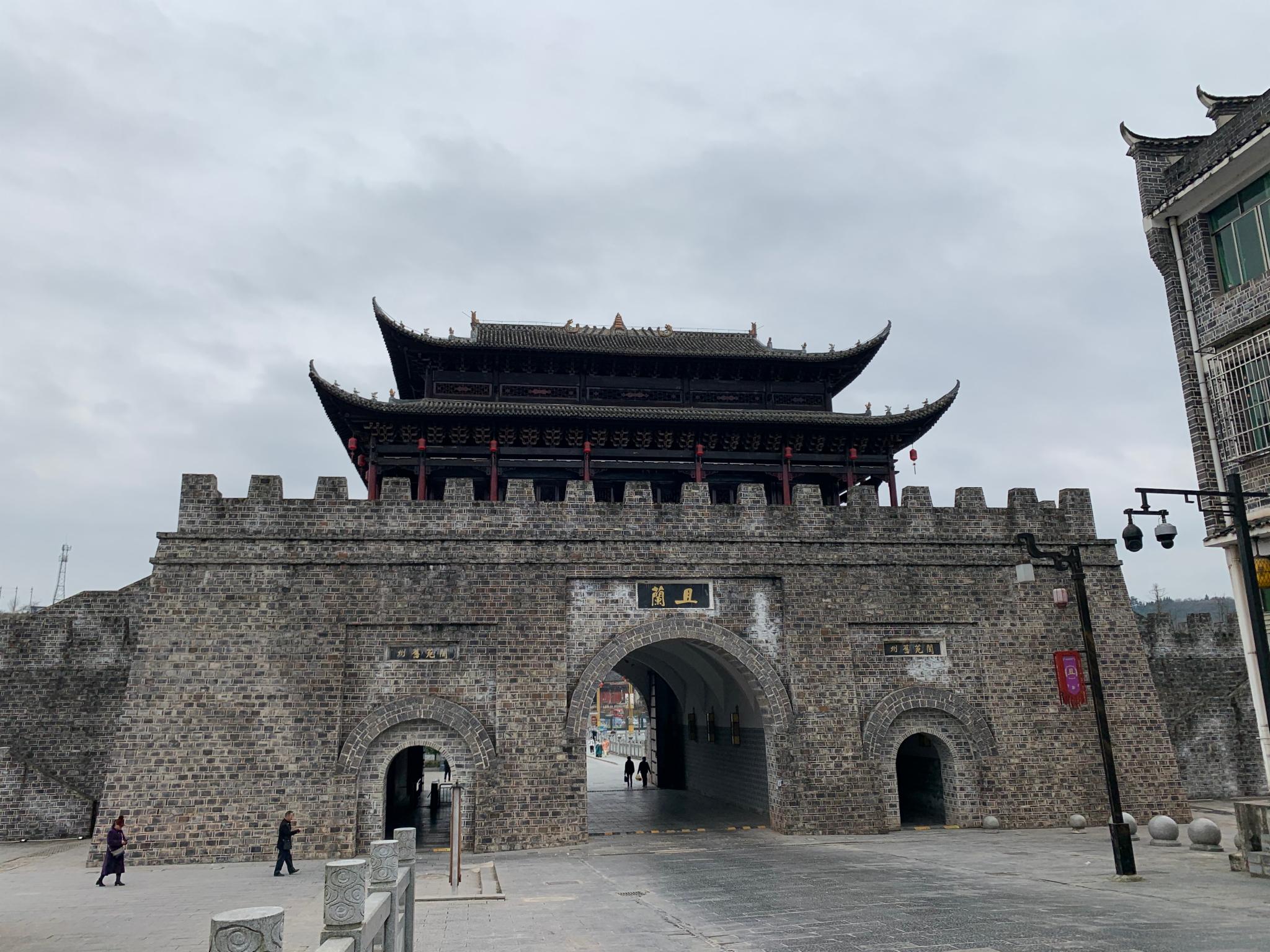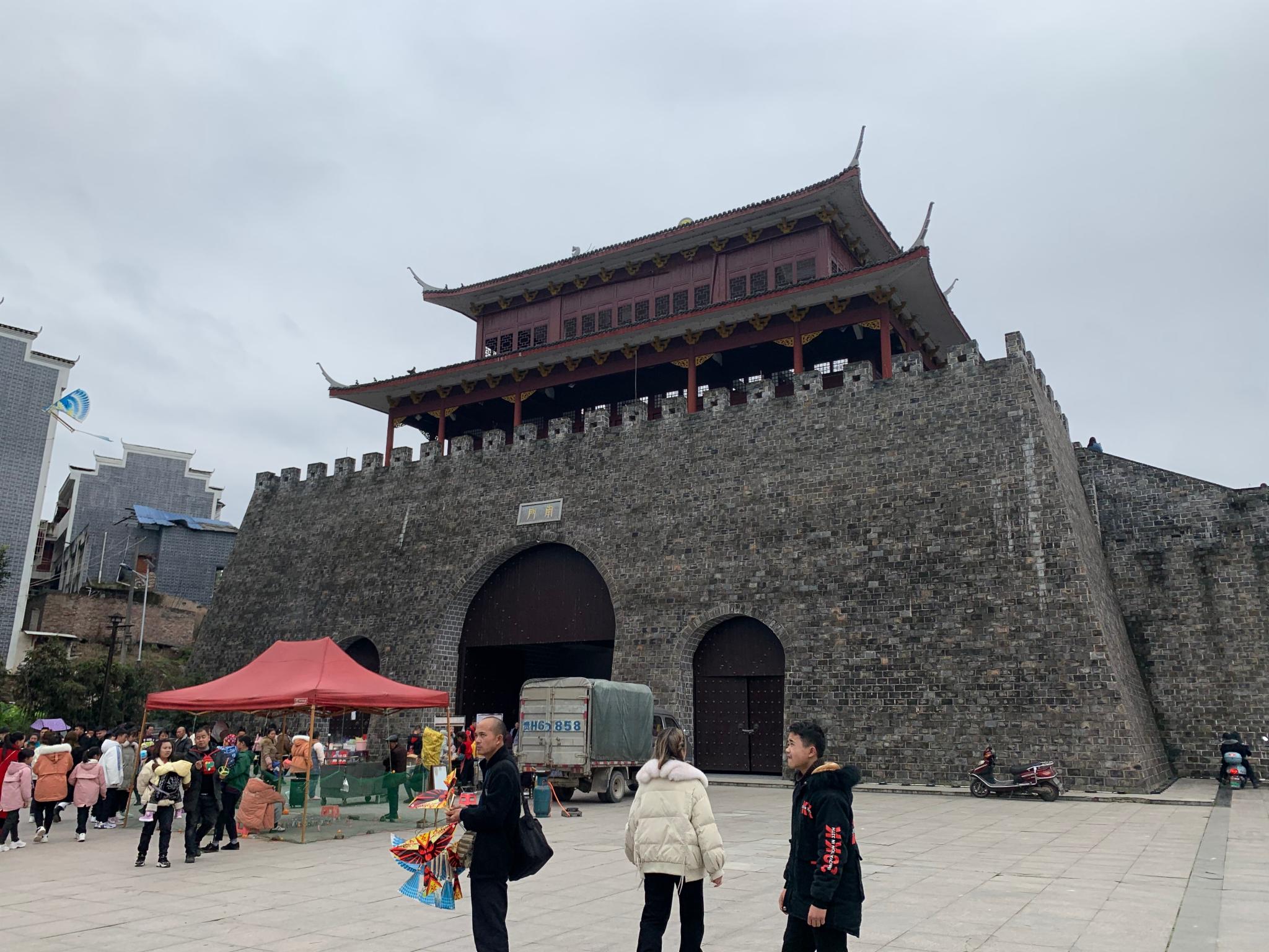 旧州古镇也叫且(ju)兰古城(因在周、春秋战国时为“且兰”国古都),正门城楼修得十分霸气,台阶之下有很大的广场,但是商家搭的帐篷五颜六色,比较凌乱,影响了整体的美观。