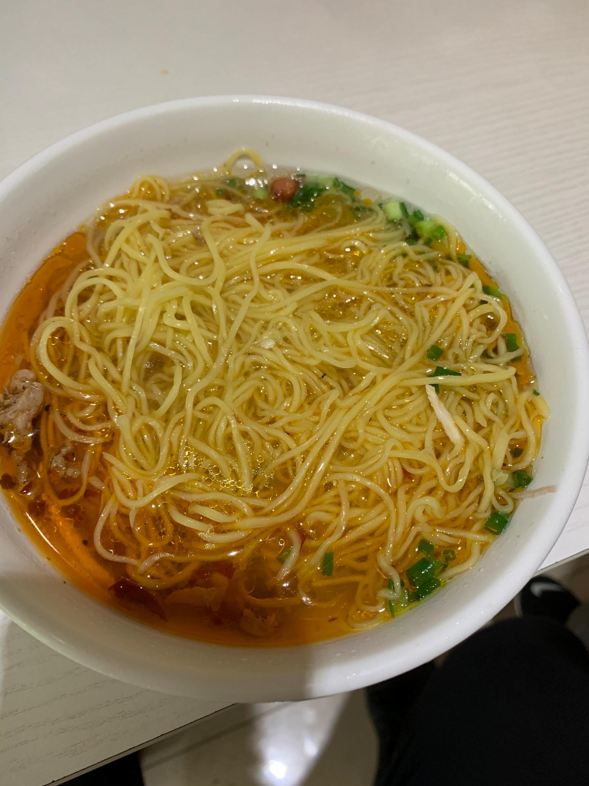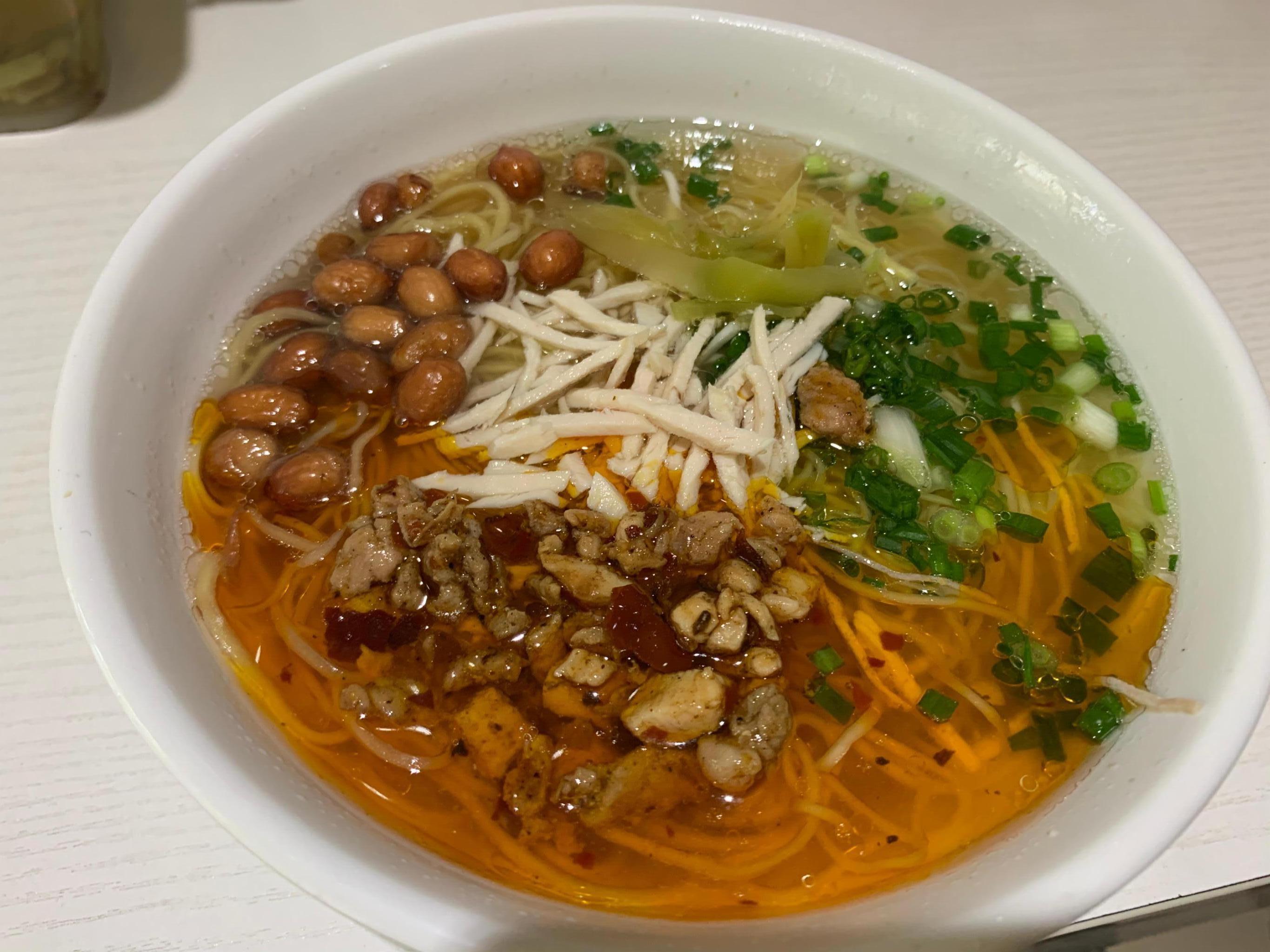 2、面好汤靓:本着只是尝味道,不是管饱的目的(因为还要尝别的本地特色小吃)。点了两份招牌小碗的面。等了大概五分钟抬上来,虽然是小碗,但分量不错,佐料有肉丝,榨菜,花生,肉丁等简单且常见的几种。心想,就这敢卖这么贵?难道是徒有虚名吗?但当我用嘴巴验货的时候,发现我错了,推翻了我之前的所有臆想。面非常有嚼劲,还略带脆感(不是贵阳肠旺面的那种硬),类似于广东竹升面的口感。面细,吸收了饱满的汤汁,可以尝出是原味地道的鸡汤,汤汁清亮。口味微辣,里面有少许的辣椒油,就是这样一碗简单清爽的面彻底征服了我!就一个字,值!