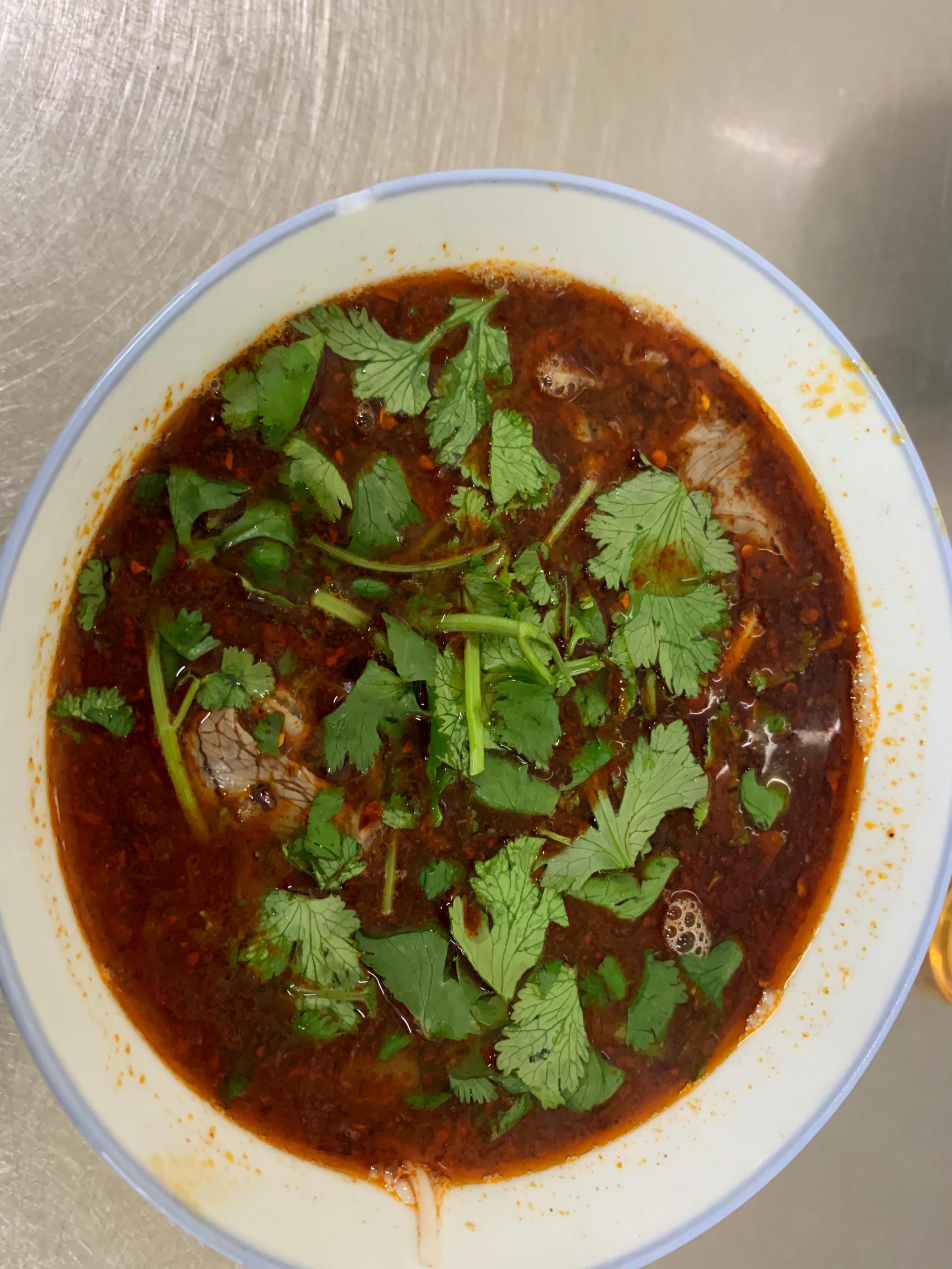 老板一口地道的遵义口音,让人比较诧异,难不成要做成遵义的风格?吃下第一口,果然是遵义羊肉粉的风格,只是膻味稍微要淡一些。关键辣椒是粉末状的,和印象中的六盘水羊肉粉不一致。但不可否认的是,汤头确实鲜香,羊肉味儿十足。但是辣椒非常地辣,连我这样号称吃辣很厉害的人都有点受不了,大家一定要慎重选择辣度。